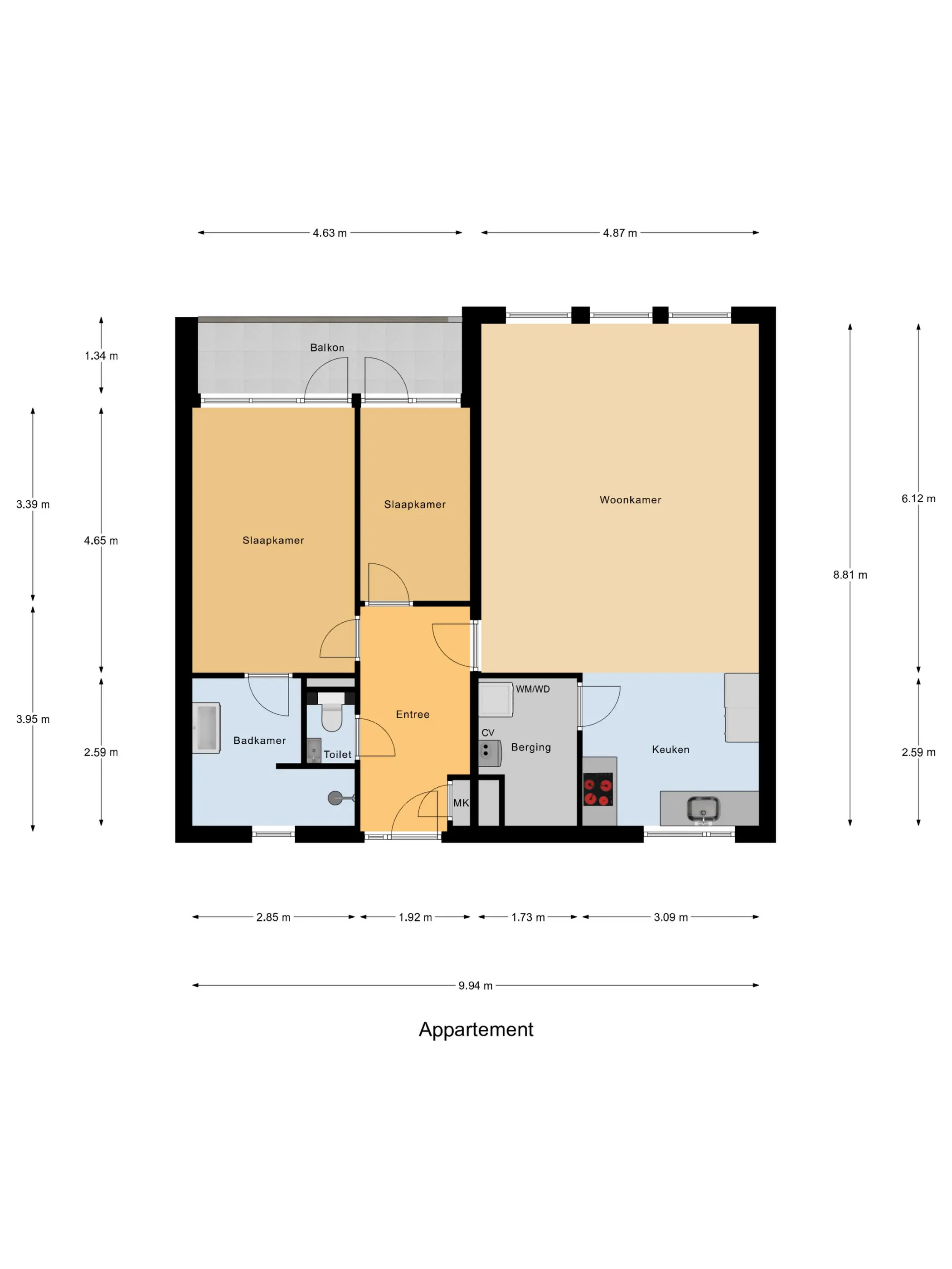 Het appartement beschikt over een lichte woonkamer met prettige leefruimte, een moderne keuken, twee slaapkamers, een ruime badkamer en balkon.