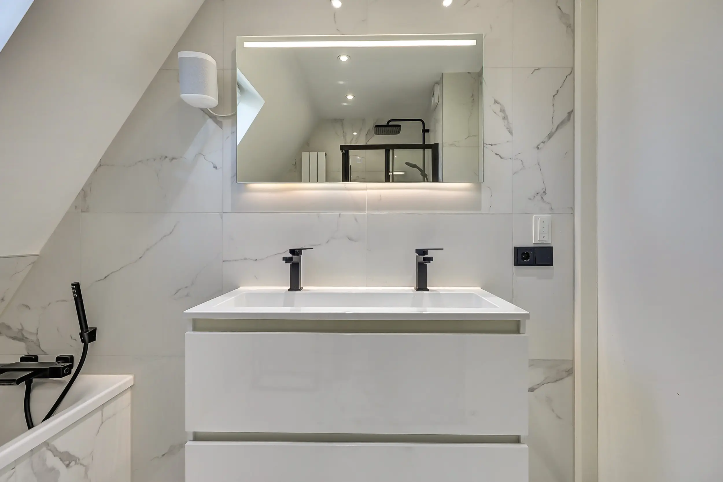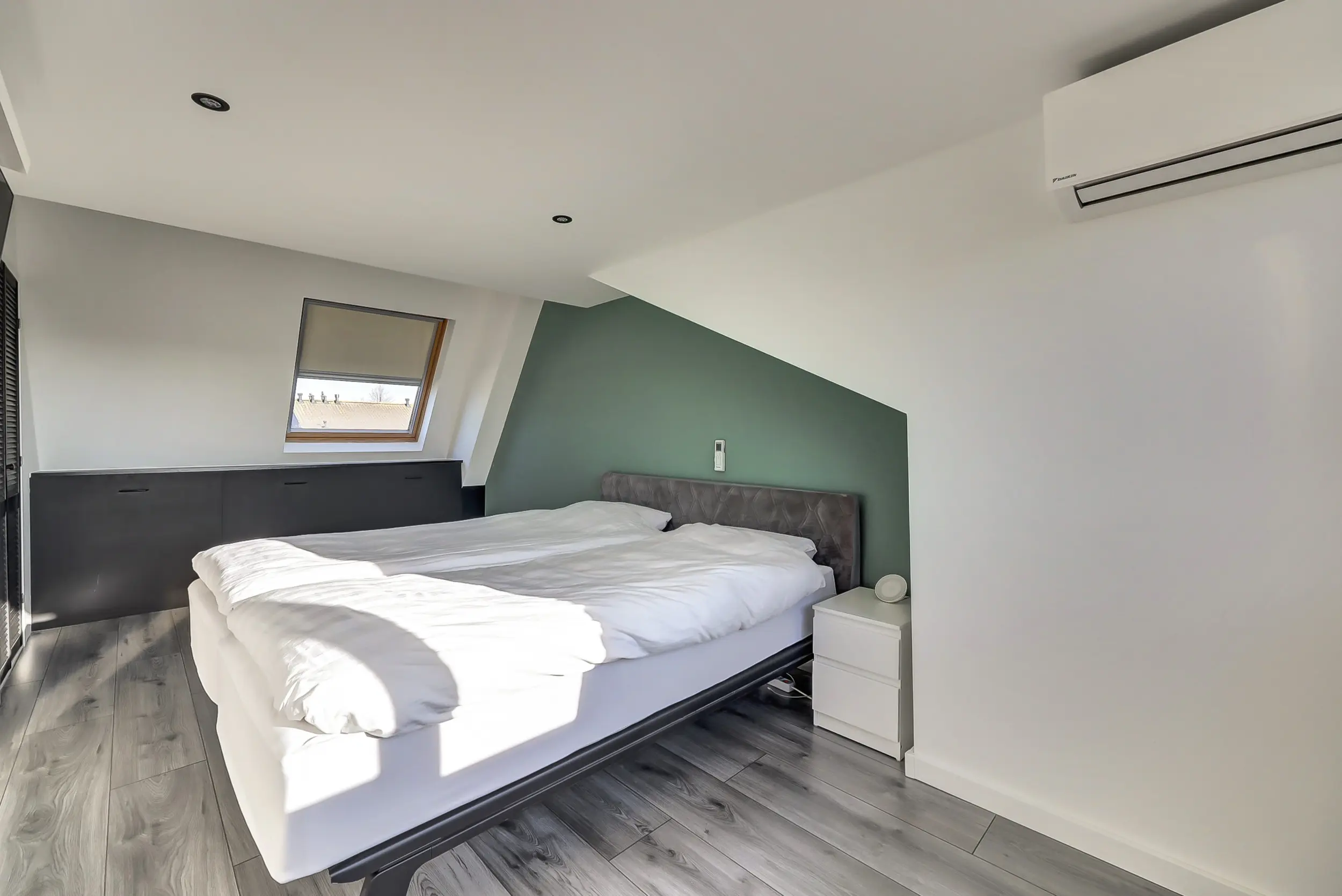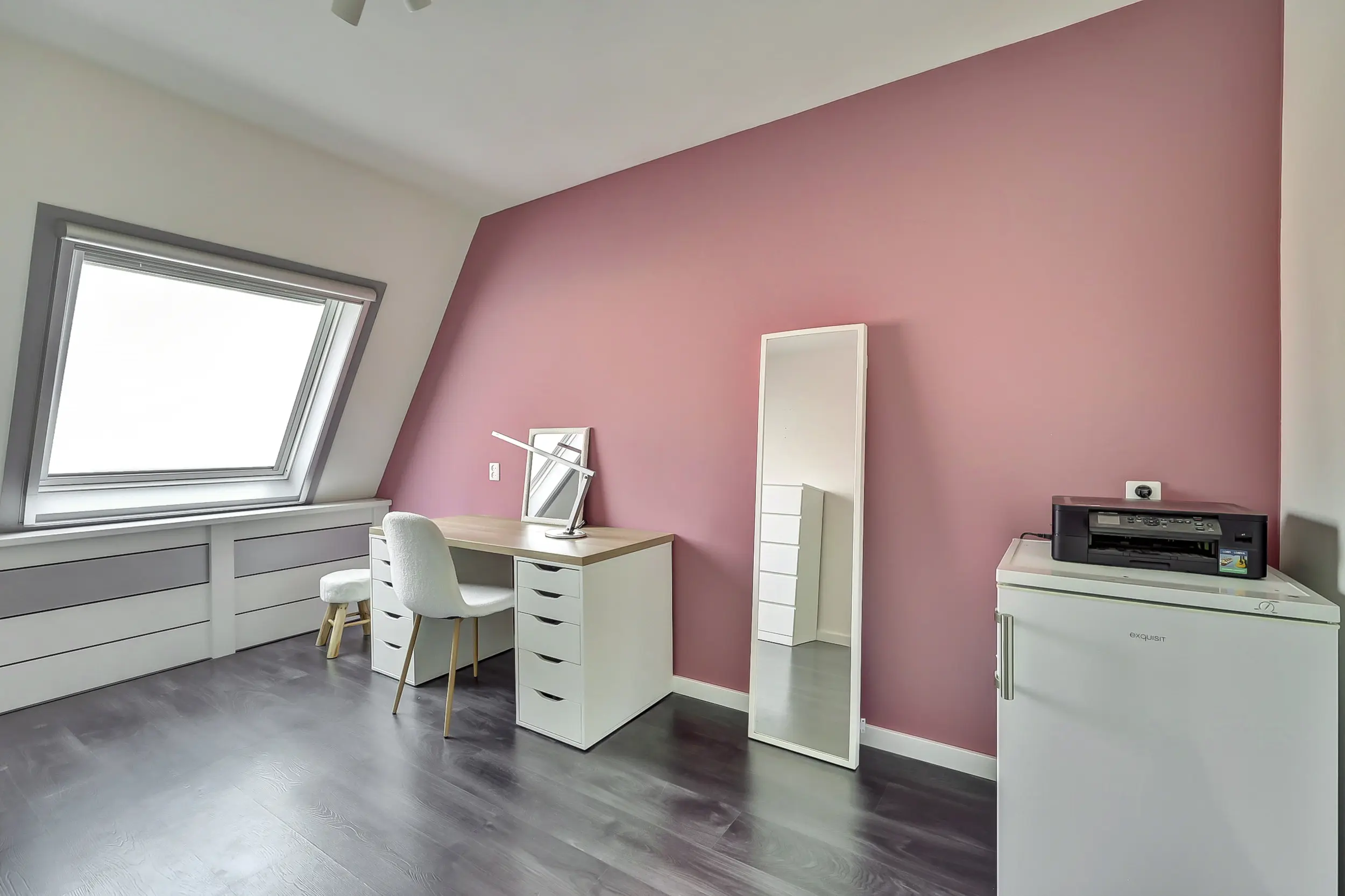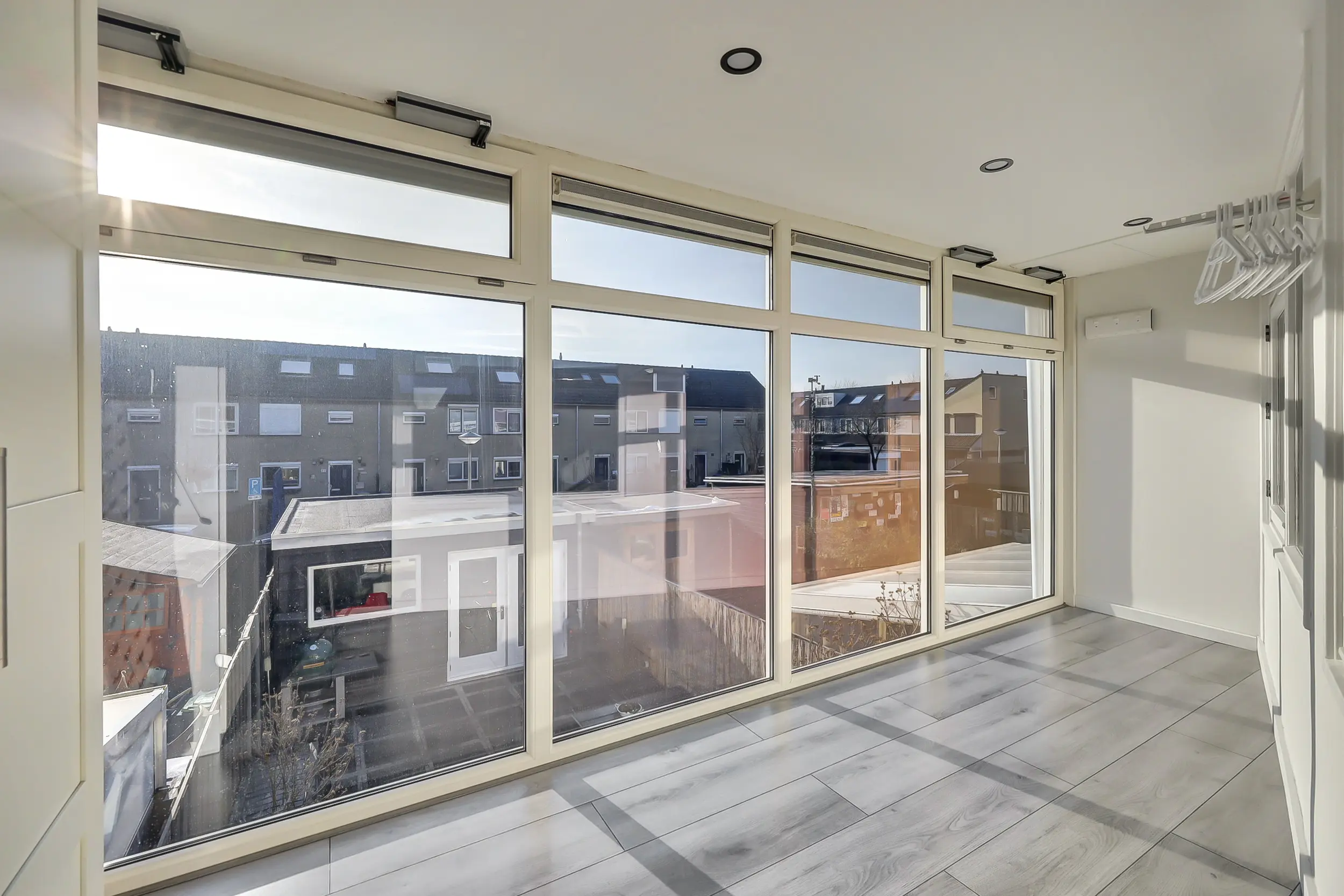 Overloop. Ook op deze verdieping is laminaat geheel doorgelegd zonder drempels. De eerste slaapkamer aan de achterzijde is thans in gebruik als walk in closet. Tweede slaapkamer aan de achterzijde met toegang tot de was-/droogruimte, maar kan makkelijk gebruikt worden voor meerdere doeleinden, denk aan een kantoor of een speelhoek voor kinderen. De derde slaapkamer is gelegen aan de voorzijde van de woning met een groot Velux dakraam en radiator ombouw. Mooi vernieuwde badkamer in marmer look met elektrische vloerverwarming, een heerlijk ligbad, separate douche met deuren, een mooi wastafelmeubel (2-persoons), handdoekradiator, verlichte spiegel en spotjes in het plafond. Tevens is gezorgd voor mechanisch afzuiging.