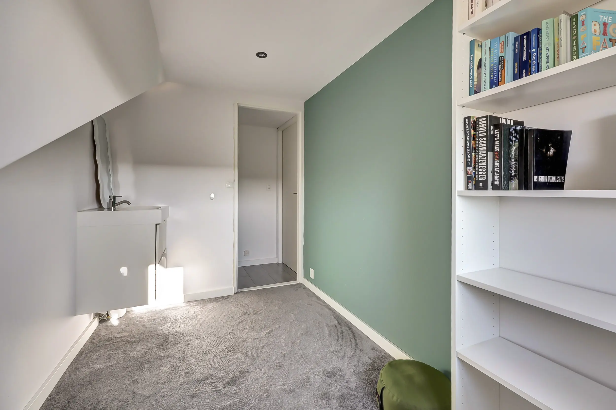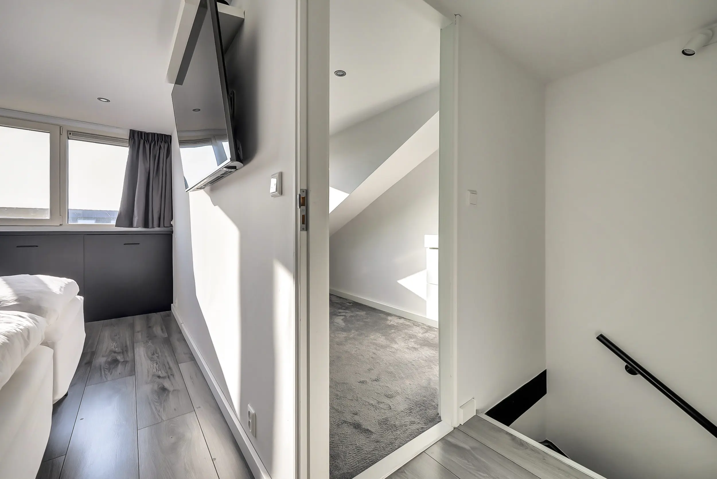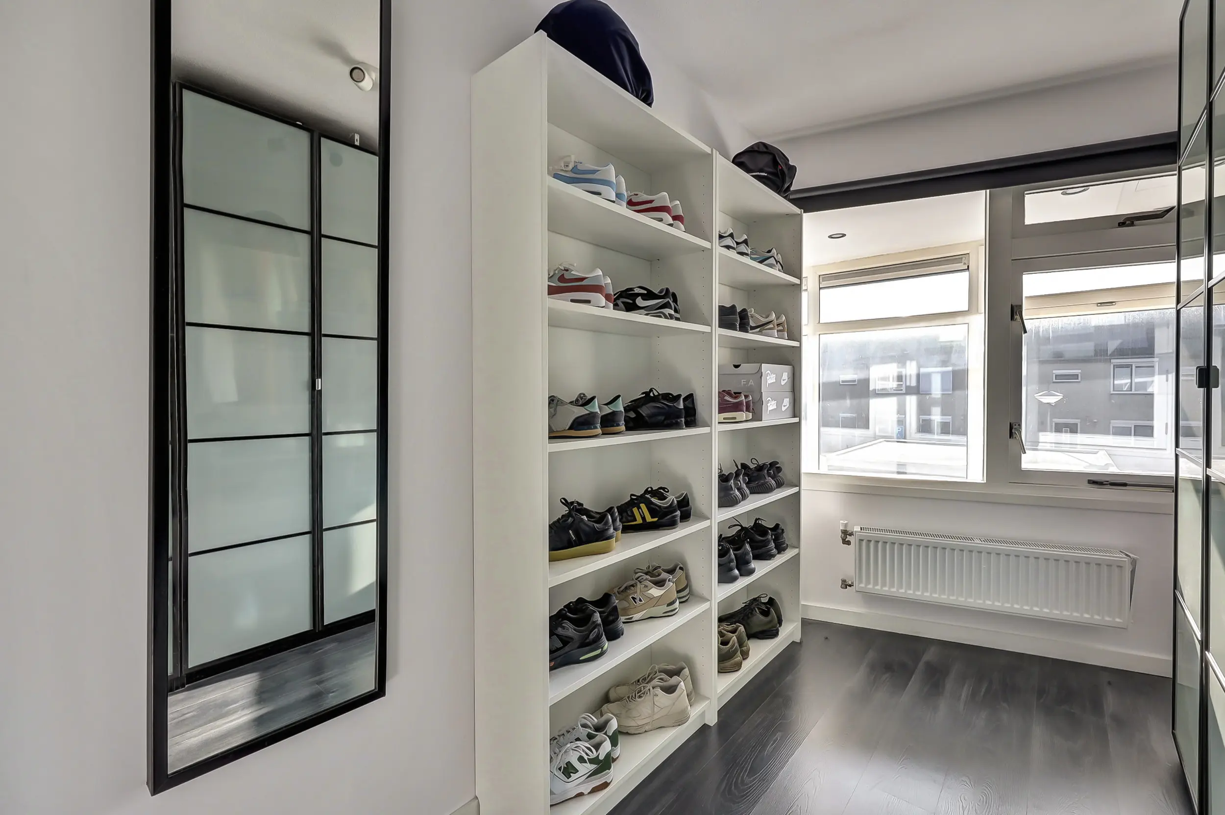 Overloop. Ook op deze verdieping is laminaat geheel doorgelegd zonder drempels. De eerste slaapkamer aan de achterzijde is thans in gebruik als walk in closet. Tweede slaapkamer aan de achterzijde met toegang tot de was-/droogruimte, maar kan makkelijk gebruikt worden voor meerdere doeleinden, denk aan een kantoor of een speelhoek voor kinderen. De derde slaapkamer is gelegen aan de voorzijde van de woning met een groot Velux dakraam en radiator ombouw. Mooi vernieuwde badkamer in marmer look met elektrische vloerverwarming, een heerlijk ligbad, separate douche met deuren, een mooi wastafelmeubel (2-persoons), handdoekradiator, verlichte spiegel en spotjes in het plafond. Tevens is gezorgd voor mechanisch afzuiging.