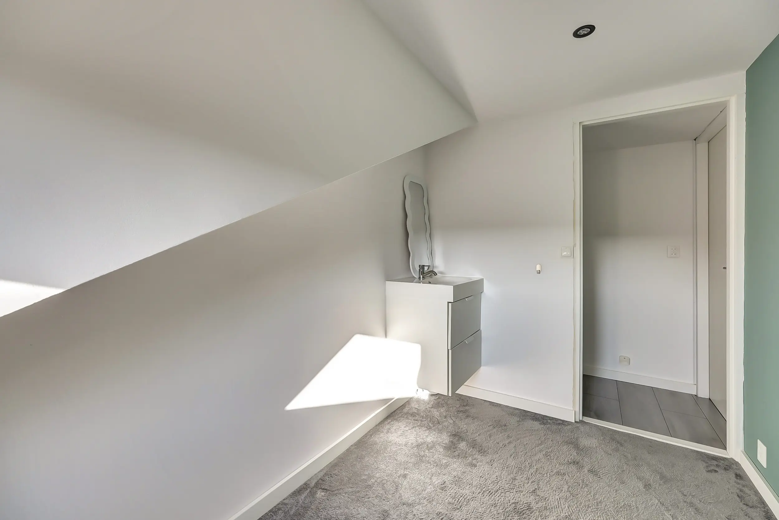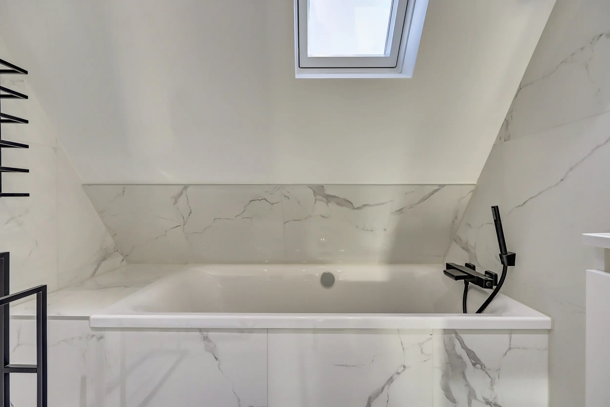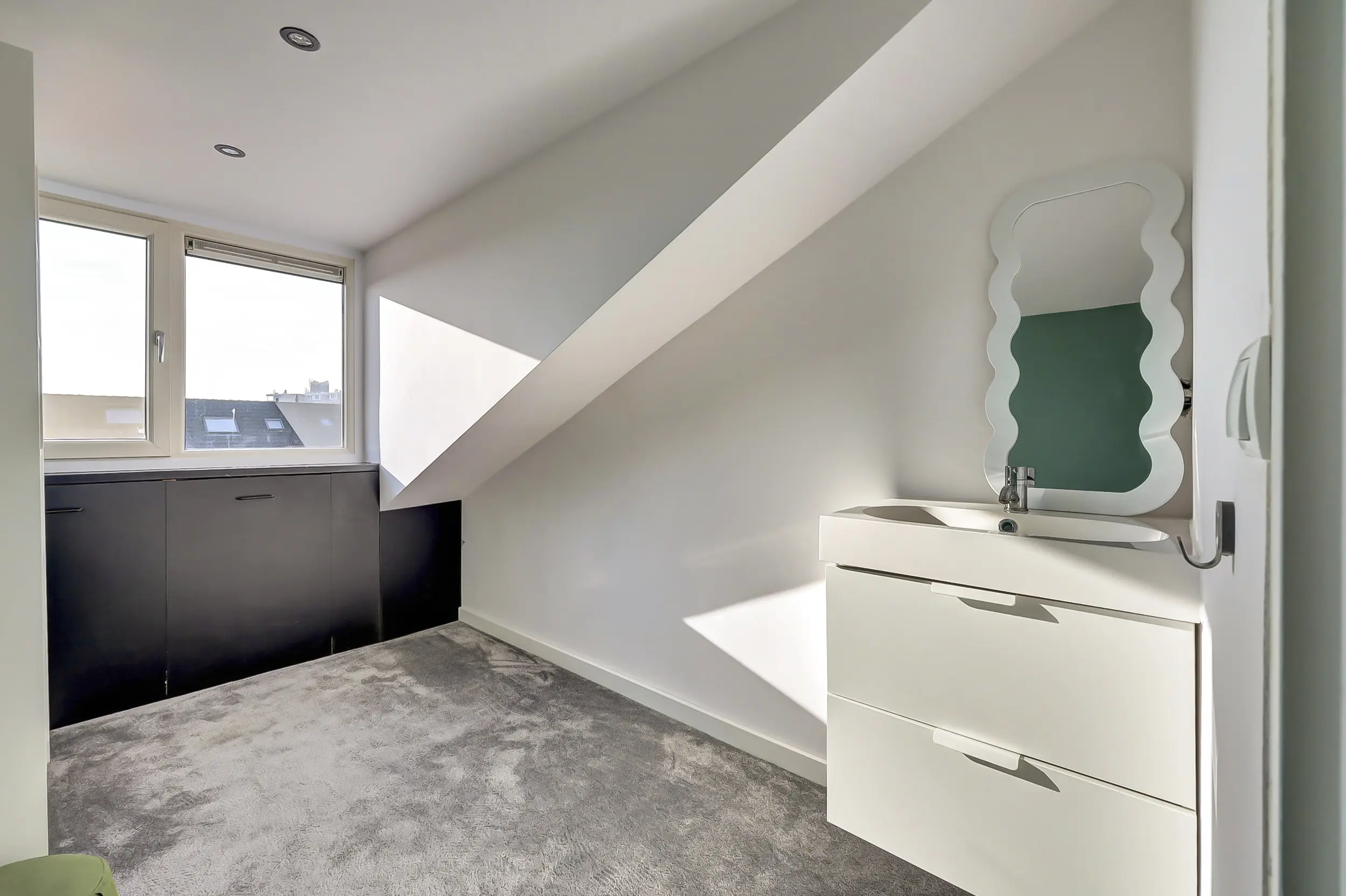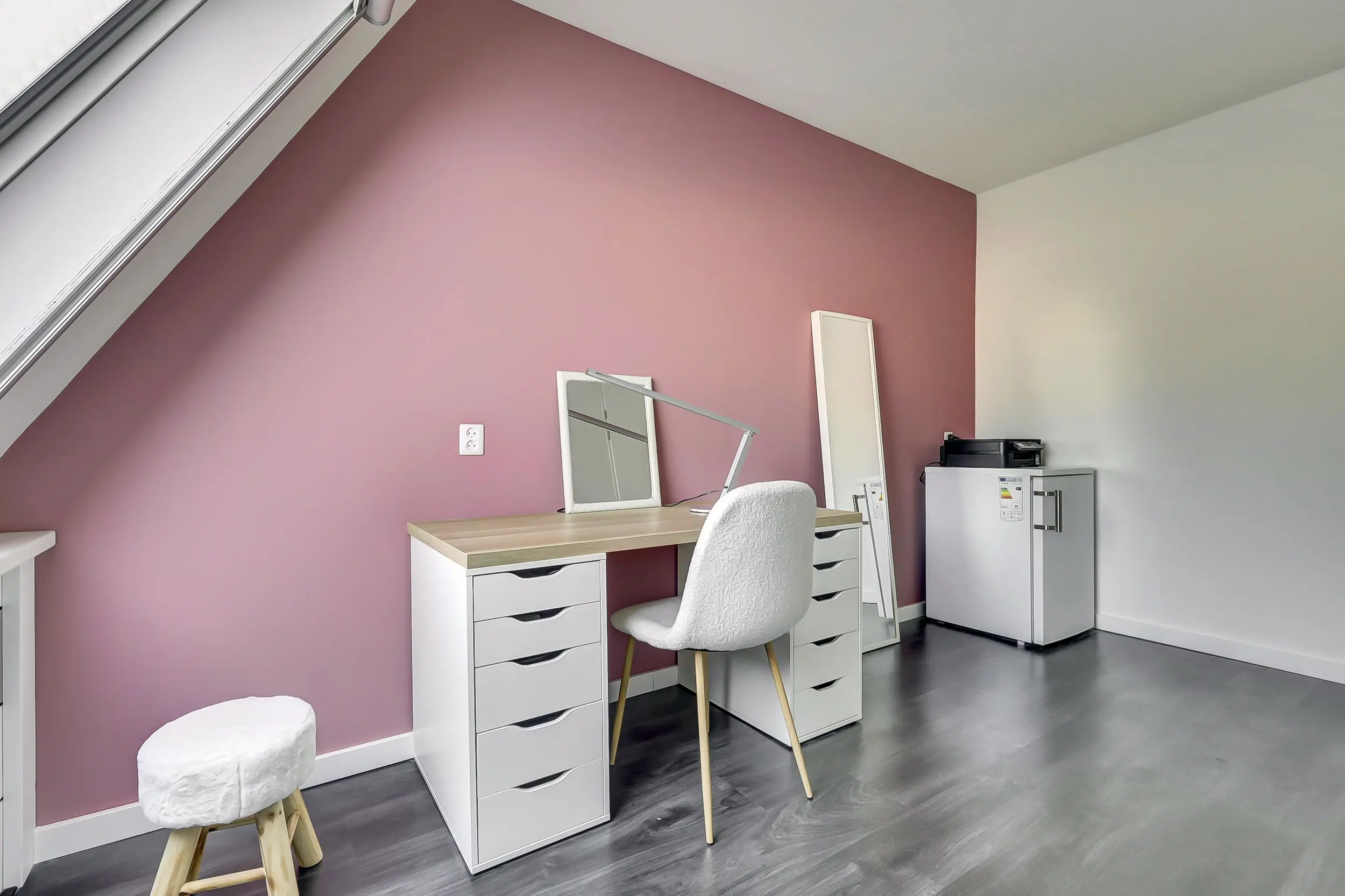 Overloop. Ook op deze verdieping is laminaat geheel doorgelegd zonder drempels. De eerste slaapkamer aan de achterzijde is thans in gebruik als walk in closet. Tweede slaapkamer aan de achterzijde met toegang tot de was-/droogruimte, maar kan makkelijk gebruikt worden voor meerdere doeleinden, denk aan een kantoor of een speelhoek voor kinderen. De derde slaapkamer is gelegen aan de voorzijde van de woning met een groot Velux dakraam en radiator ombouw. Mooi vernieuwde badkamer in marmer look met elektrische vloerverwarming, een heerlijk ligbad, separate douche met deuren, een mooi wastafelmeubel (2-persoons), handdoekradiator, verlichte spiegel en spotjes in het plafond. Tevens is gezorgd voor mechanisch afzuiging.