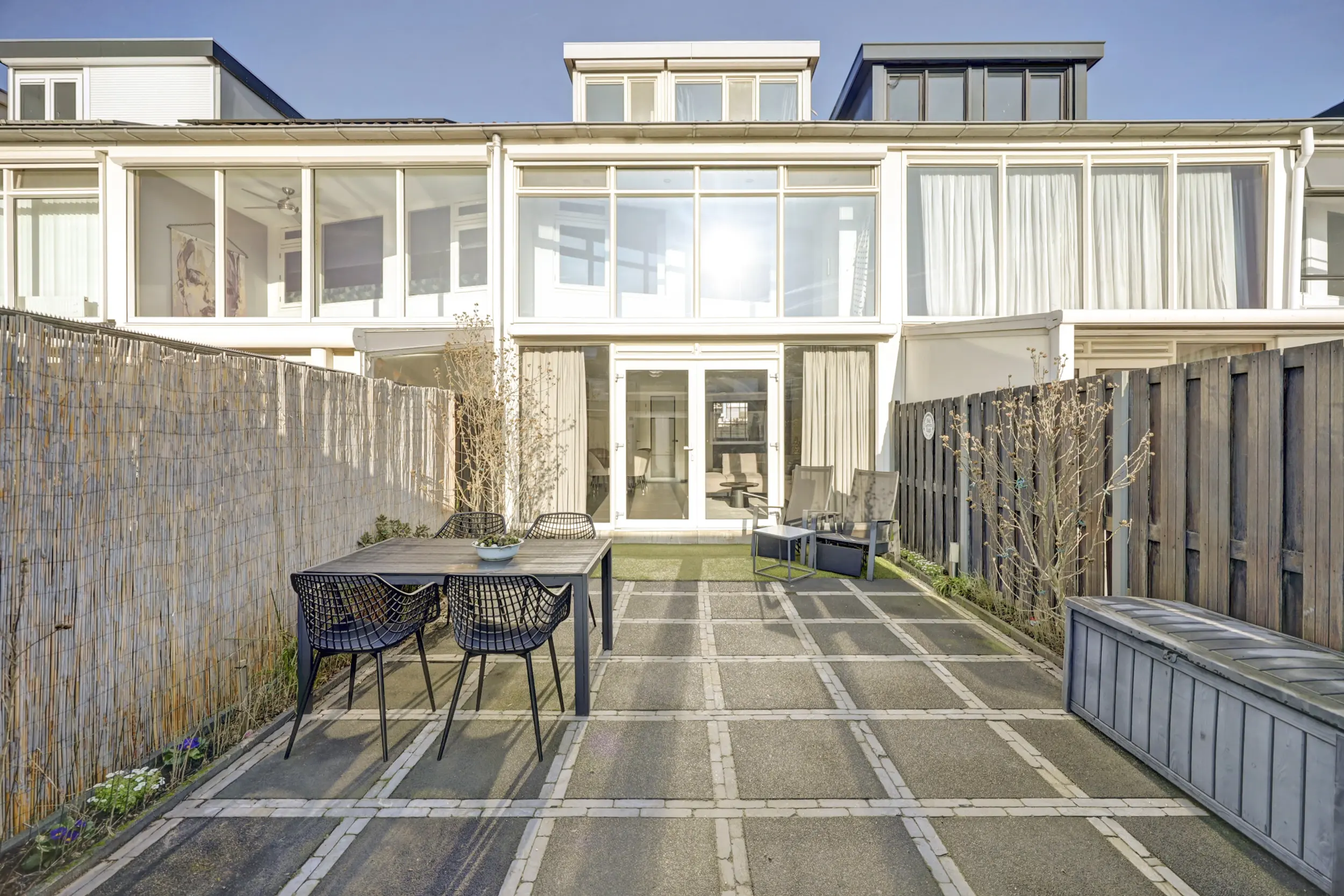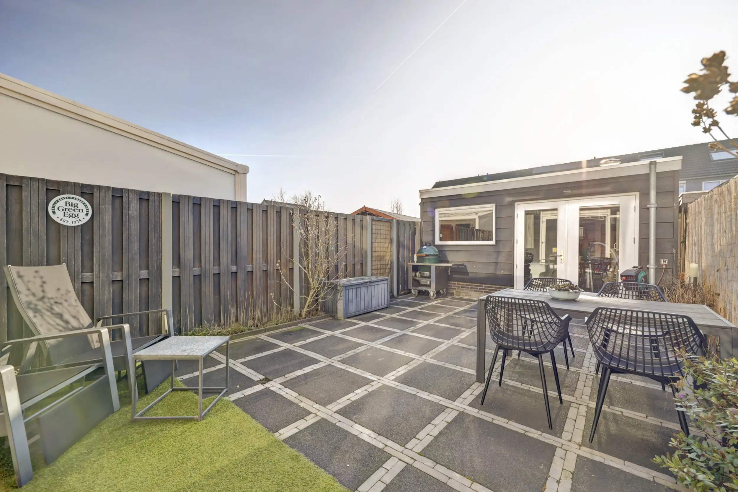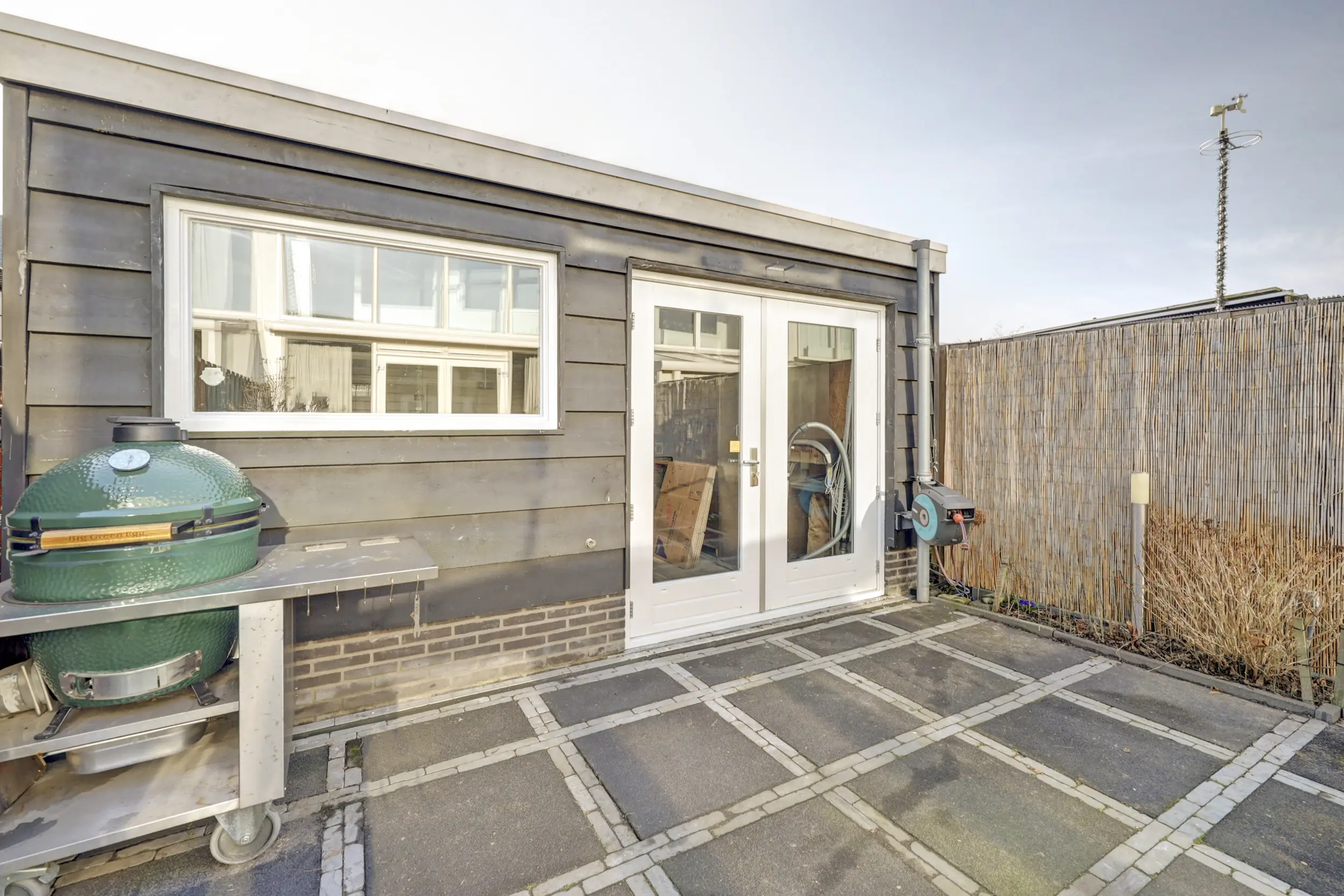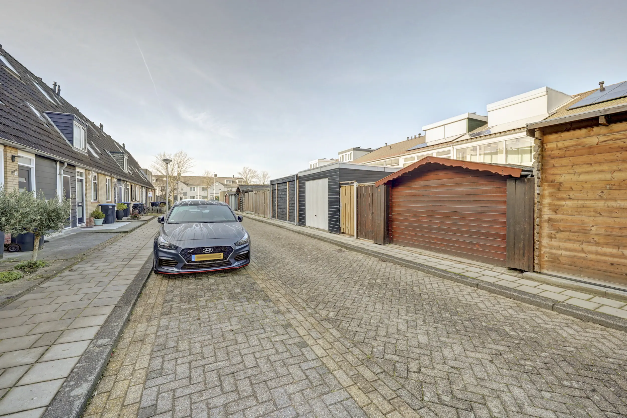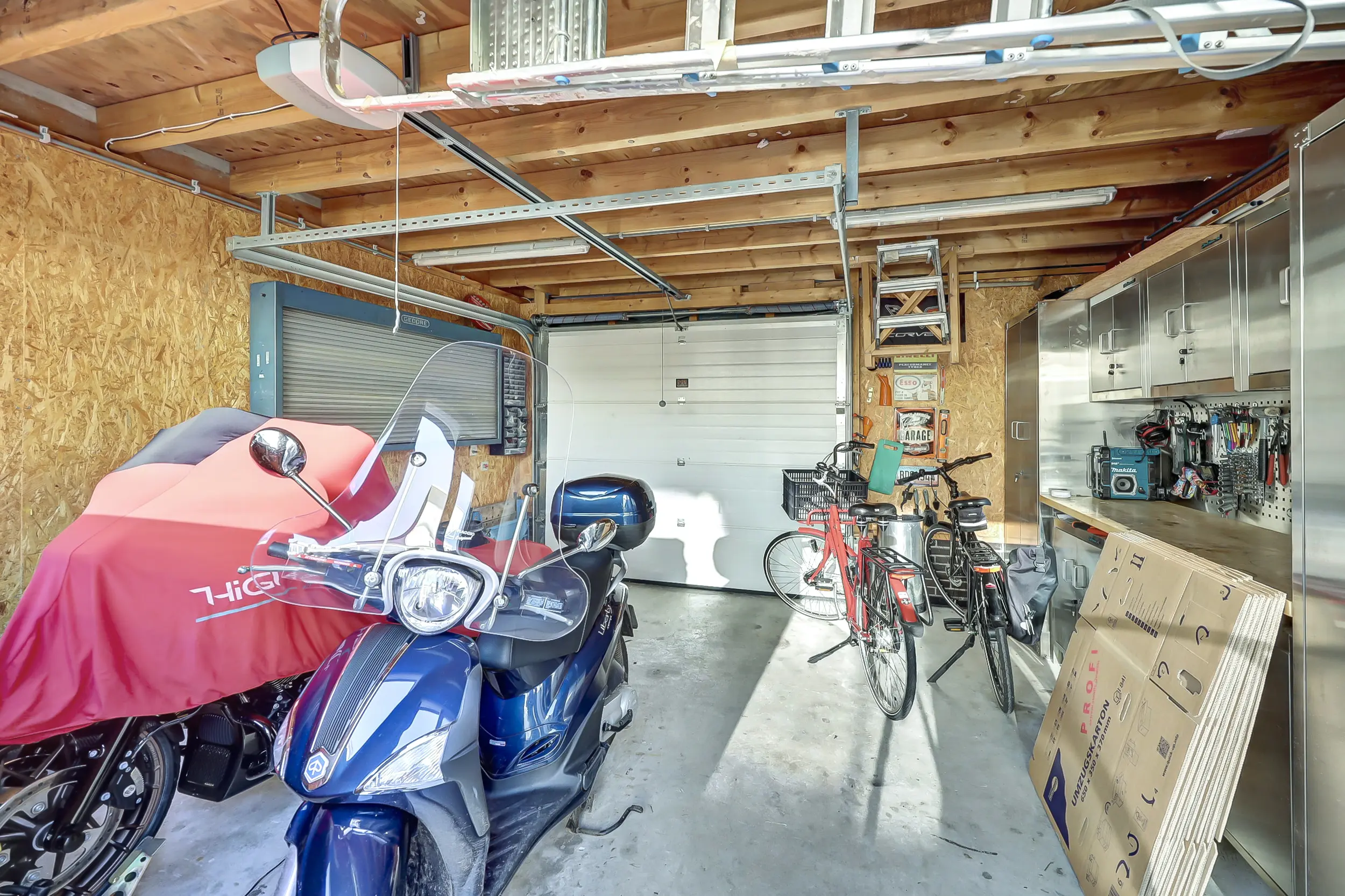 De achtertuin is zonnig en voorzien van bestrating, schuttingen, waterkraan, stopcontacten en een elektrisch bedienbare zonwering. Toegang tot de zelf opgebouwde garage middels openslaande deuren aan de tuinzijde en elektrisch roldeur naar de uitweg. De garage heeft een betonnen vloer, elektra, verlichting en houten kozijnen met dubbel glas.