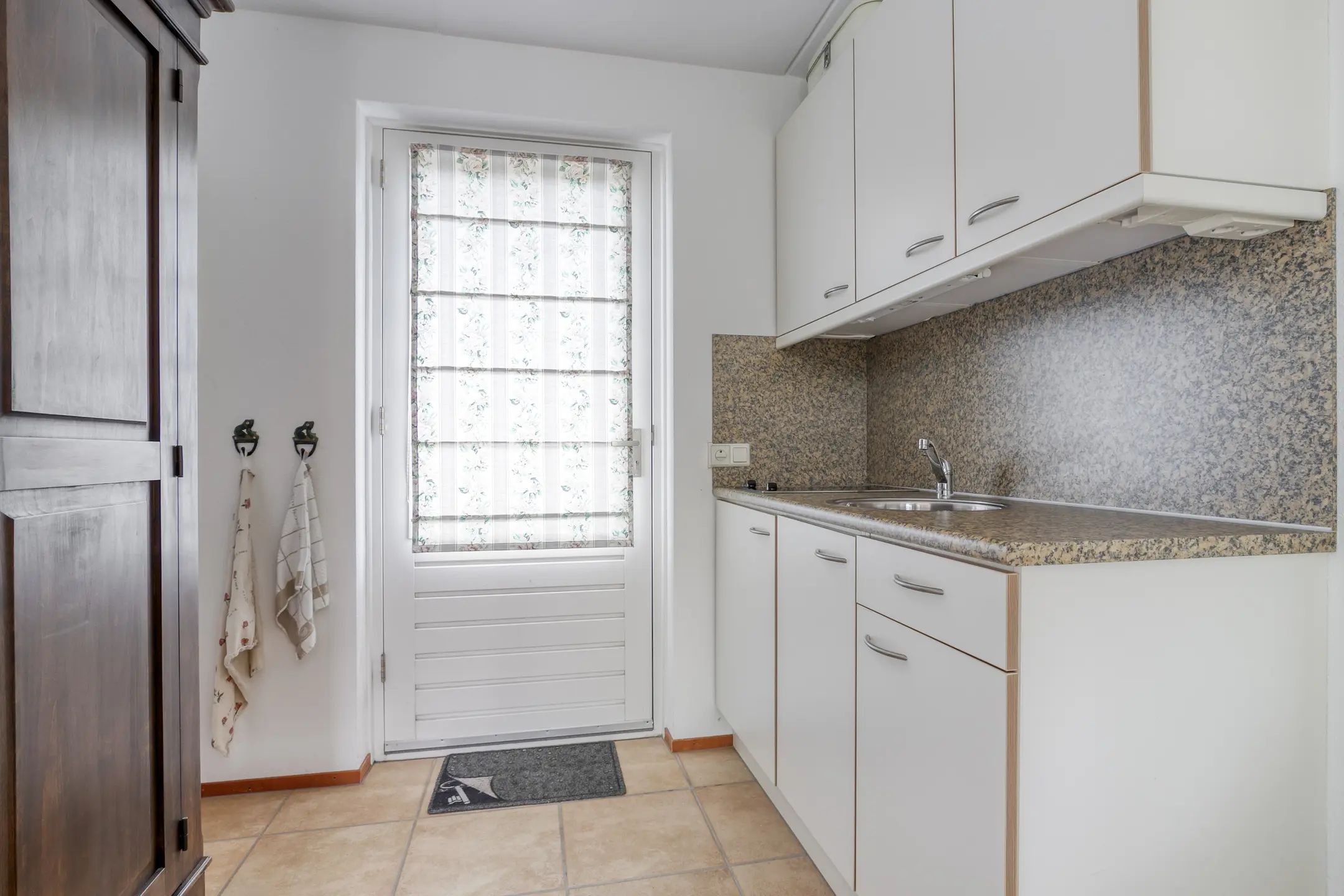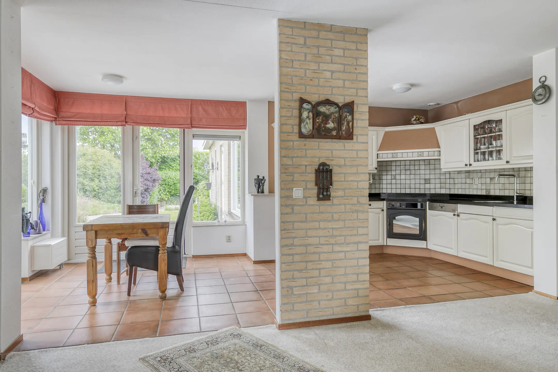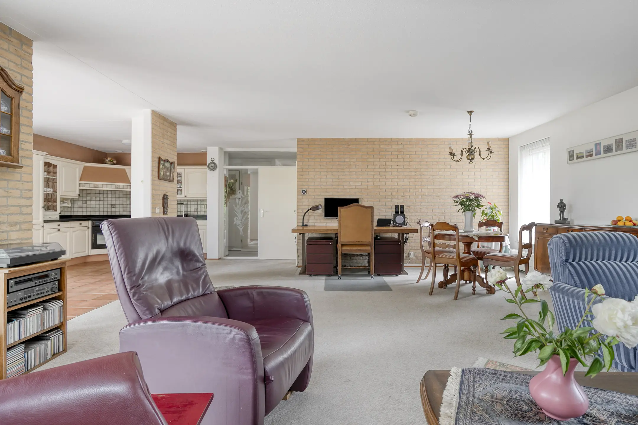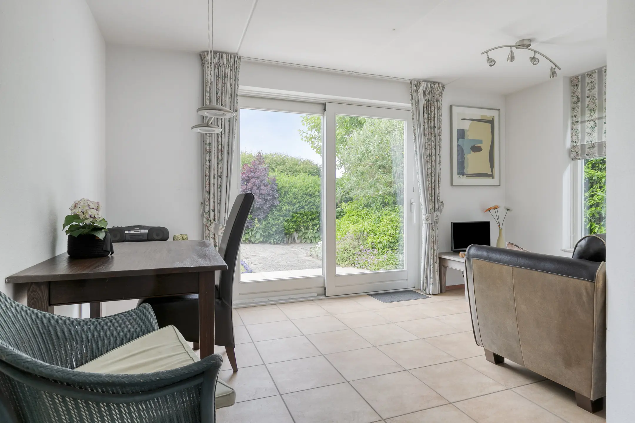 De woonkamer met open keuken is royaal van opzet en beschikt over een trapkast, dubbele openslaande deuren naar de tuin en een schuifpui voor toegang tot het terras. De keuken in L-opstelling is voorzien van een koel-/vriescombinatie, keramische kookplaat, oven, vaatwasser, rvs spoelbak en composiet werkblad.