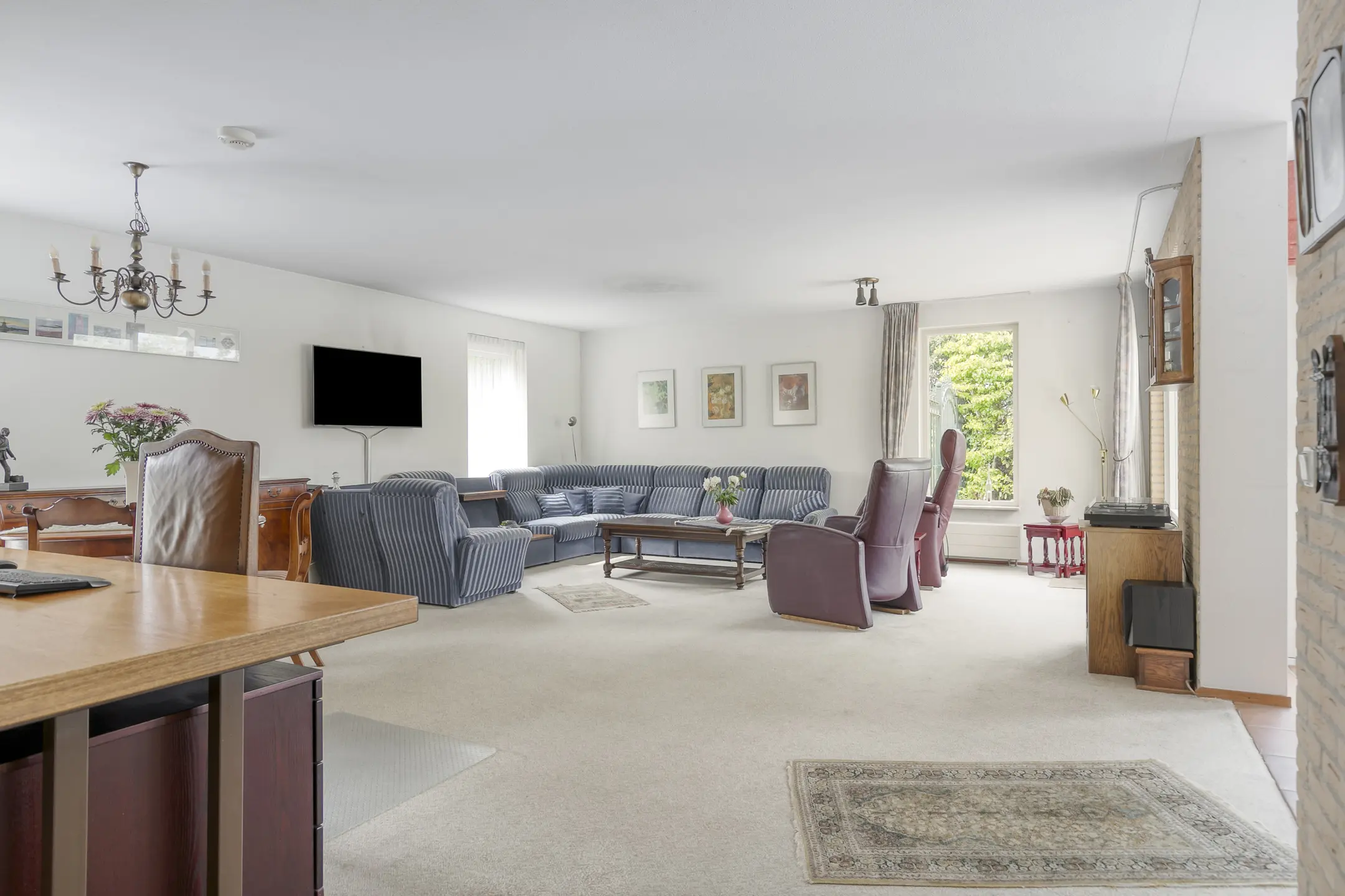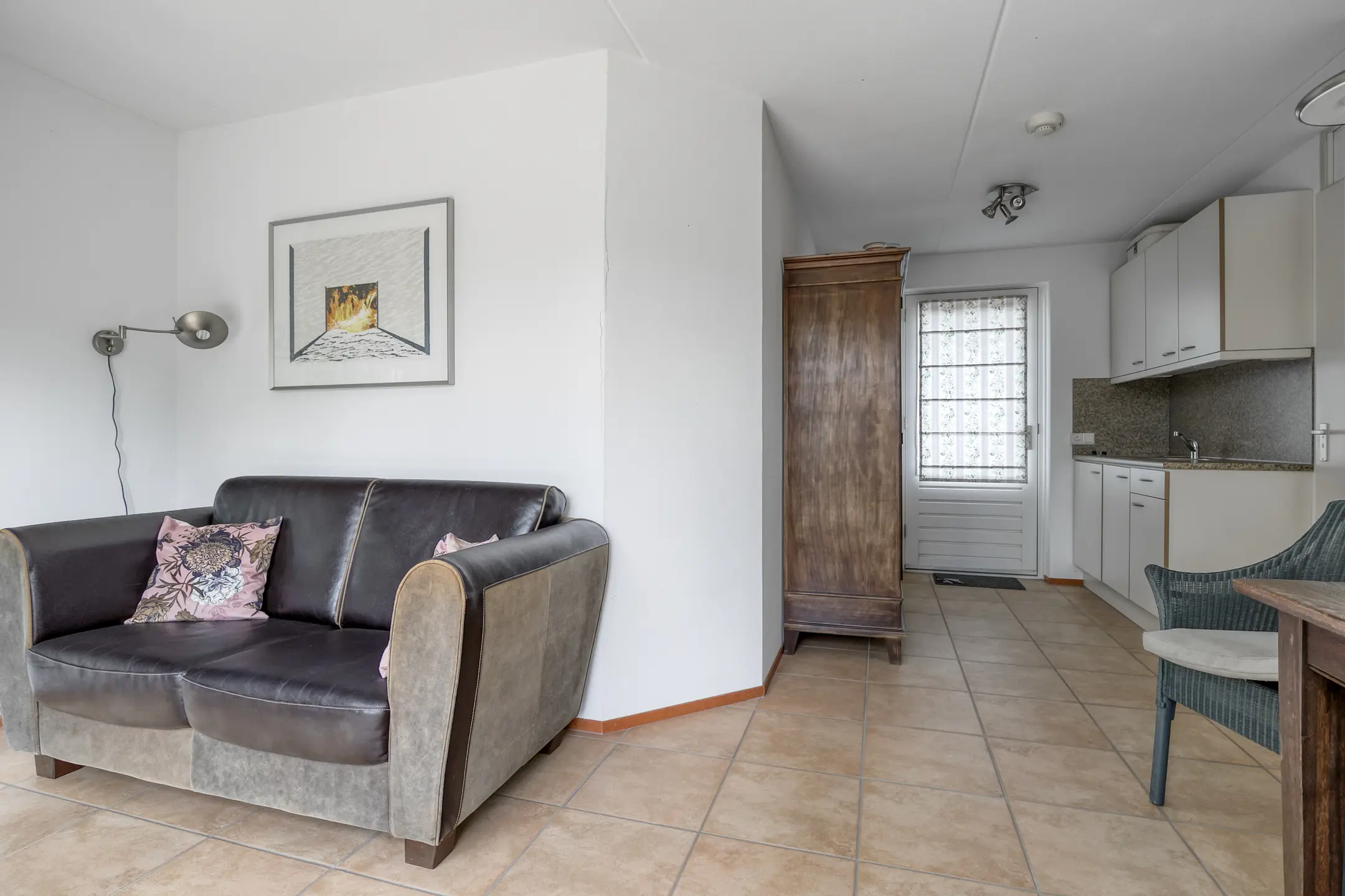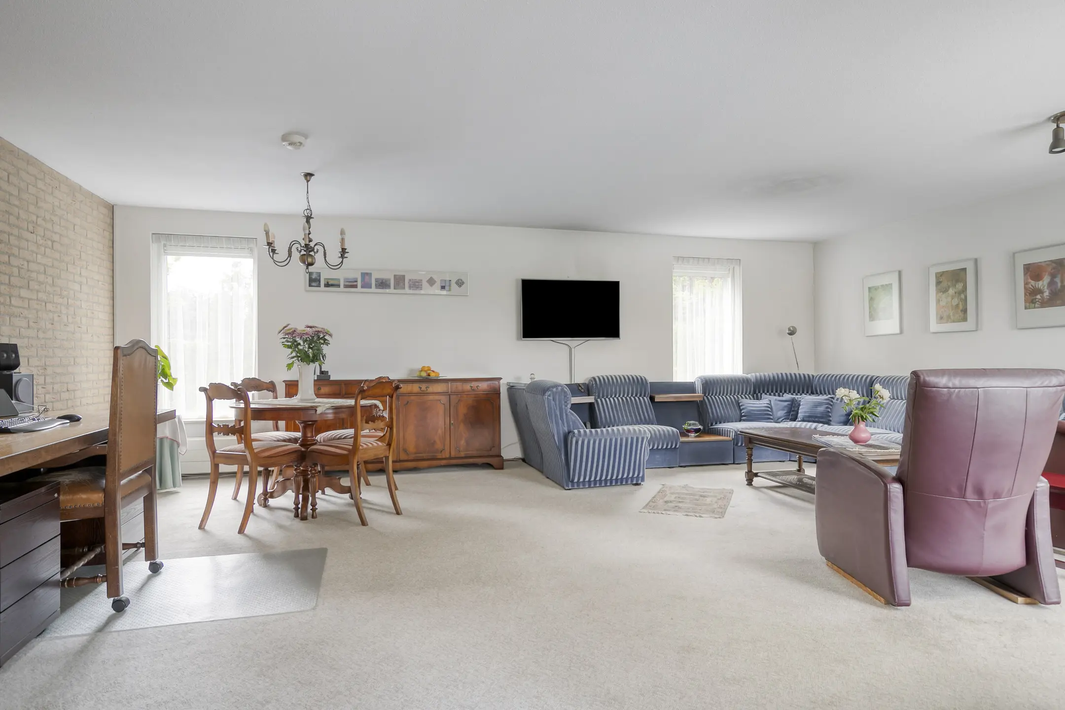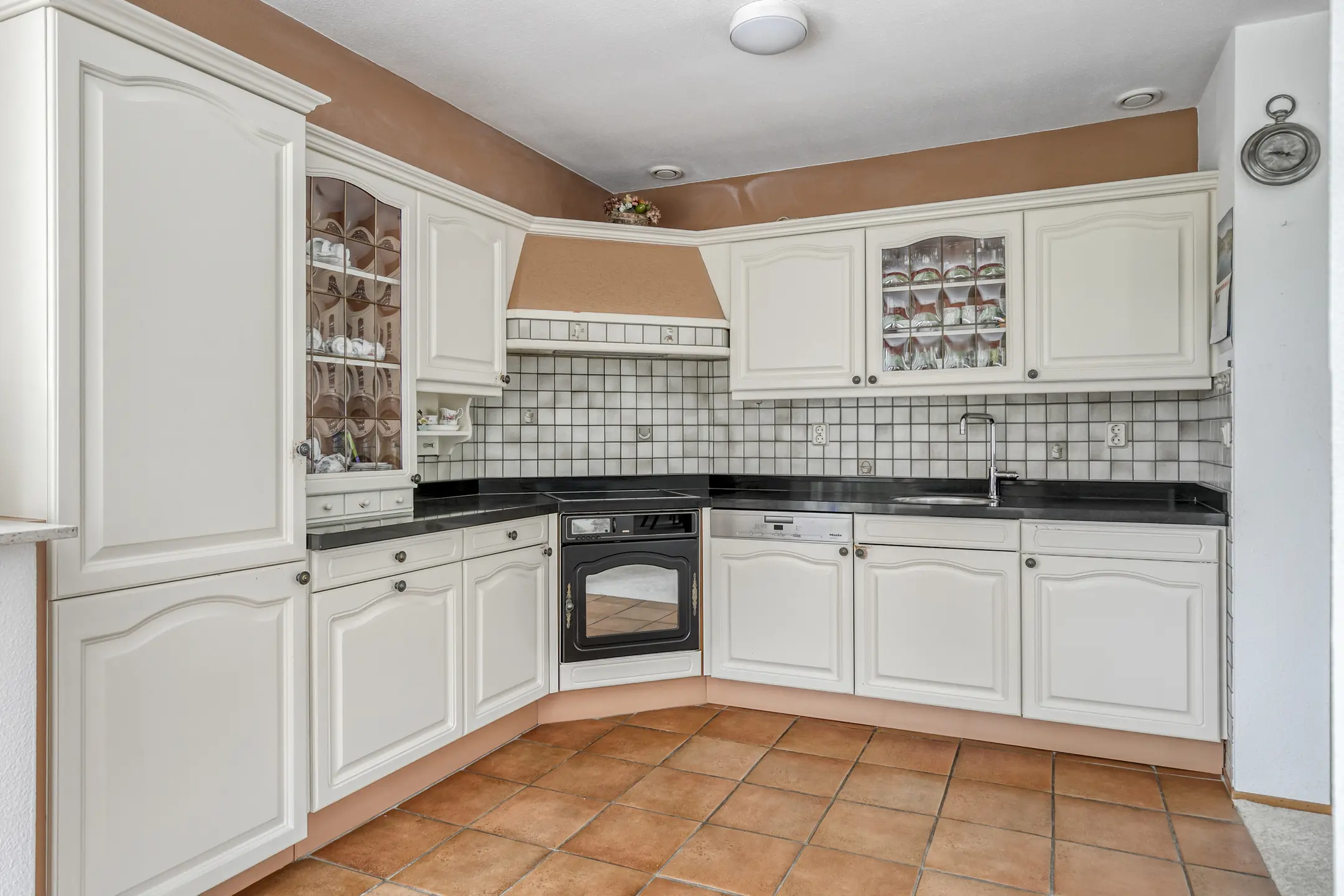 De woonkamer met open keuken is royaal van opzet en beschikt over een trapkast, dubbele openslaande deuren naar de tuin en een schuifpui voor toegang tot het terras. De keuken in L-opstelling is voorzien van een koel-/vriescombinatie, keramische kookplaat, oven, vaatwasser, rvs spoelbak en composiet werkblad.
