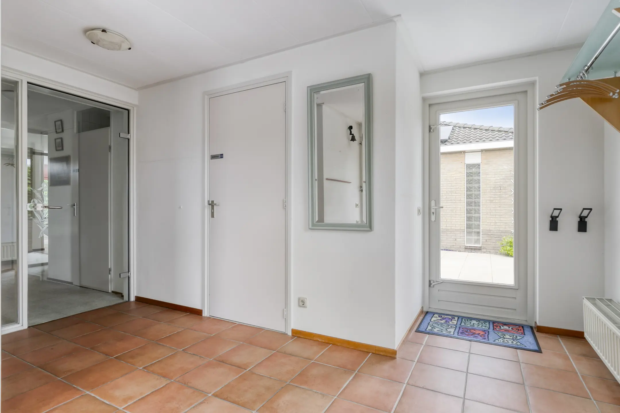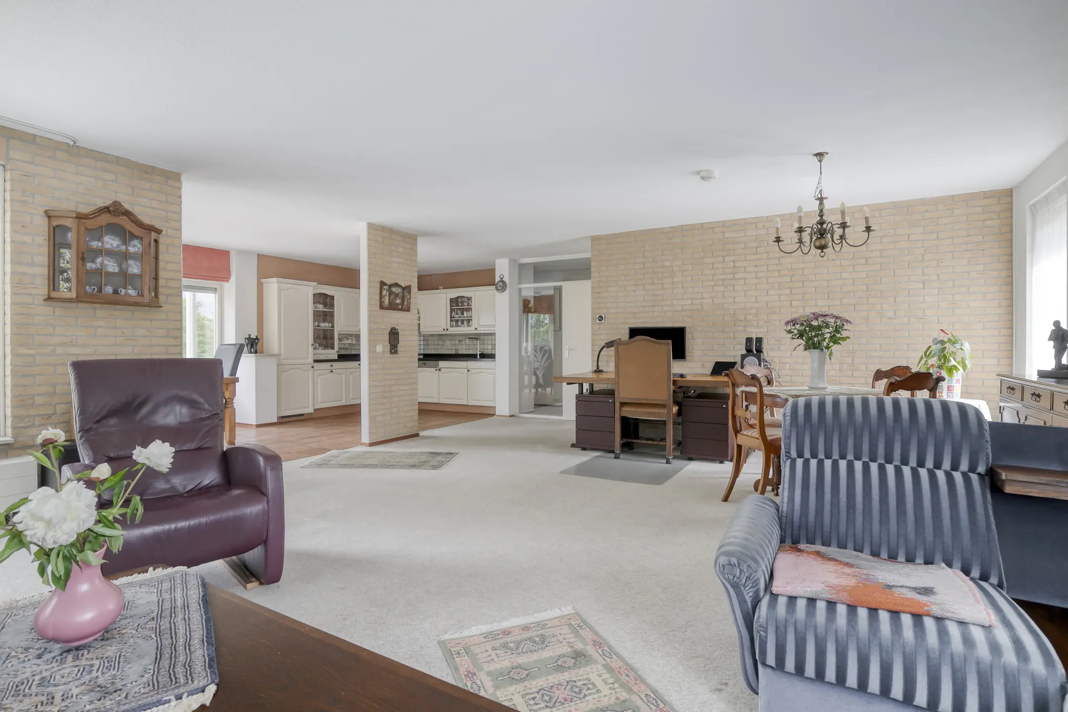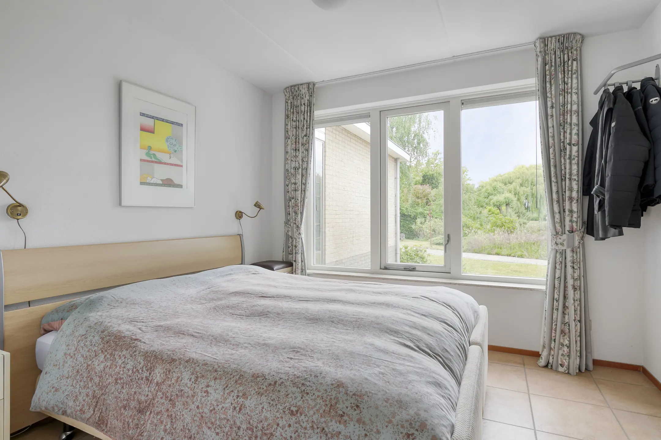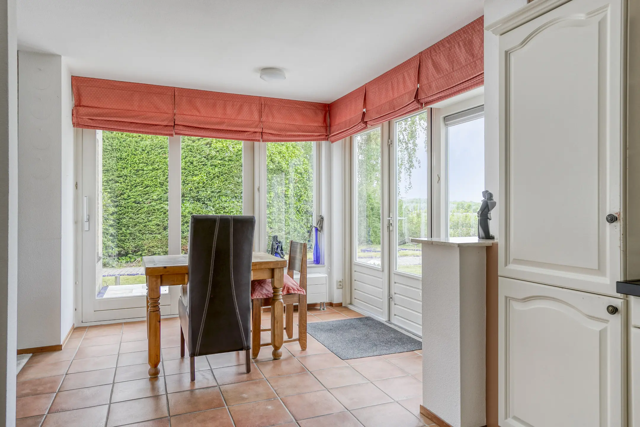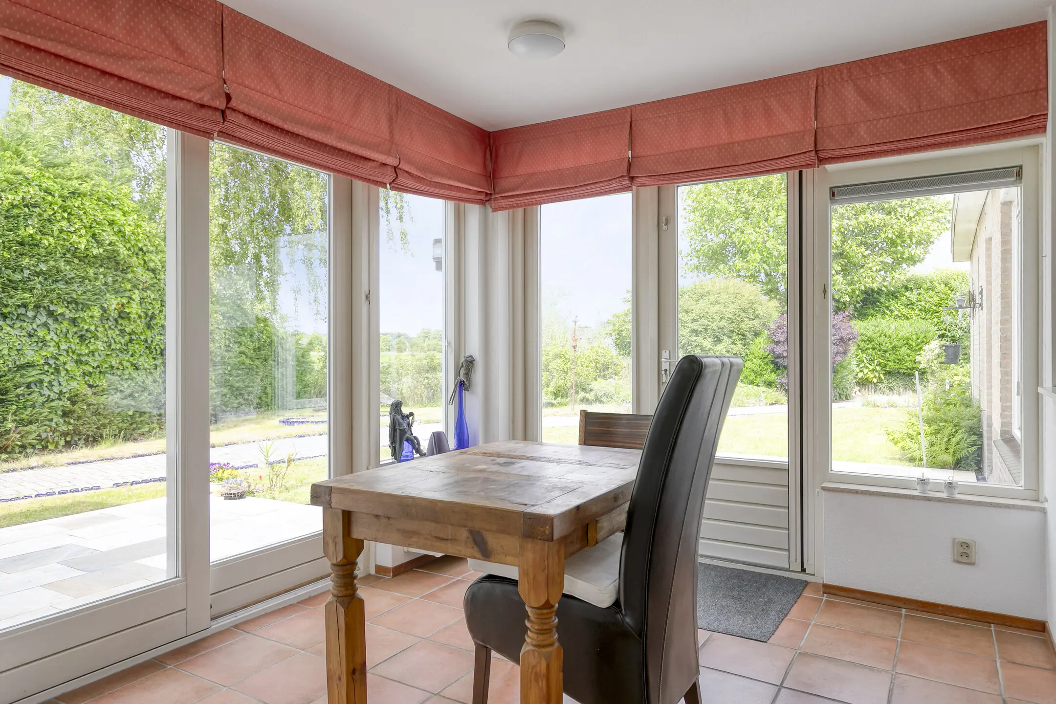 De woonkamer met open keuken is royaal van opzet en beschikt over een trapkast, dubbele openslaande deuren naar de tuin en een schuifpui voor toegang tot het terras. De keuken in L-opstelling is voorzien van een koel-/vriescombinatie, keramische kookplaat, oven, vaatwasser, rvs spoelbak en composiet werkblad.