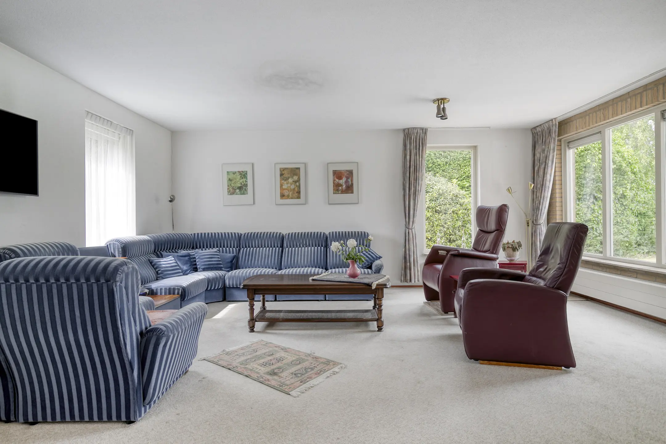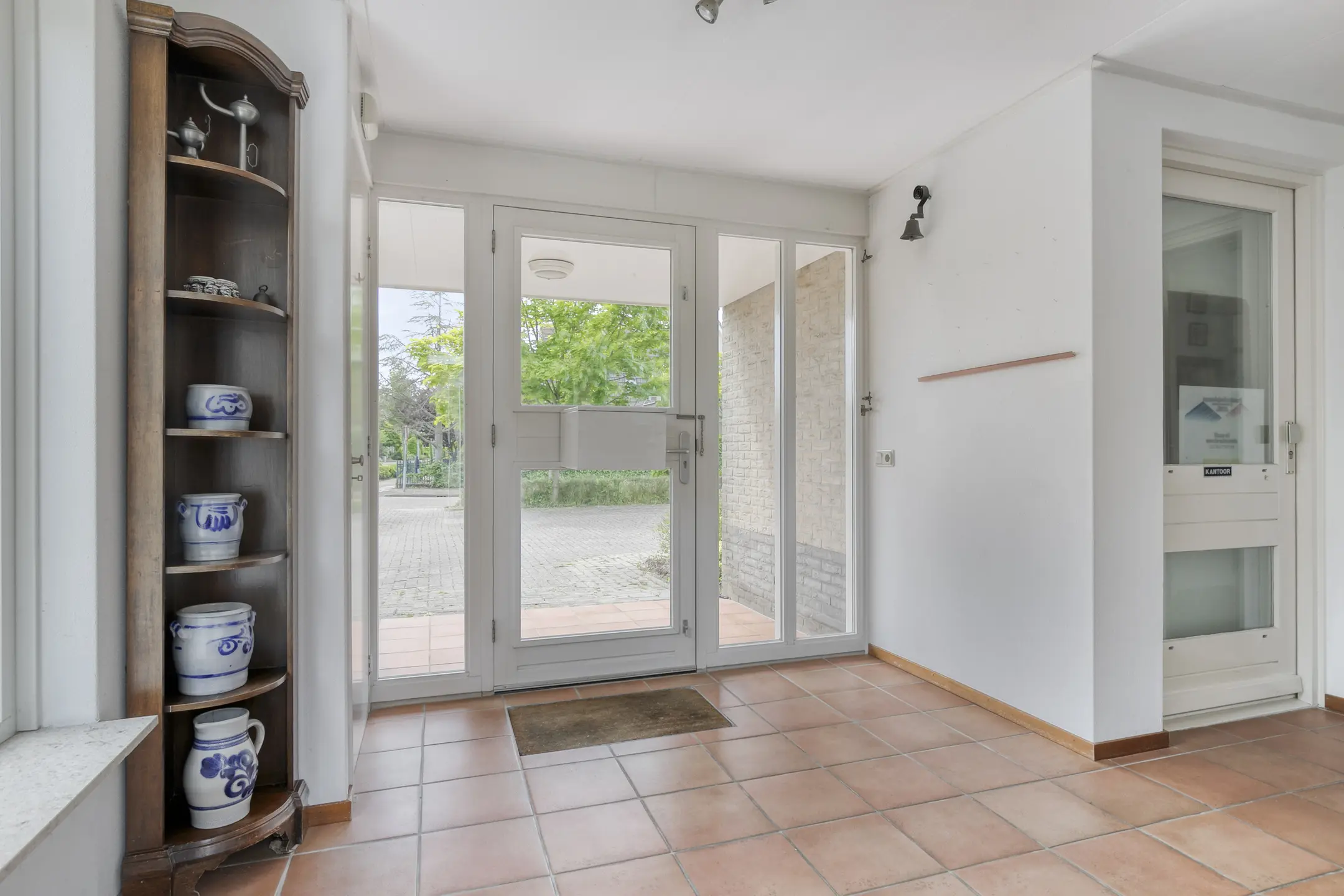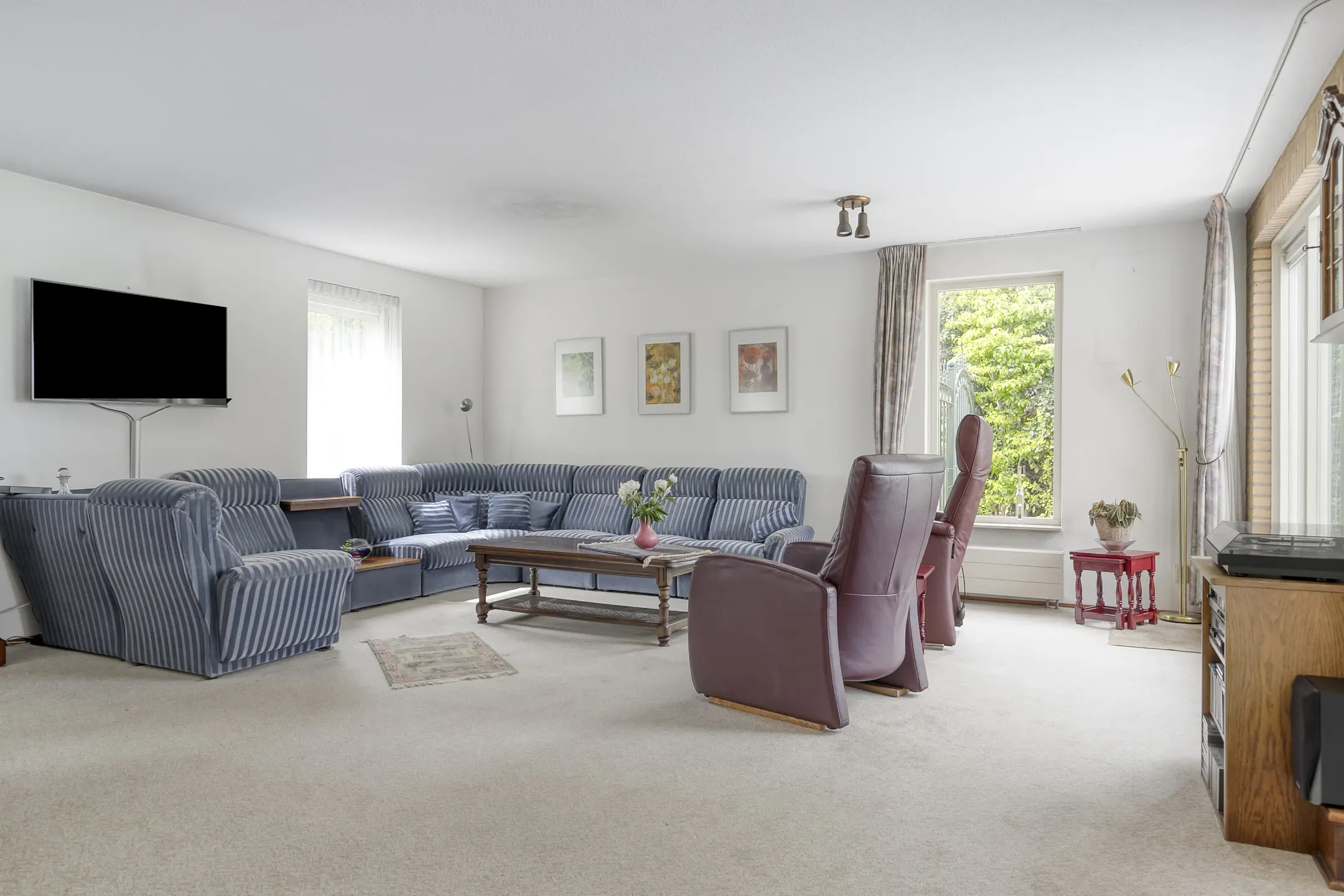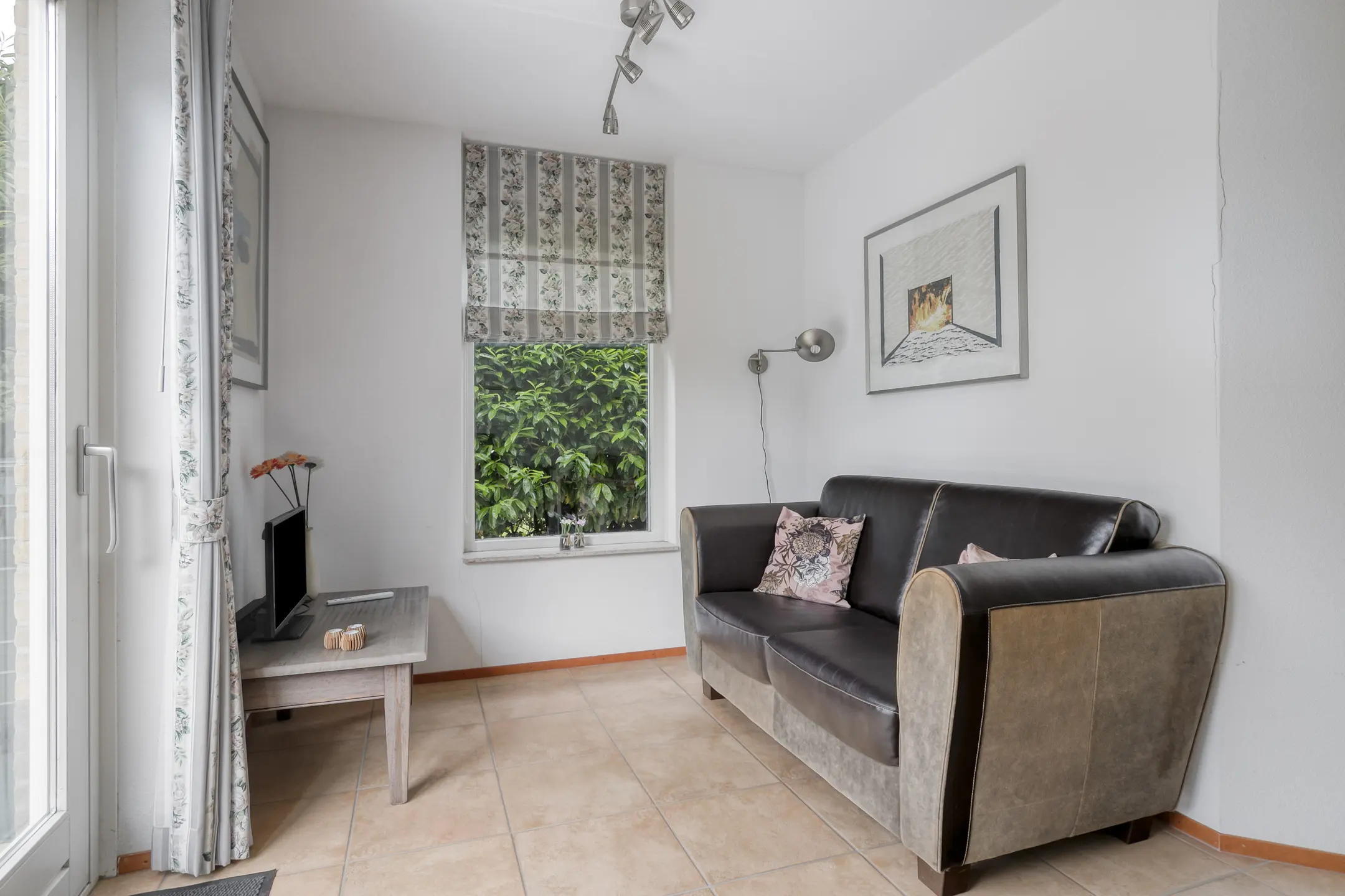 De woonkamer met open keuken is royaal van opzet en beschikt over een trapkast, dubbele openslaande deuren naar de tuin en een schuifpui voor toegang tot het terras. De keuken in L-opstelling is voorzien van een koel-/vriescombinatie, keramische kookplaat, oven, vaatwasser, rvs spoelbak en composiet werkblad.