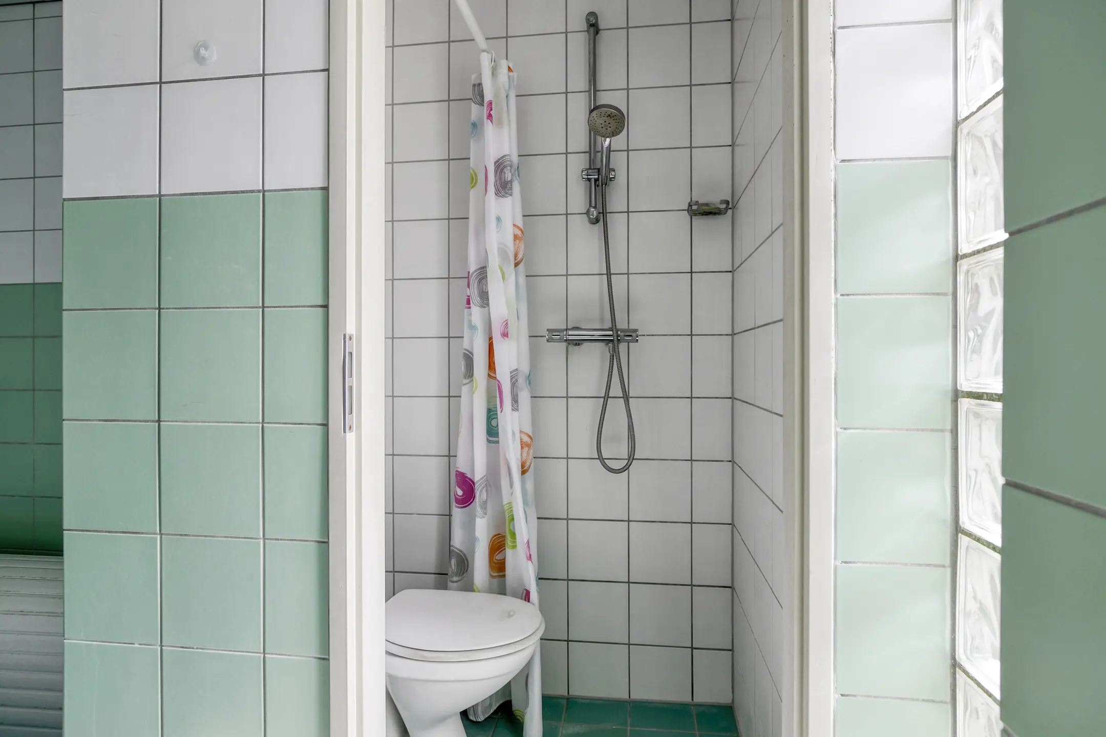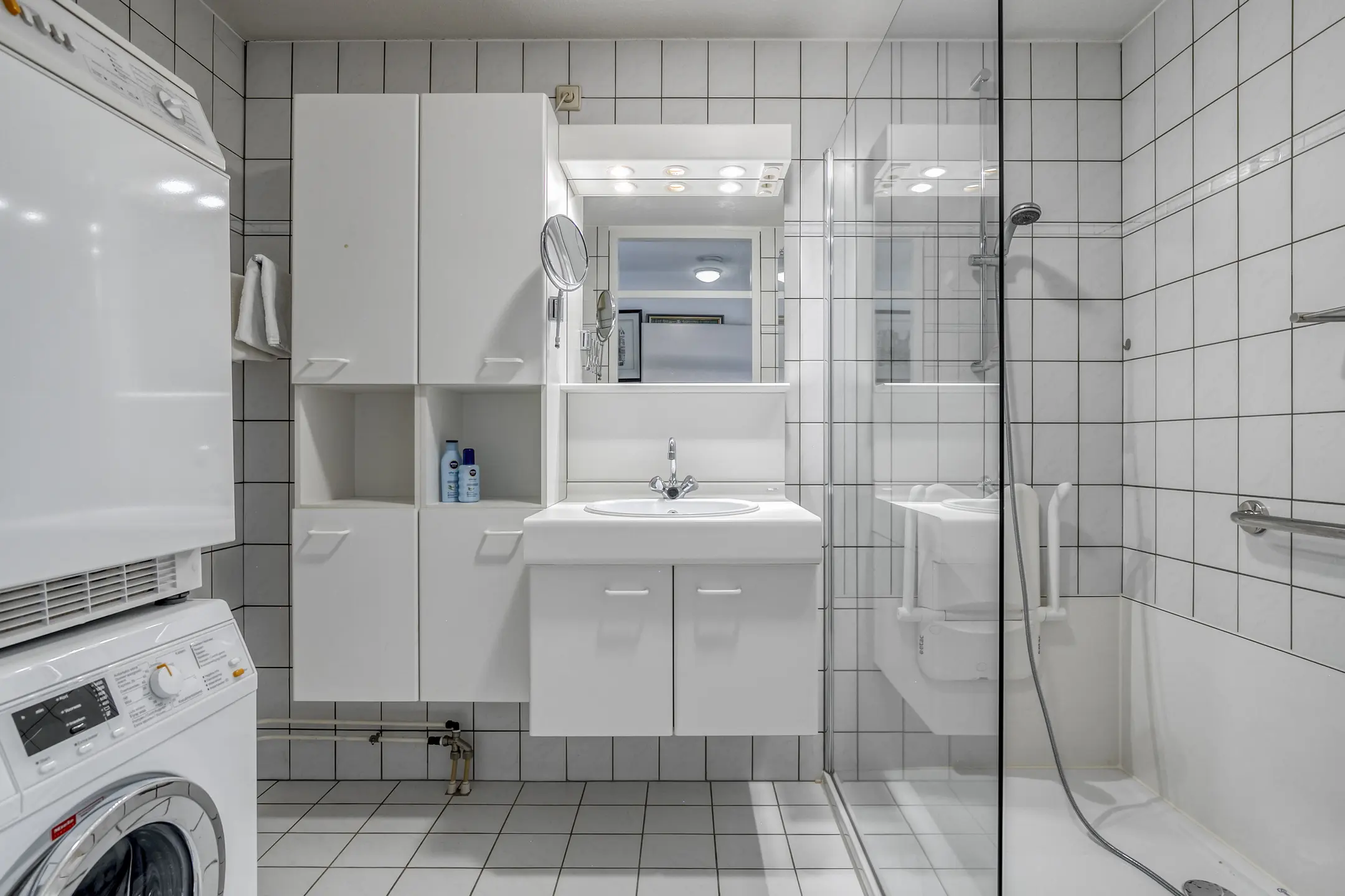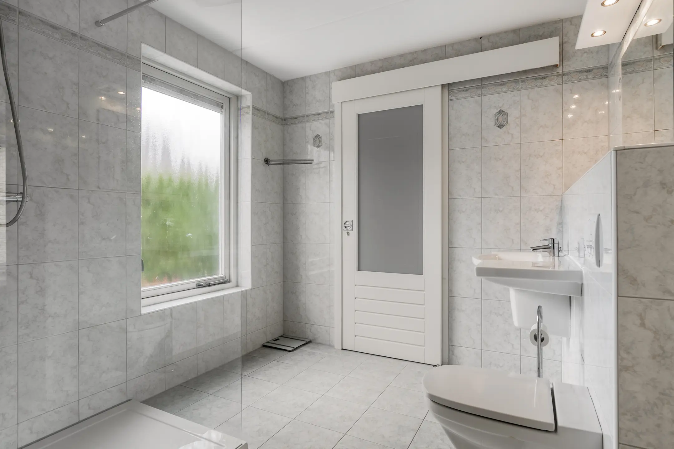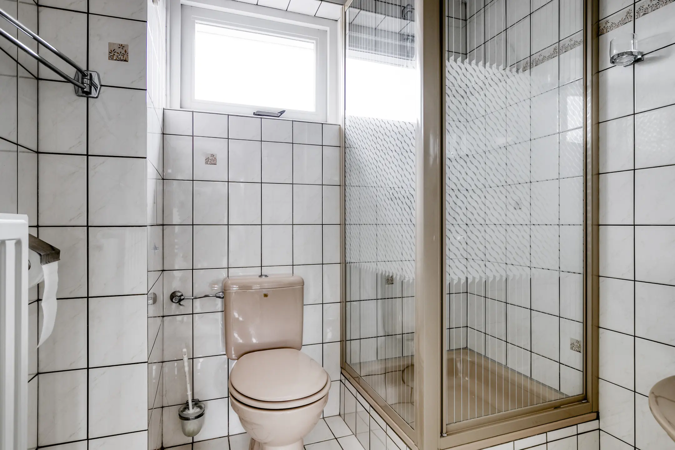 Via een tussenhal bereikt u de badkamer en een ruimte die geschikt zou kunnen zijn als slaapkamer of werkkamer. In twee vaste kasten bevindt zich de opstelling van de warmtepomp en een tweede cv-ketel. Tevens is hier een deur naar buiten en toegang naar het binnenzwembad. De badkamer is volledig betegeld en voorzien van een inloopdouche, wastafelmeubel, aansluiting voor wasmachine en droger, mechanische ventilatie en dubbele plaatradiator met convector.