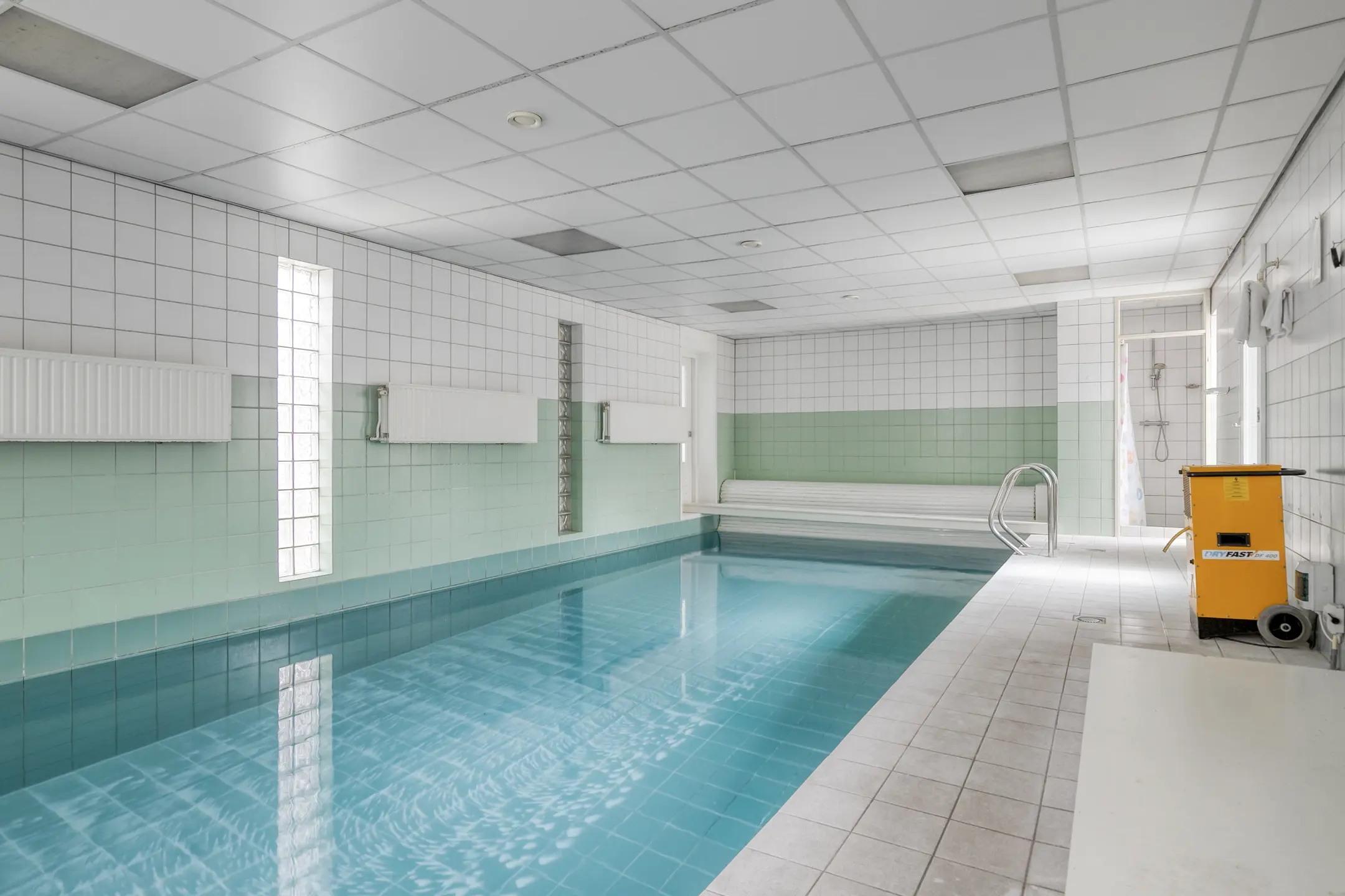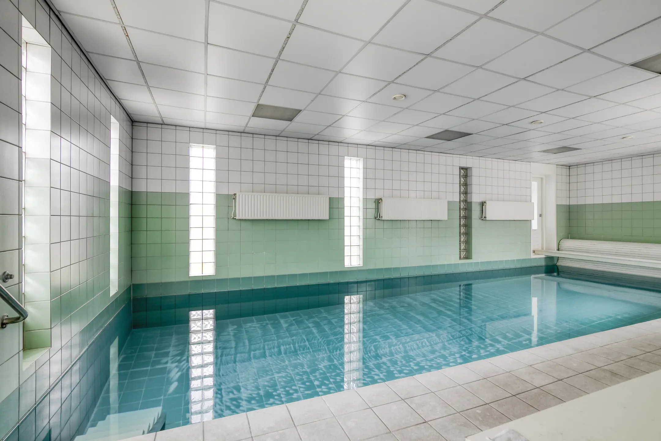 Een van de unieke kenmerken van deze woning is het verwarmde binnenzwembad, bereikbaar vanuit binnen en buiten. De ruimte is volledig betegeld, heeft glazen bouwstenen ramen en diverse ventilatiepunten. Er is een aparte doucheruimte met hoekdouche en staand closet. Tevens bevindt er zich een kelderruimte met opstelling van de pomp apparatuur t.b.v. het zwembad.