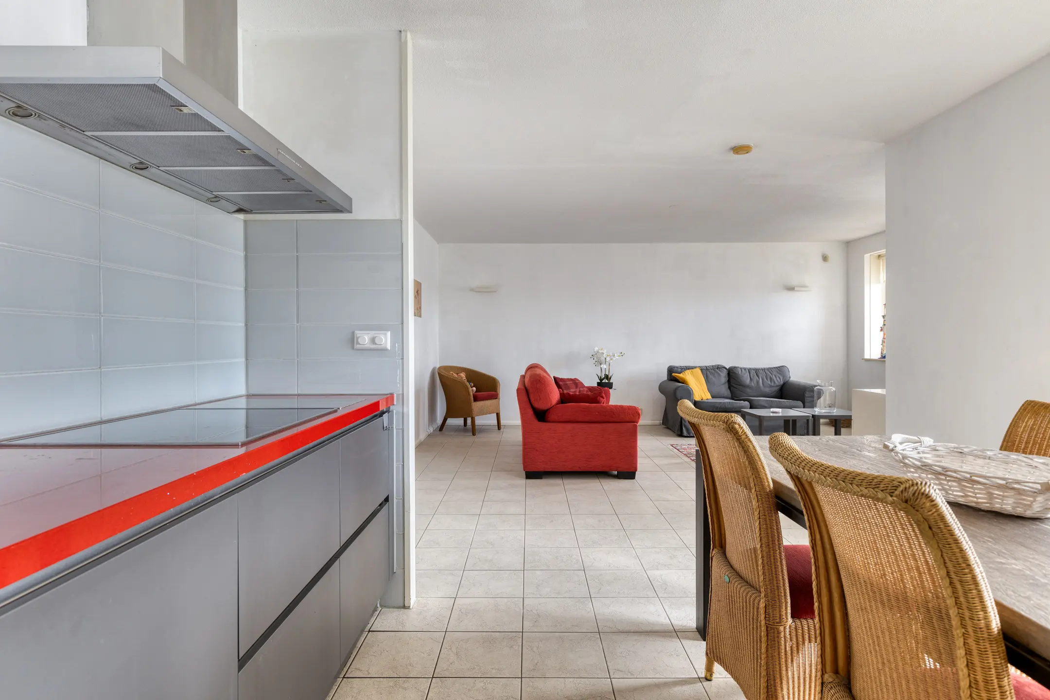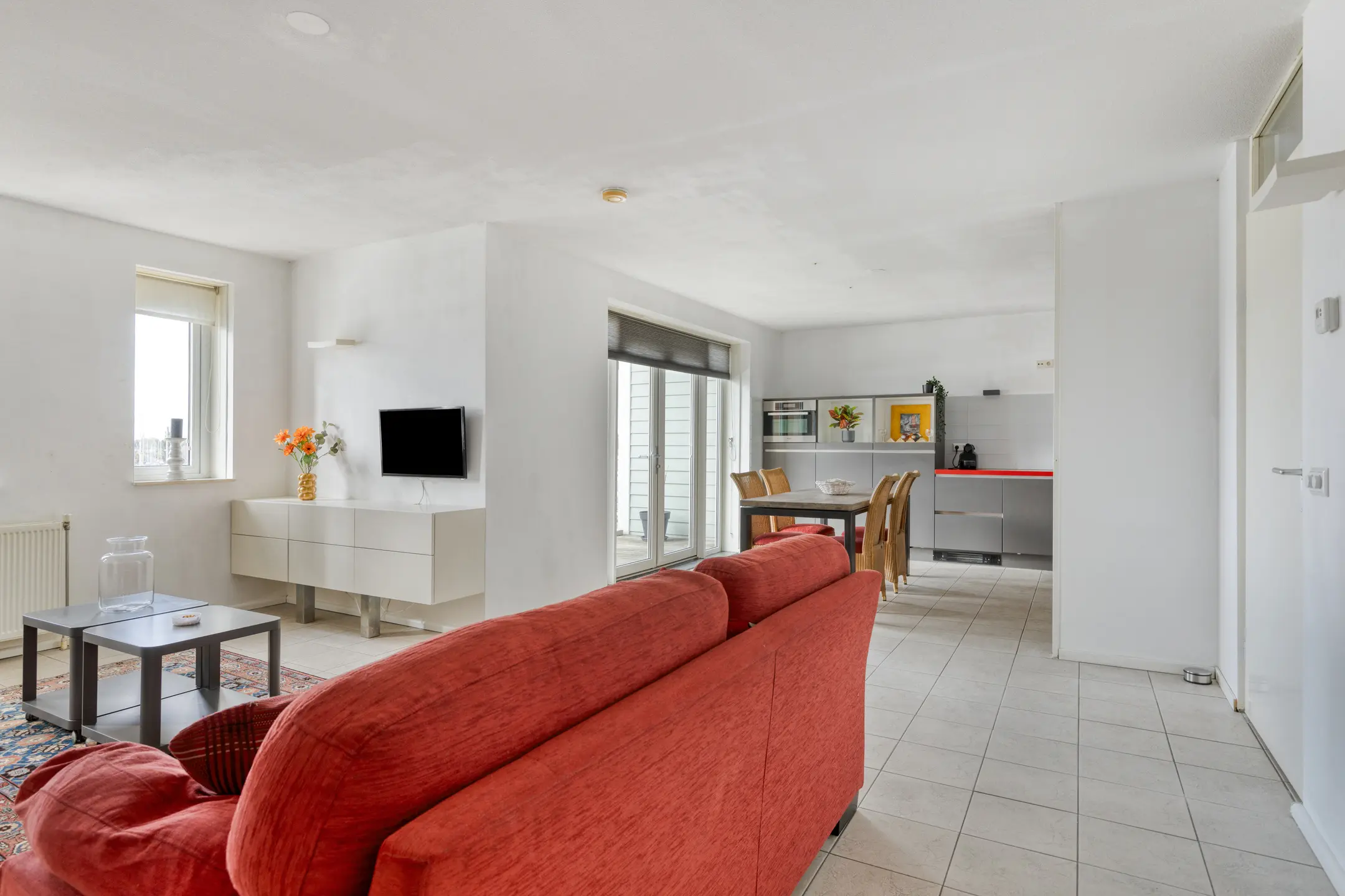 Op de 2e verdieping komt u binnen via een ruime gang met kapstok en dimbare verlichting. U komt allereerst bij de twee zeer ruime slaapkamers, die plaats bieden aan een een tweepersoonsbed. Eén slaapkamer is voorzien is van een grote schuifwandkast met spiegeldeuren, terwijl de andere slaapkamer een eigen balkon heeft met openslaande balkondeuren. Er zijn TV aansluitingen in alle kamers. Vanuit de gang heeft u toegang tot zowel een afzonderlijke WC met fontein, de bijkeuken/wasruimte met was/droogcombinatie, CV installatie en centrale afzuiginstallatie alsmede een ruime badkamer met een duobad met thermostaatkraan, een aparte inloop regendouche met thermostaatkraan en een groot wastafelmeubel met twee afzonderlijke mengkranen. Daarna betreedt u de ruime woonkamer, die, evenals de keuken, voorzien van indirecte dimbare wandverlichting, en de luxe verbouwde open eetkeuken met daarin een keukenmengkraan, dubbele spoelbak en ingebouwde (plint) boiler, een extra plintverwarming, vaatwasser, combi-oven, inductiekookplaat met afzuigkap alsmede een ruime koelkast en aparte vriezer. Alle keukenapparatuur is van Miele en geplaatst bij de verbouwing in 2013. Vanuit de eetkeuken komt u via de openslaande terrasdeuren op het zeer ruime terras van 16 m2, waar u van het uitzicht en menige prachtige zonsondergang zult kunnen genieten. Het terras is deels ingebouwd zodat u veel privacy heeft en weinig last van de wind.