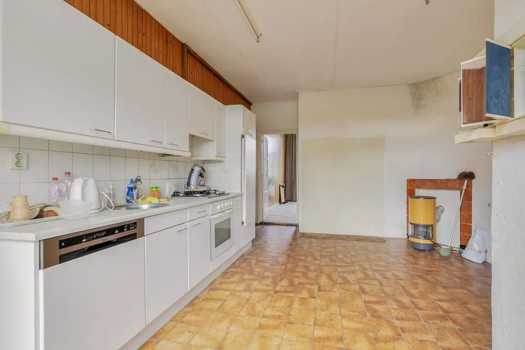 Vanuit de hal is de woonkeuken/eetkamer te bereiken. Ook hier is de houten vloer terug te vinden evenals de gaskachel. Daarnaast is de keuken voorzien van vaste kasten en een wandopstelling met diverse inbouwapparatuur en vanuit hier is de toilet-/doucheruimte bereikbaar. Vanuit de keuken toegang naar de kelder, trapopgang naar de verdieping, deur naar de tuin en een deur naar de grote aangebouwde schuren.