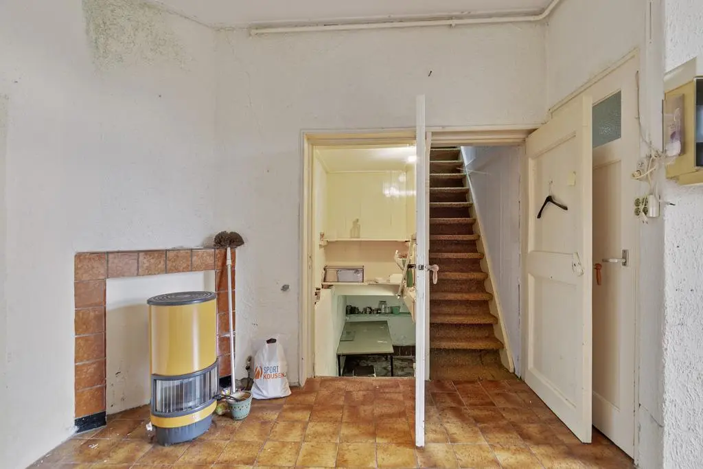 U komt binnen in een ruime hal met opstelling van de meterkast en toegang naar de woonkamer met houten vloer en gaskachel. Via een portaal de trapopgang naar de opkamer welk boven de kelder gelegen is. De opkamer is voorzien van een wastafel en een vaste kast.