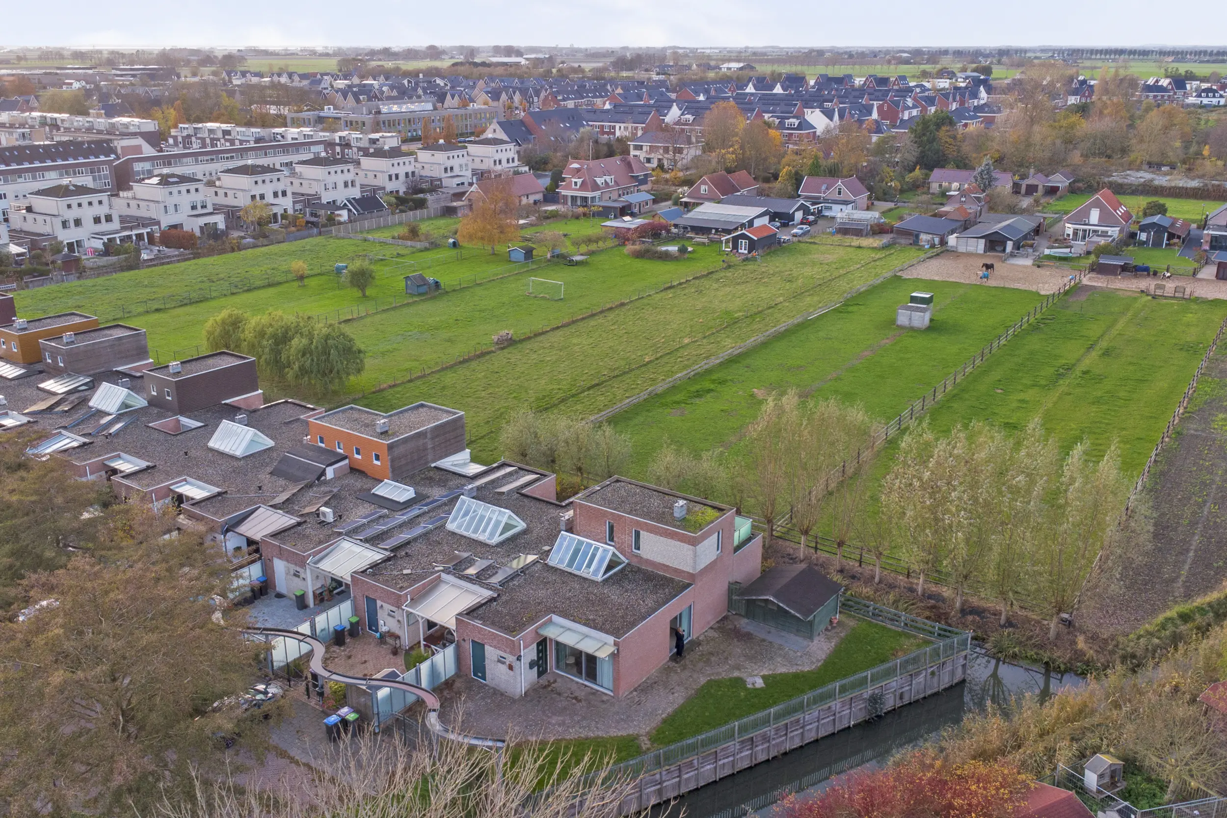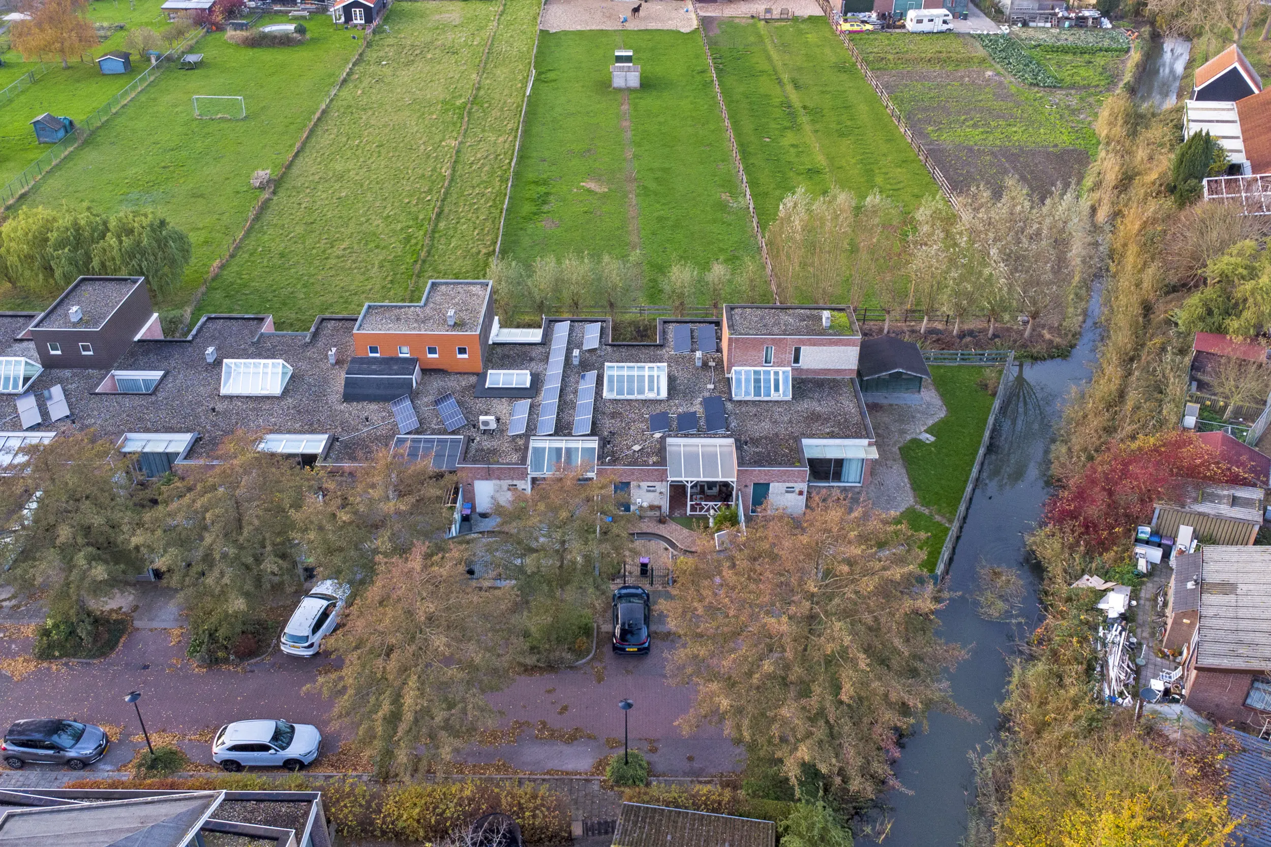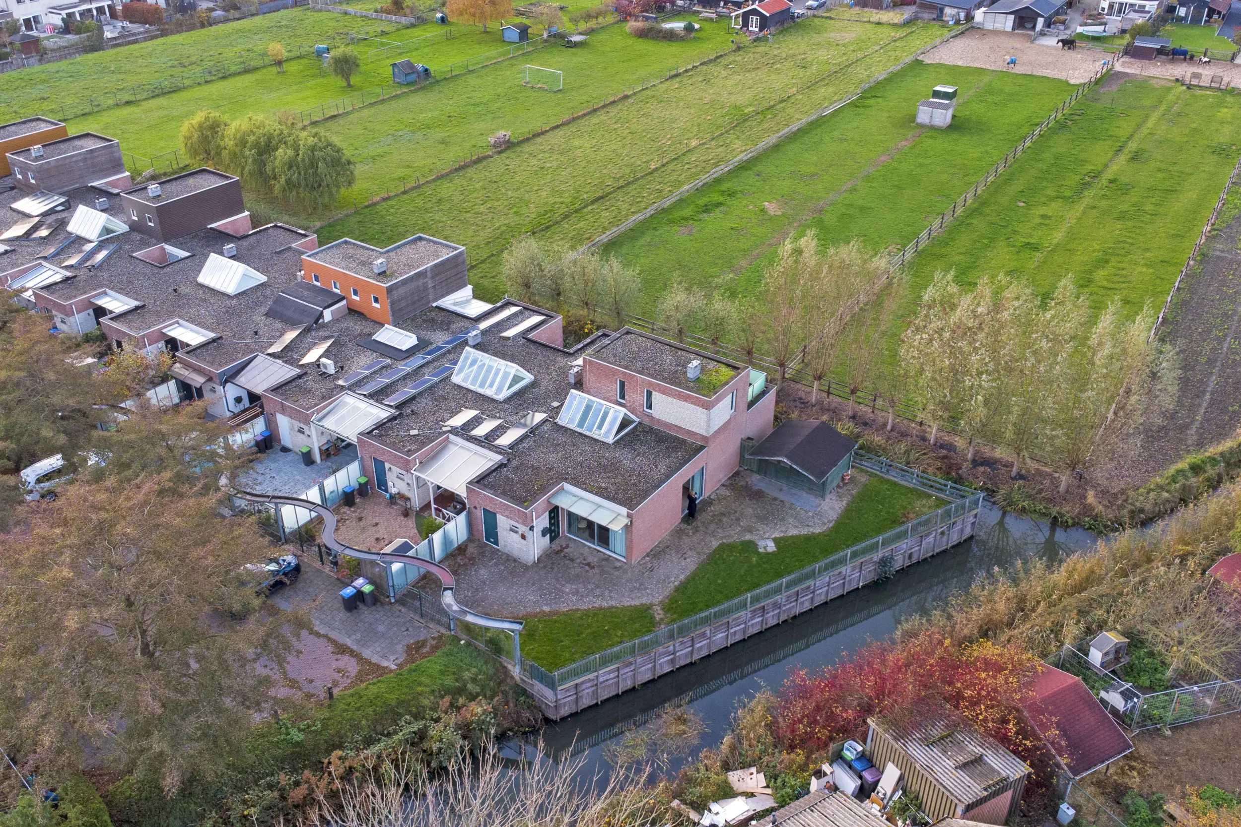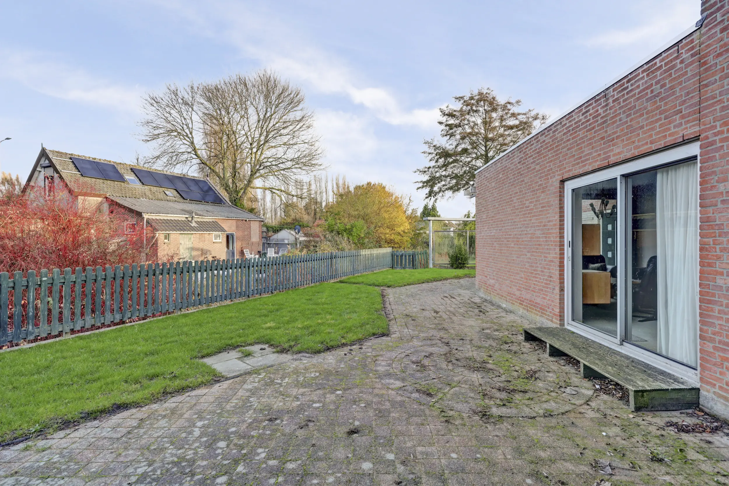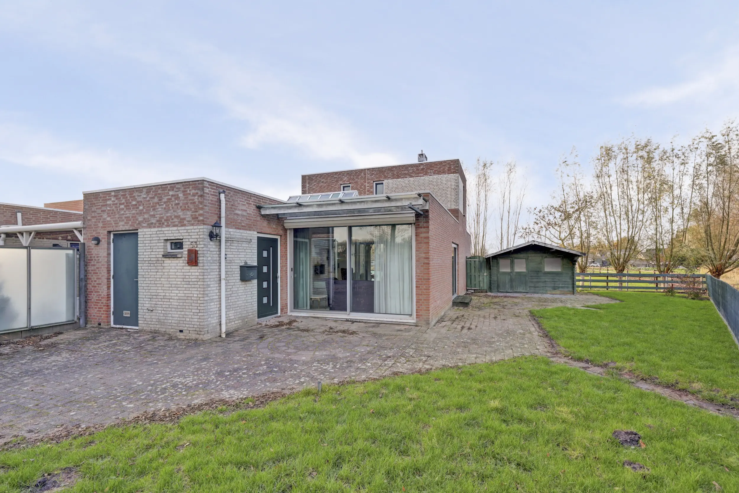 De tuin aan de achterzijde van de woning grenst aan de weilanden met vrij uitzicht, de voortuin welke op het zuid-oosten ligt is afgesloten met een poort en biedt parkeergelegenheid voor minimaal 2 auto's. In de zijtuin staat een houten berging. De woning is bijzonder rustig gelegen aan het einde van een doorlopende straat met alleen bestemmingsverkeer.