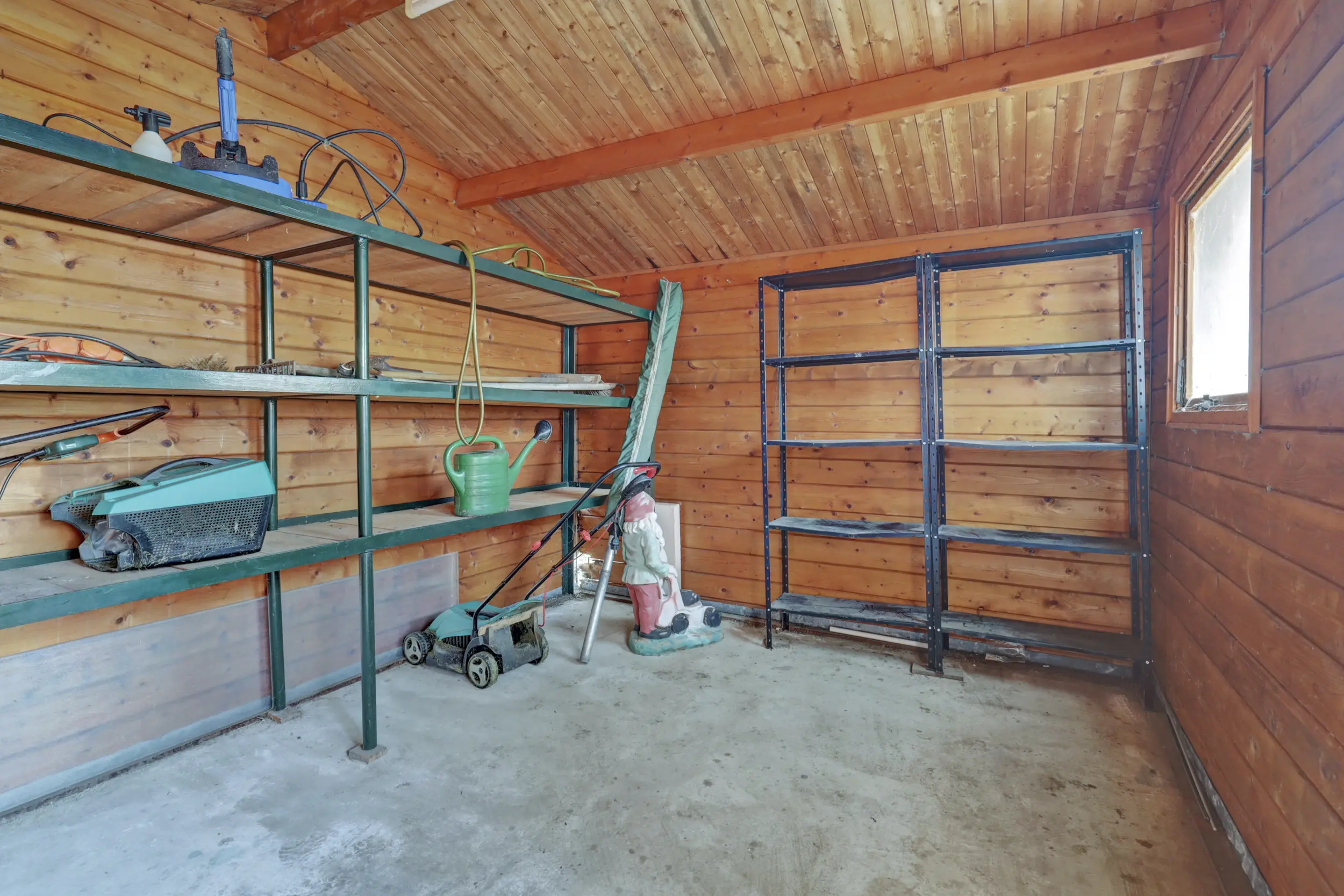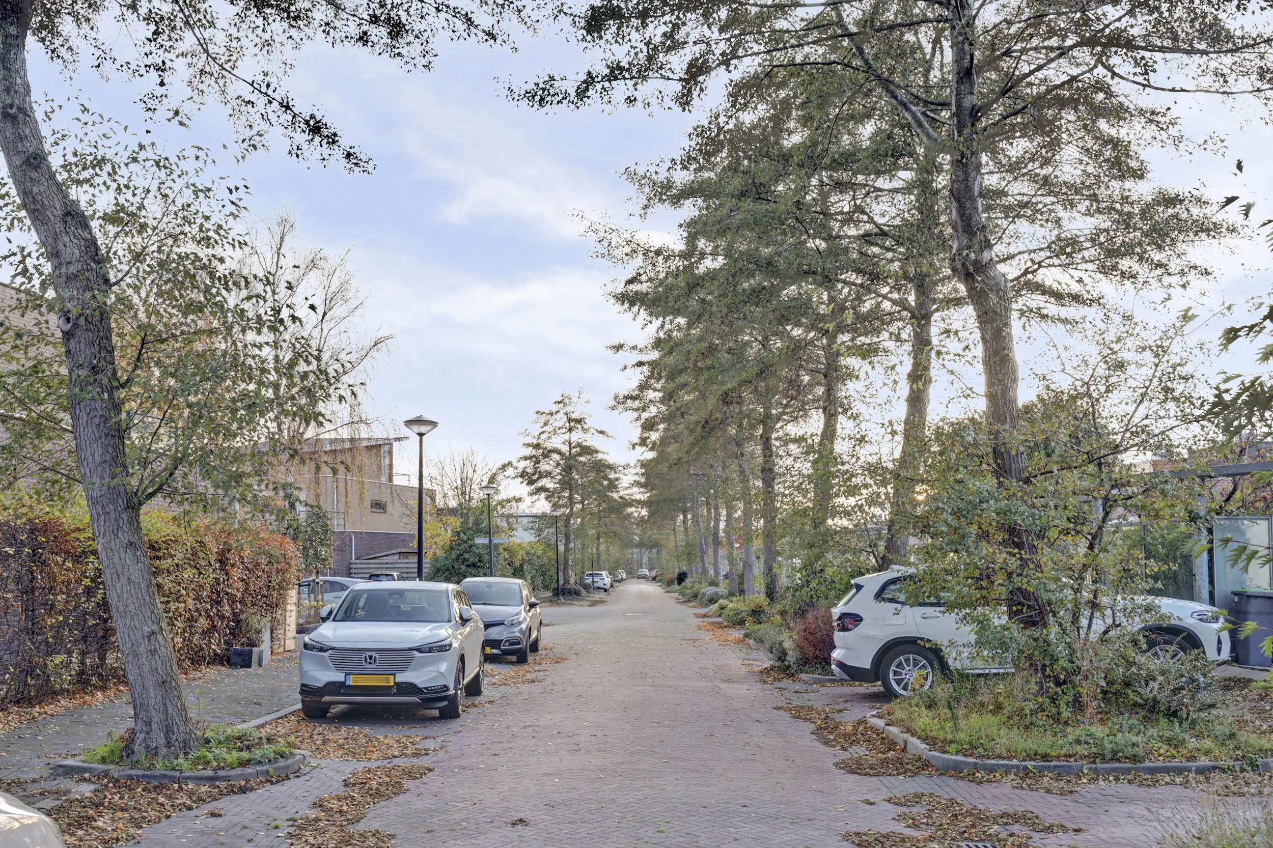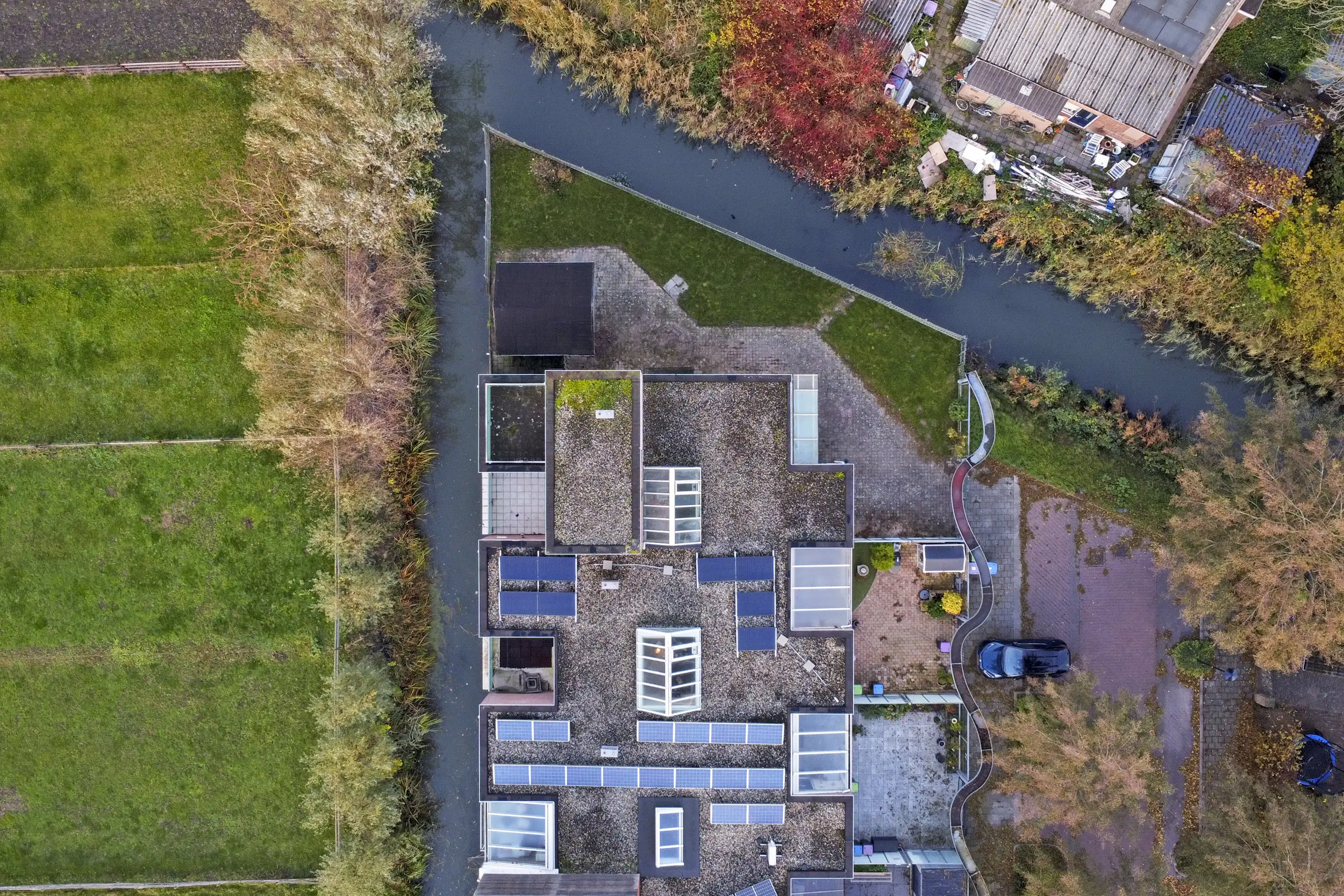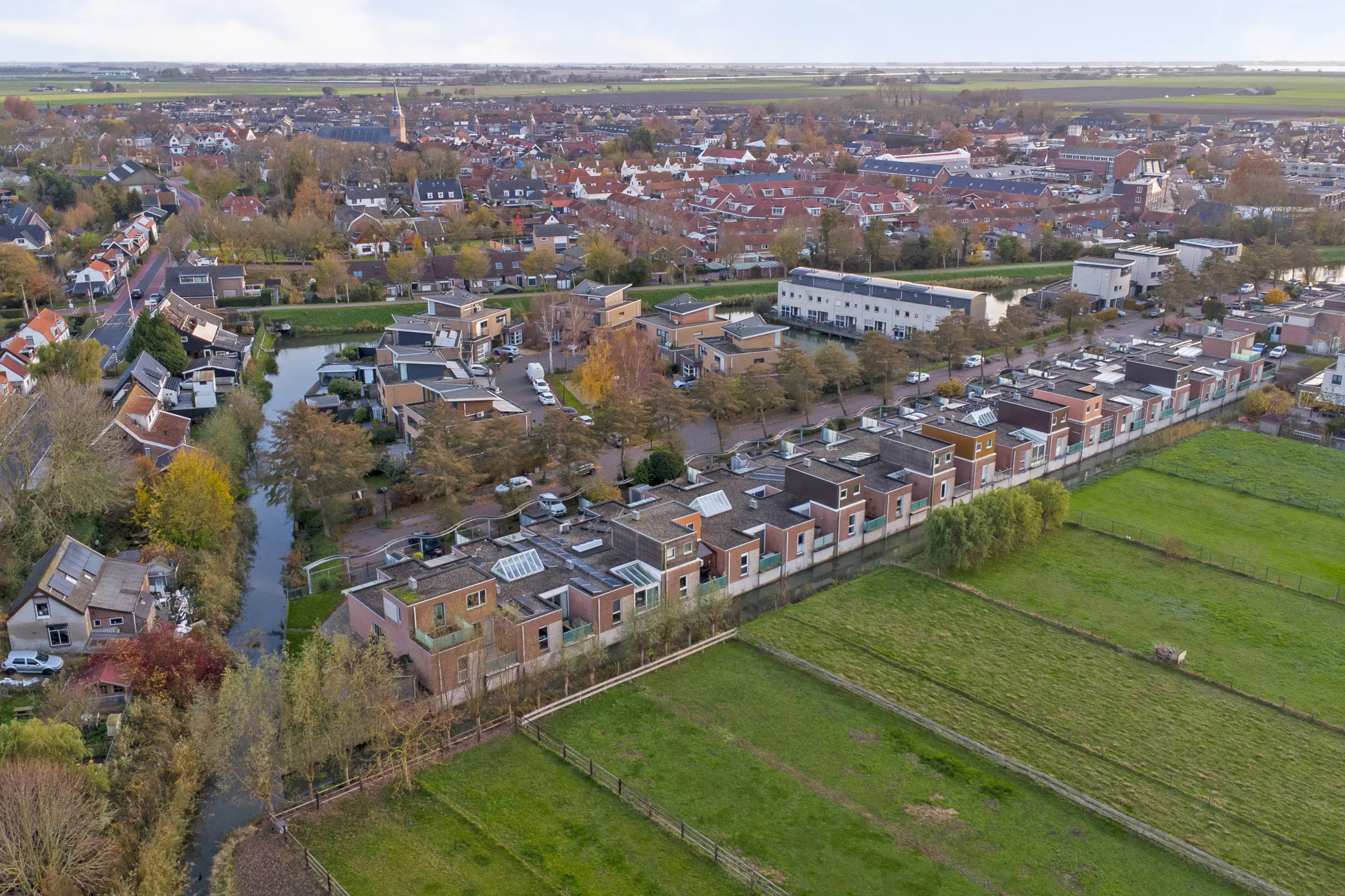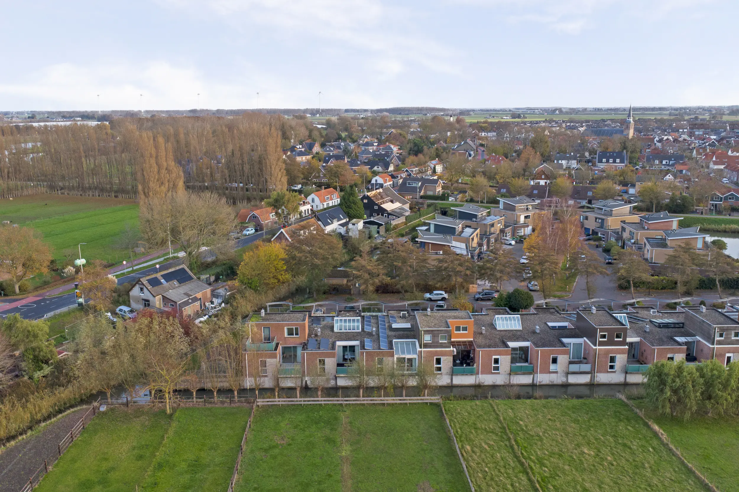 De tuin aan de achterzijde van de woning grenst aan de weilanden met vrij uitzicht, de voortuin welke op het zuid-oosten ligt is afgesloten met een poort en biedt parkeergelegenheid voor minimaal 2 auto's. In de zijtuin staat een houten berging. De woning is bijzonder rustig gelegen aan het einde van een doorlopende straat met alleen bestemmingsverkeer.