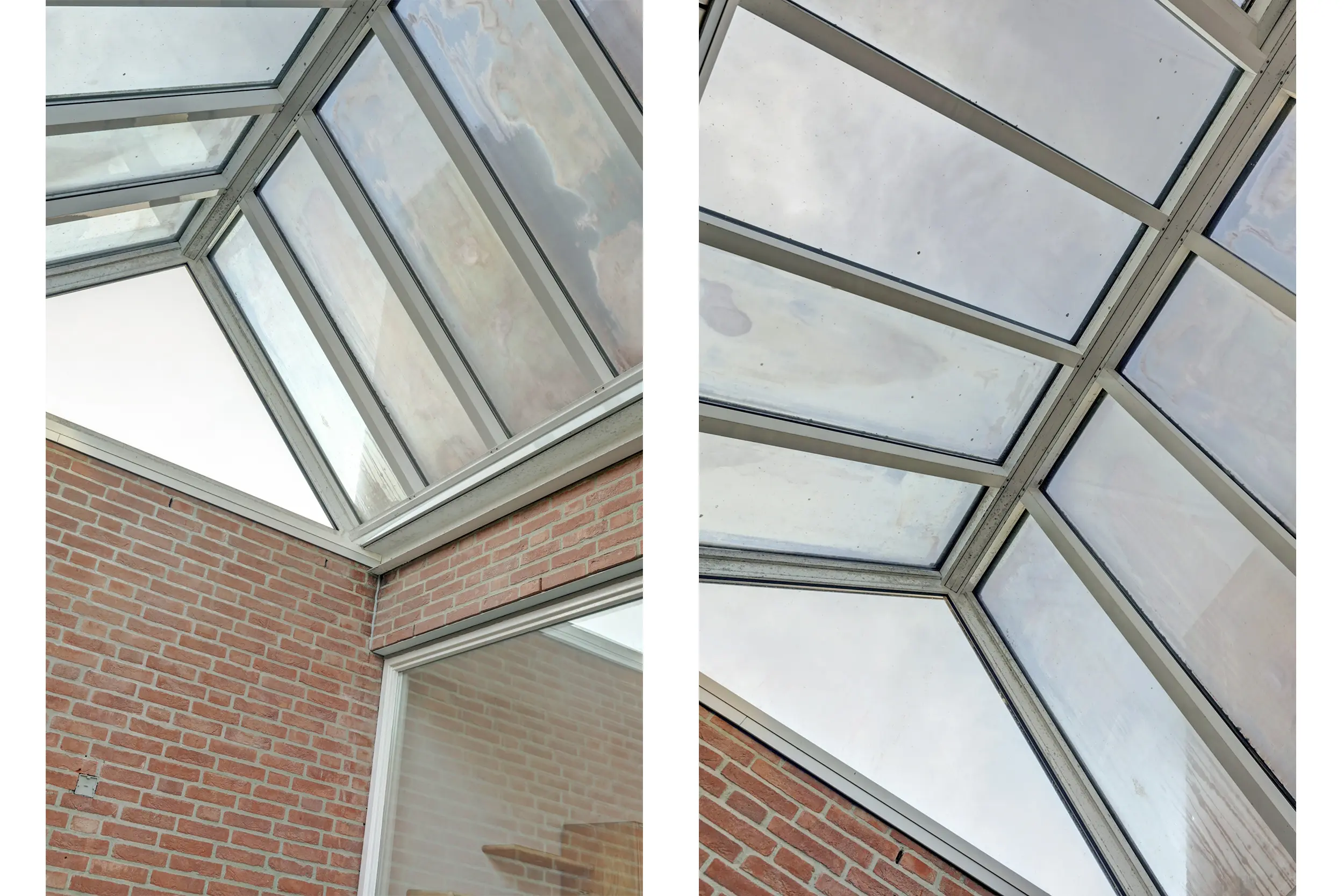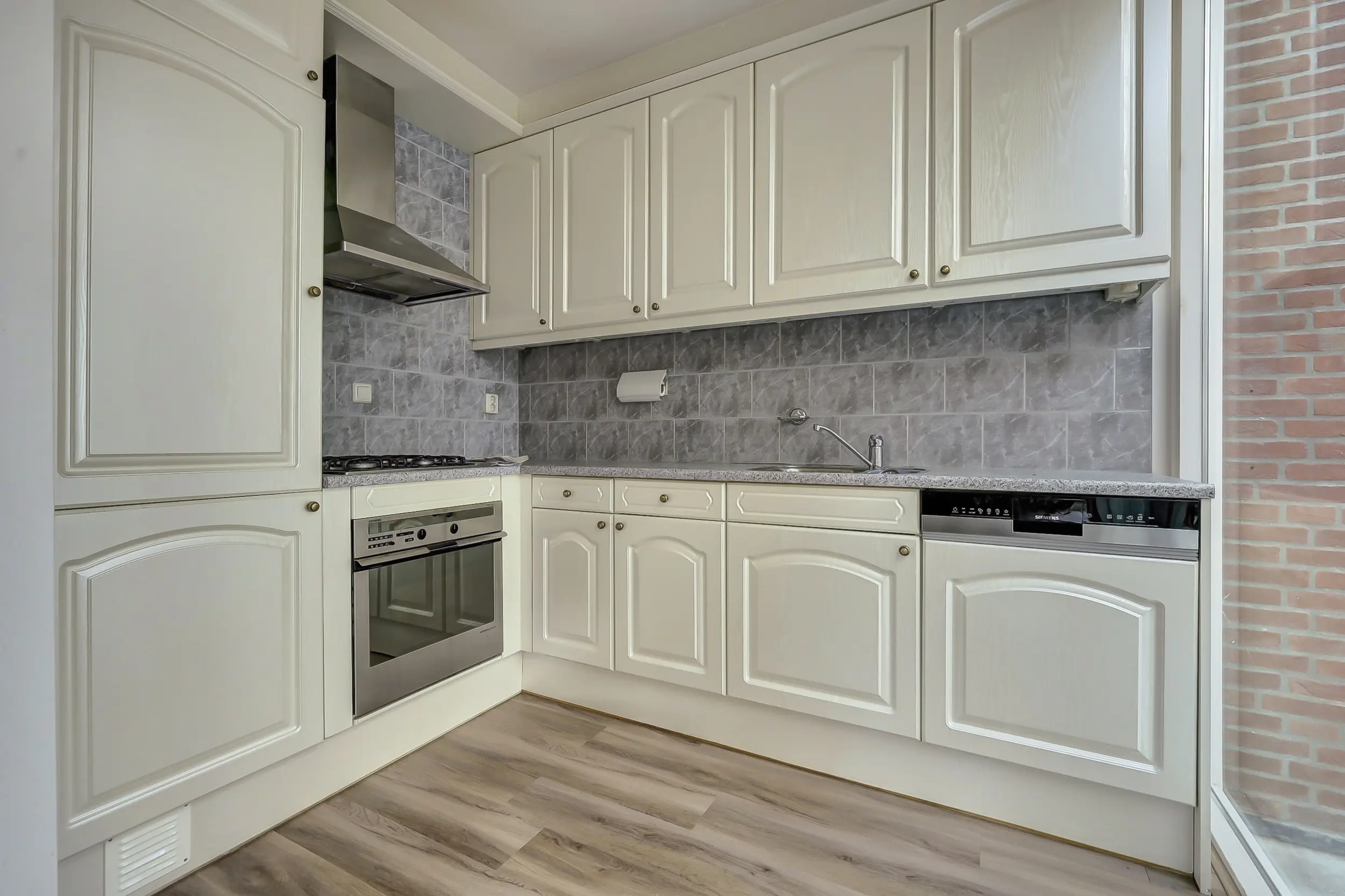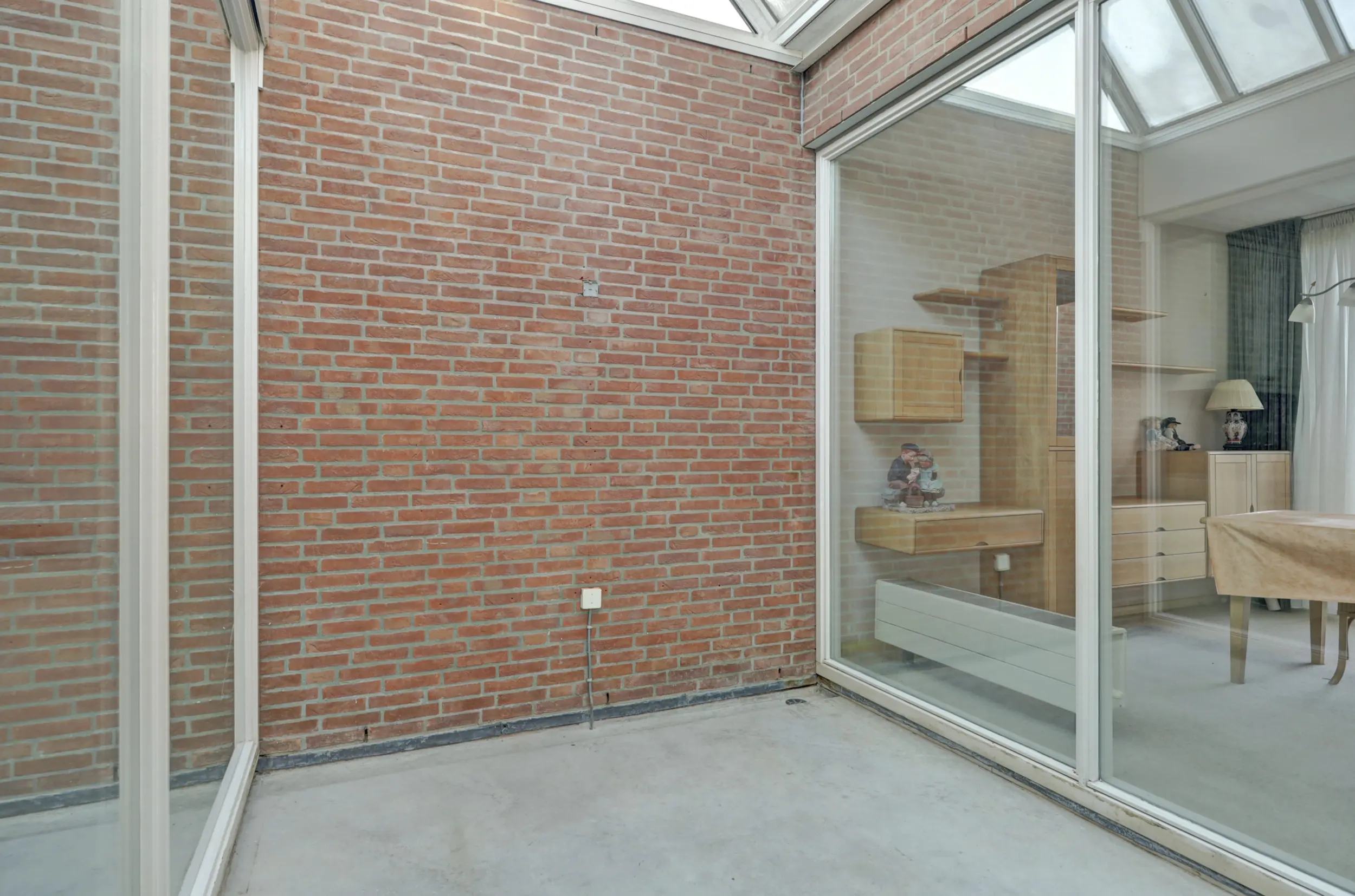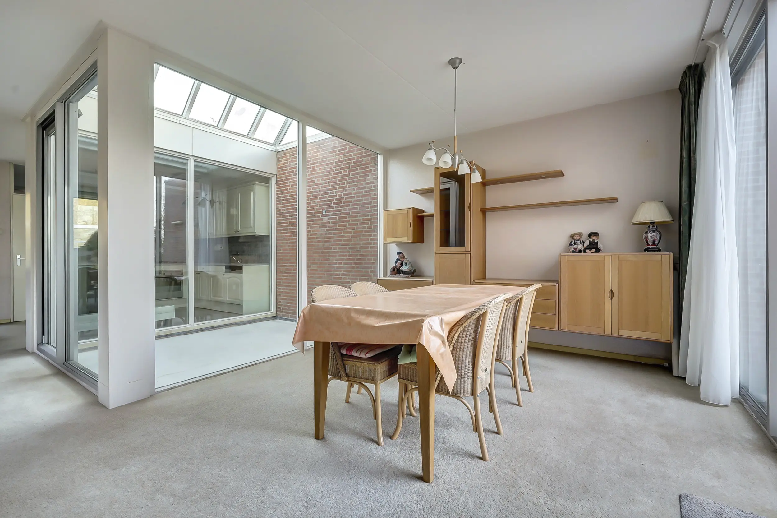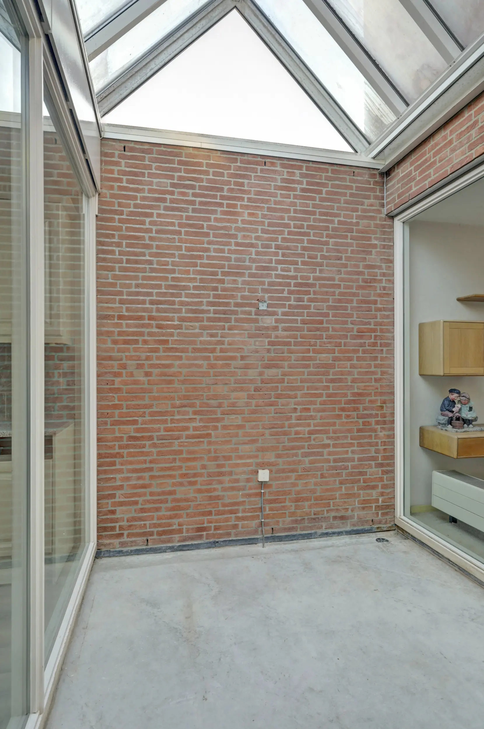Open keuken in een hoekopstelling voorzien van een gaskookplaat met afzuigkap, oven, vaatwasser en een koel,-vriescombinatie. Een heerlijke lichte woonkamer in een L-opstelling met een schuifpui naar de tuin/terras. Trapkast met de opstelling van de c.v. ketel en de unit van de mechanische ventilatie. De voormalige patio in het midden van de woning is een binnenplaatsje met een overkapping van glas. De slaapkamer is aan de achterzijde gelegen. Naast de slaapkamer ligt de badkamer met inloopdouche, wastafelmeubel, toilet en mechanische ventilatie.