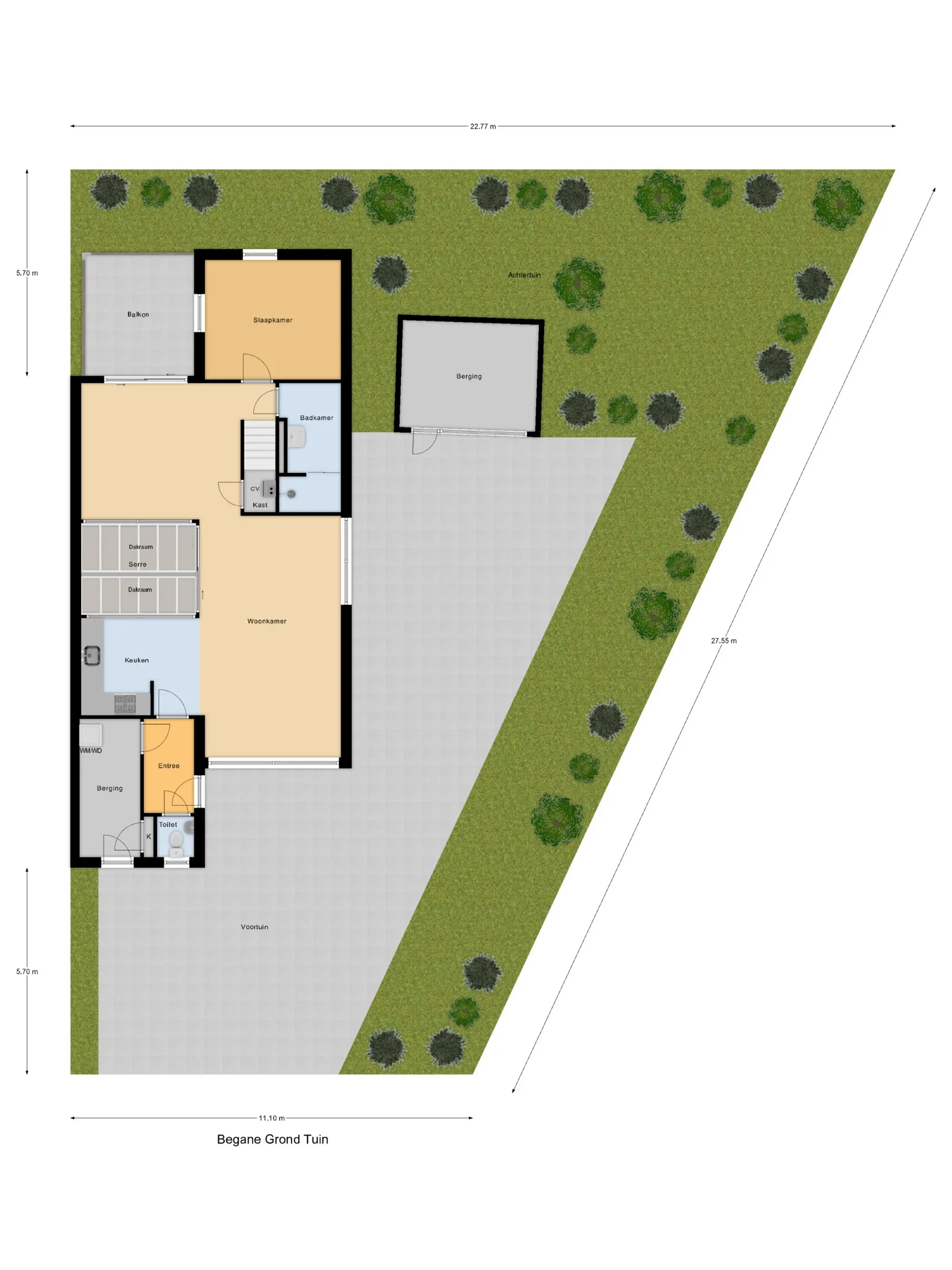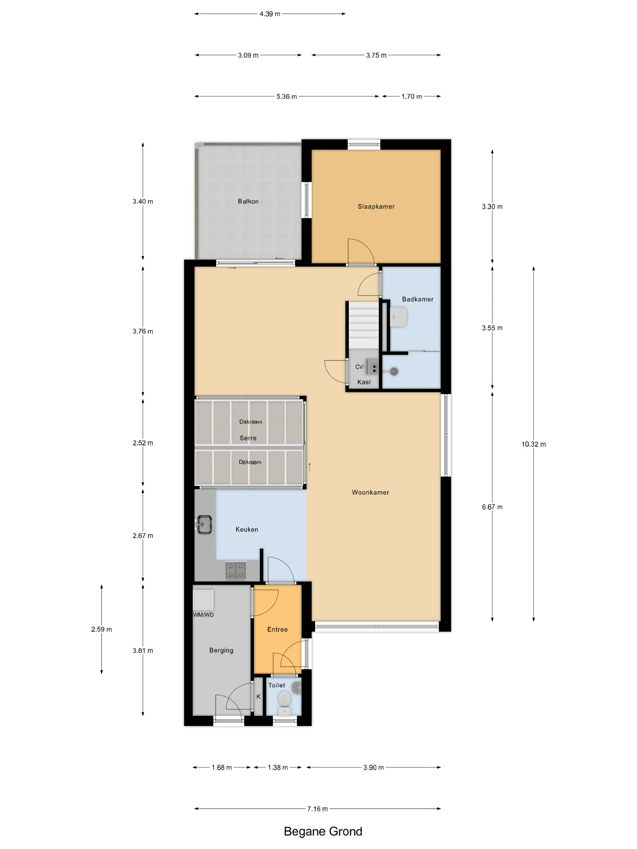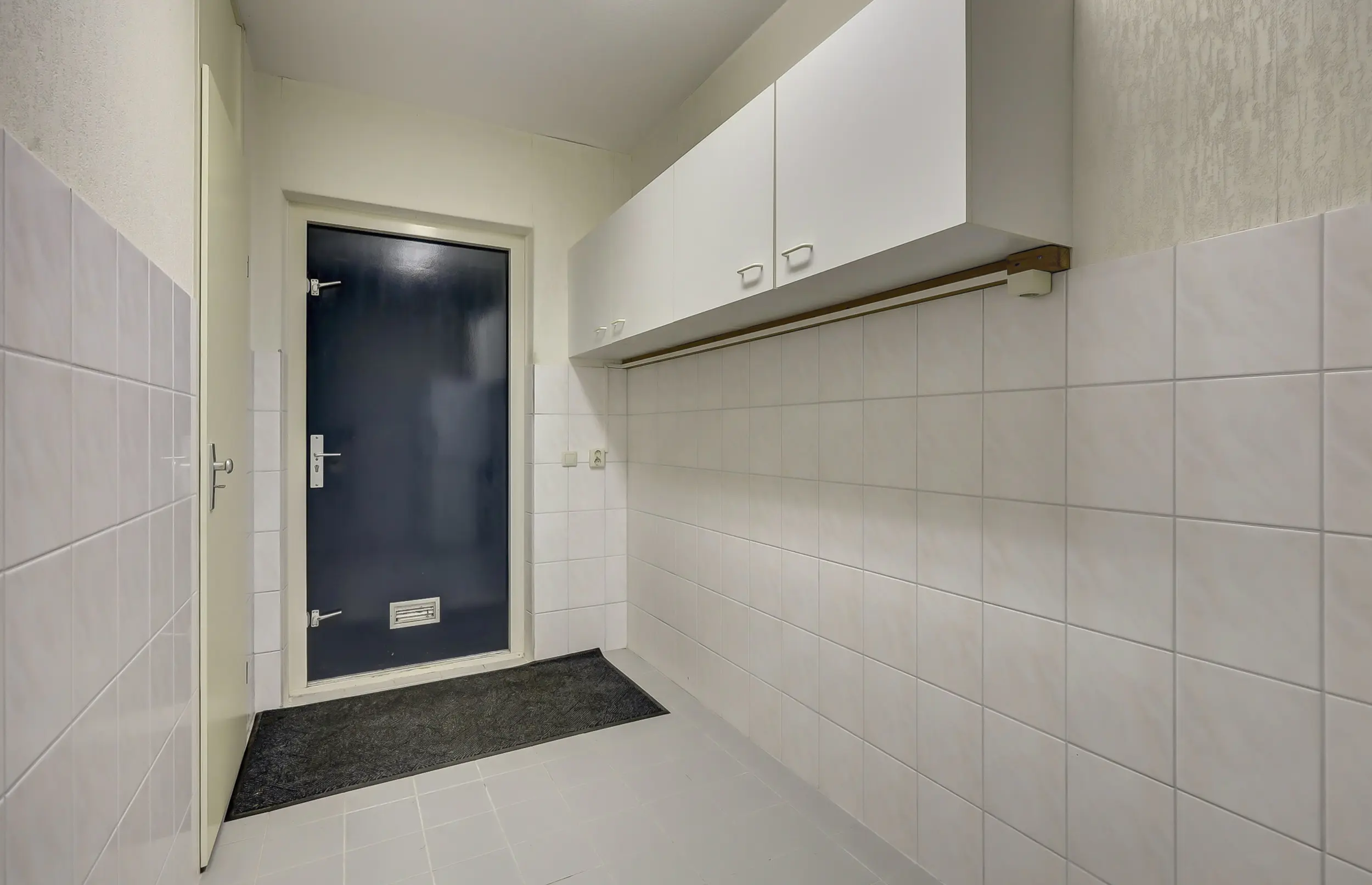 Via de voortuin met eigen oprit is de woning bereikbaar. Ruime entree met volledig betegeld toilet met fonteintje en mechanische ventilatie. Toegang naar de inpandige berging welke tevens ook buitenom bereikbaar is. Deze biedt plaats aan de wasmachine,-en droger aansluiting. De meterkast bevindt zich in een aparte kast. De vloer is afgewerkt met plavuizen.