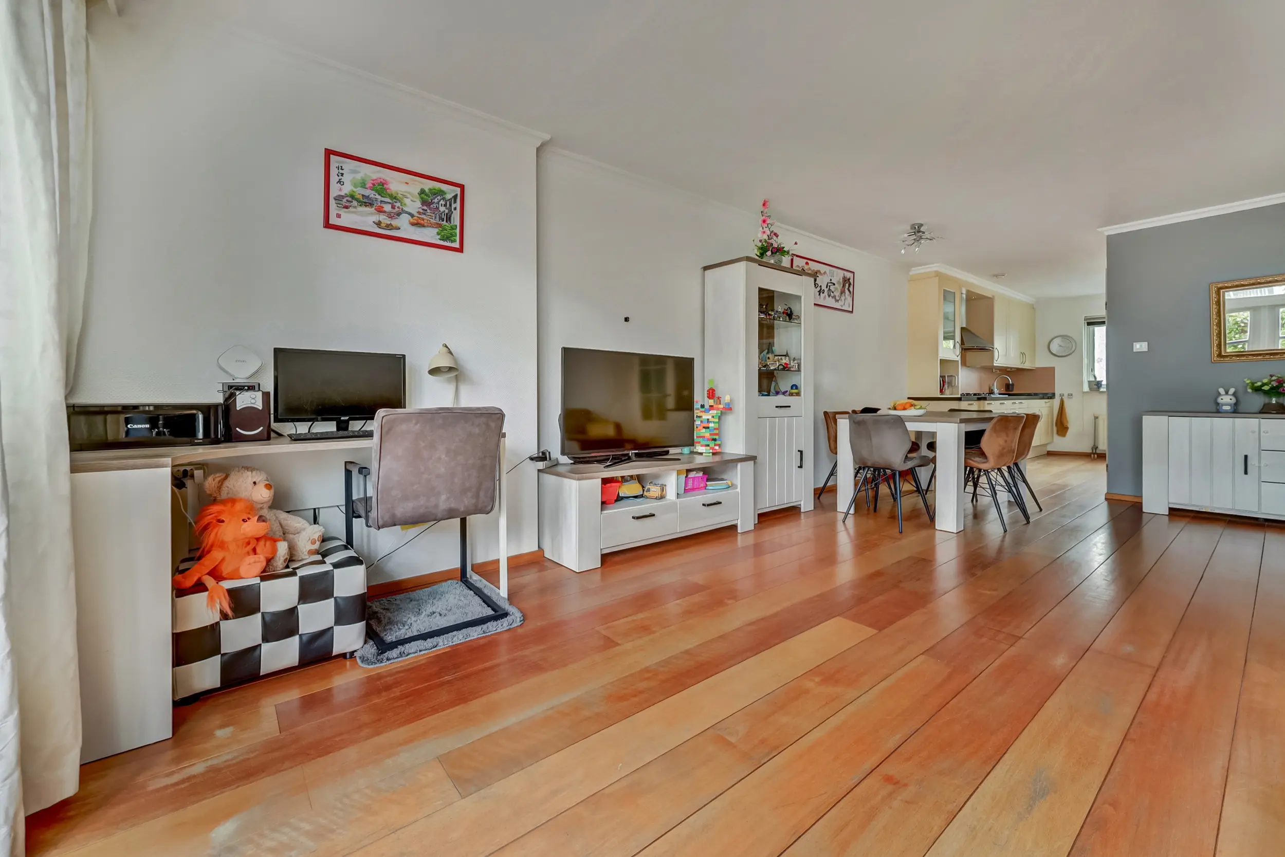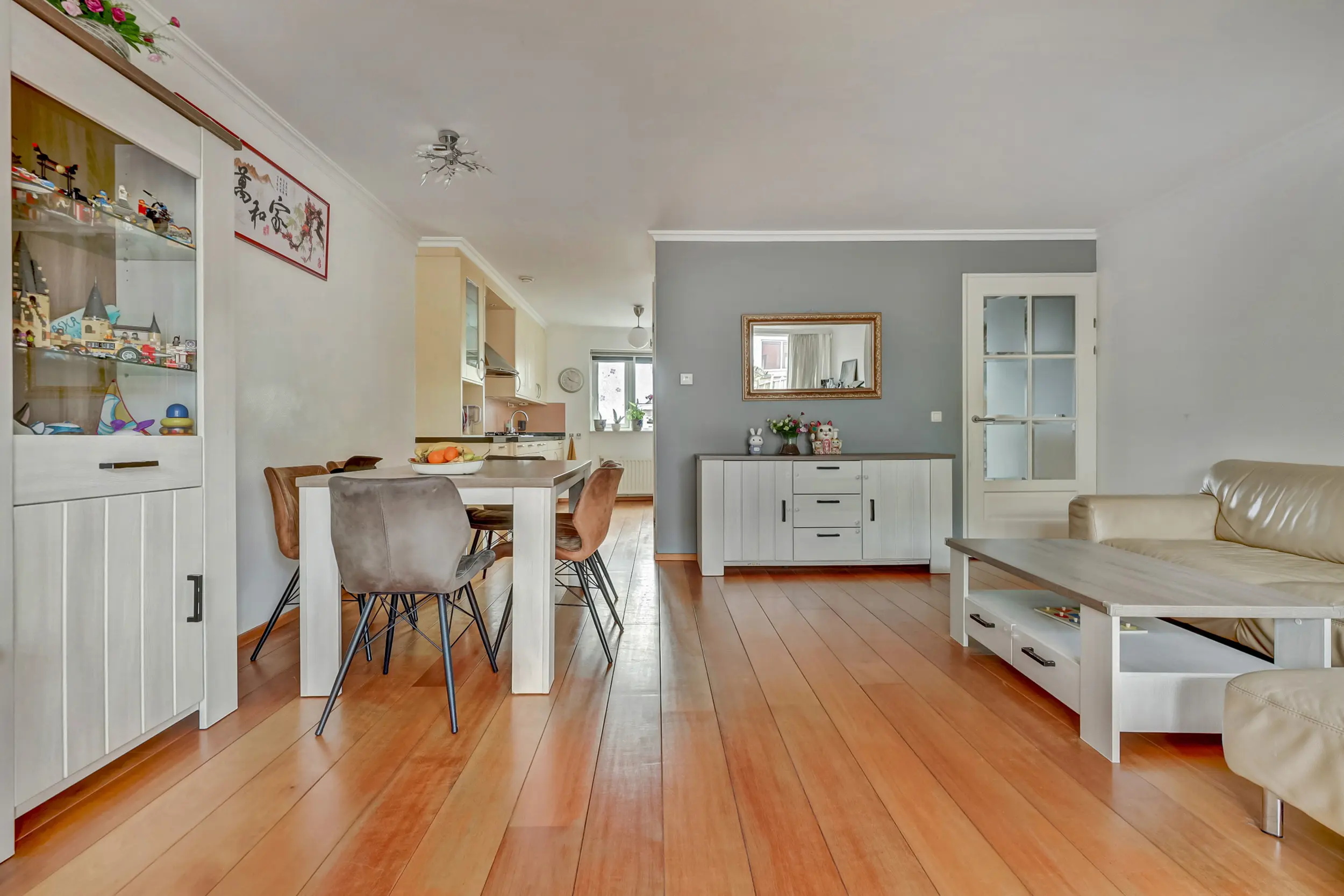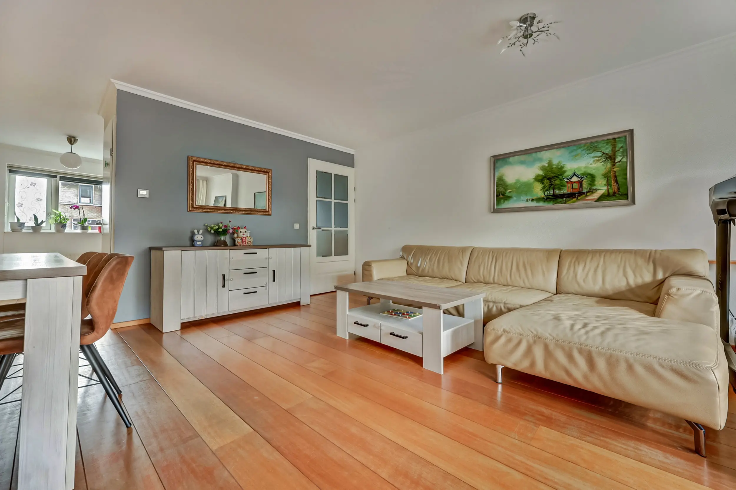 Entree/hal met meterkast en toilet met fontein. De woonkamer is zeer ruim mede door de aangebrachte uitbouw aan de achterzijde met openslaande deuren naar de tuin. De vloer is afgewerkt met een massieve houten vloer (Robijn).