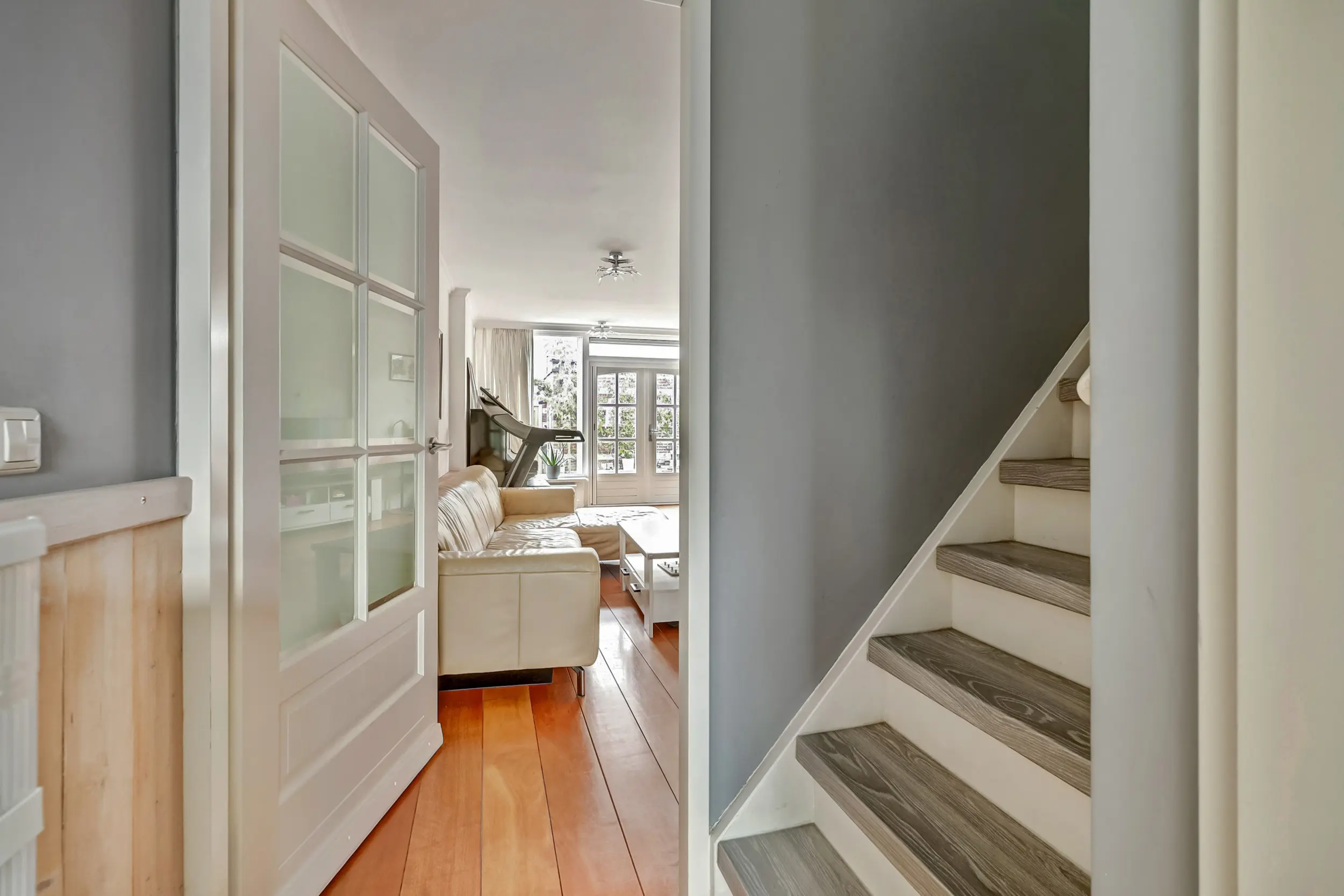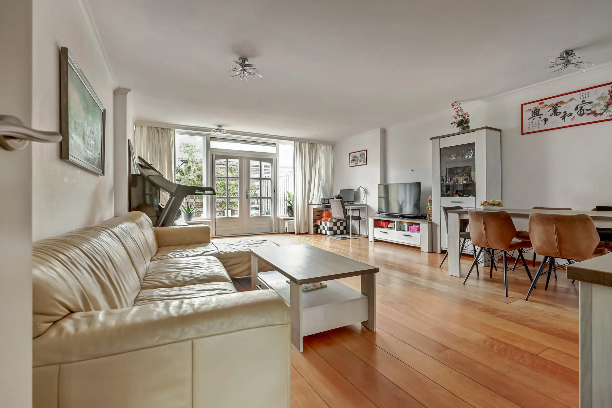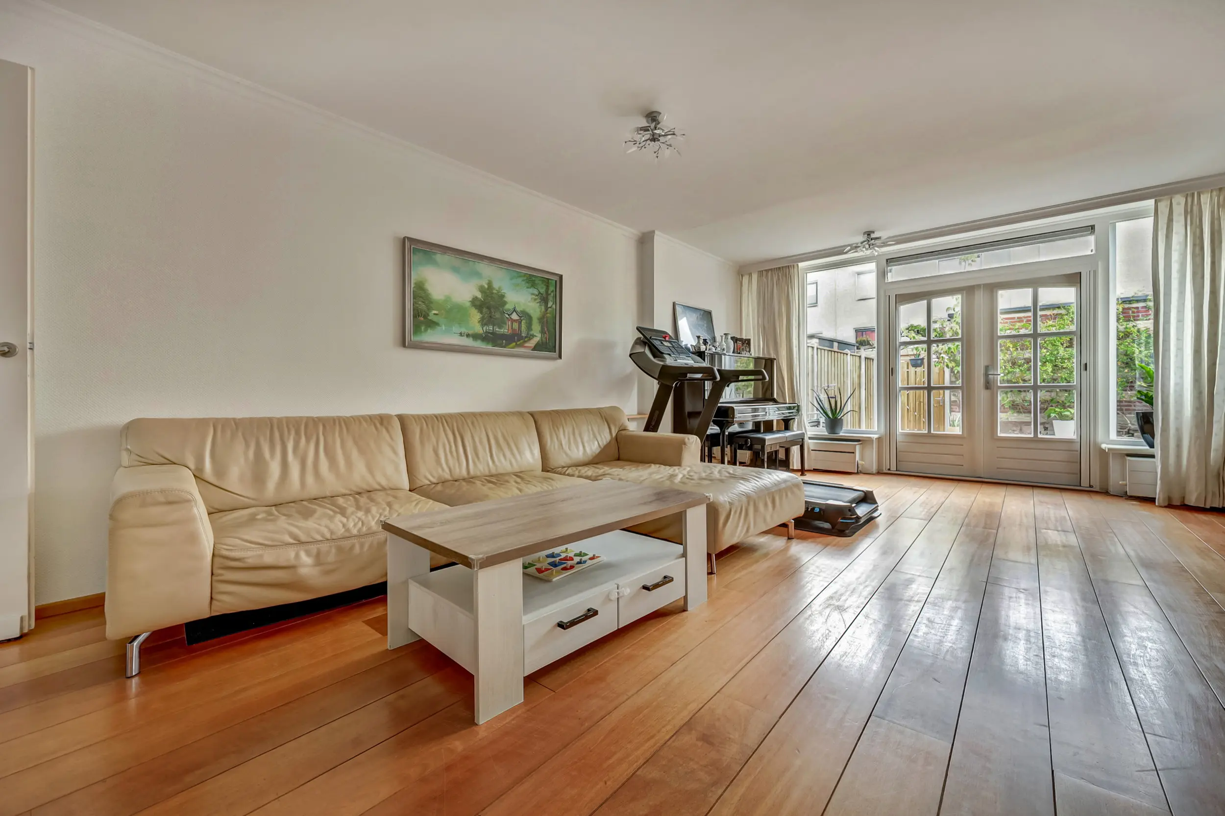 Entree/hal met meterkast en toilet met fontein. De woonkamer is zeer ruim mede door de aangebrachte uitbouw aan de achterzijde met openslaande deuren naar de tuin. De vloer is afgewerkt met een massieve houten vloer (Robijn).