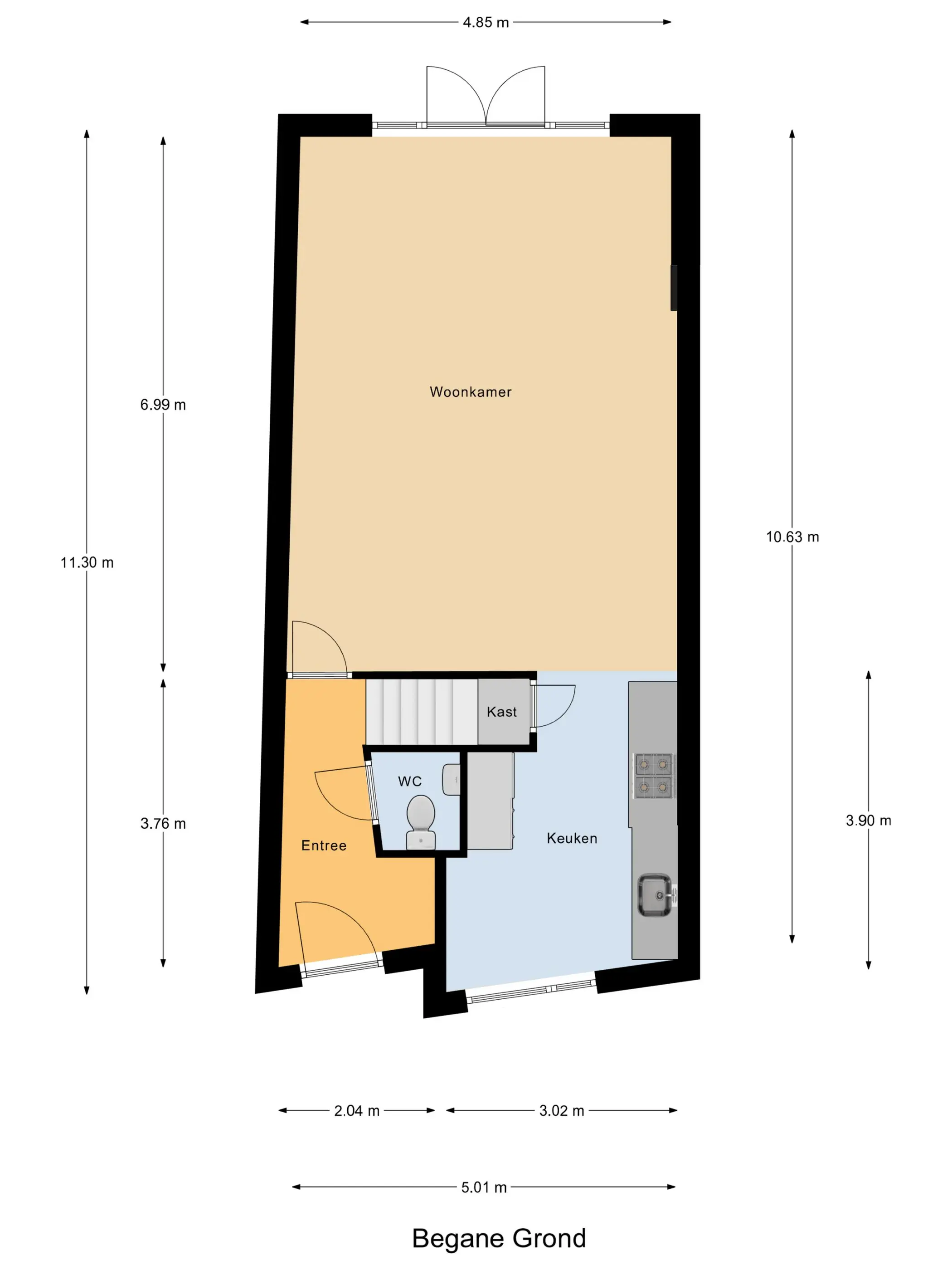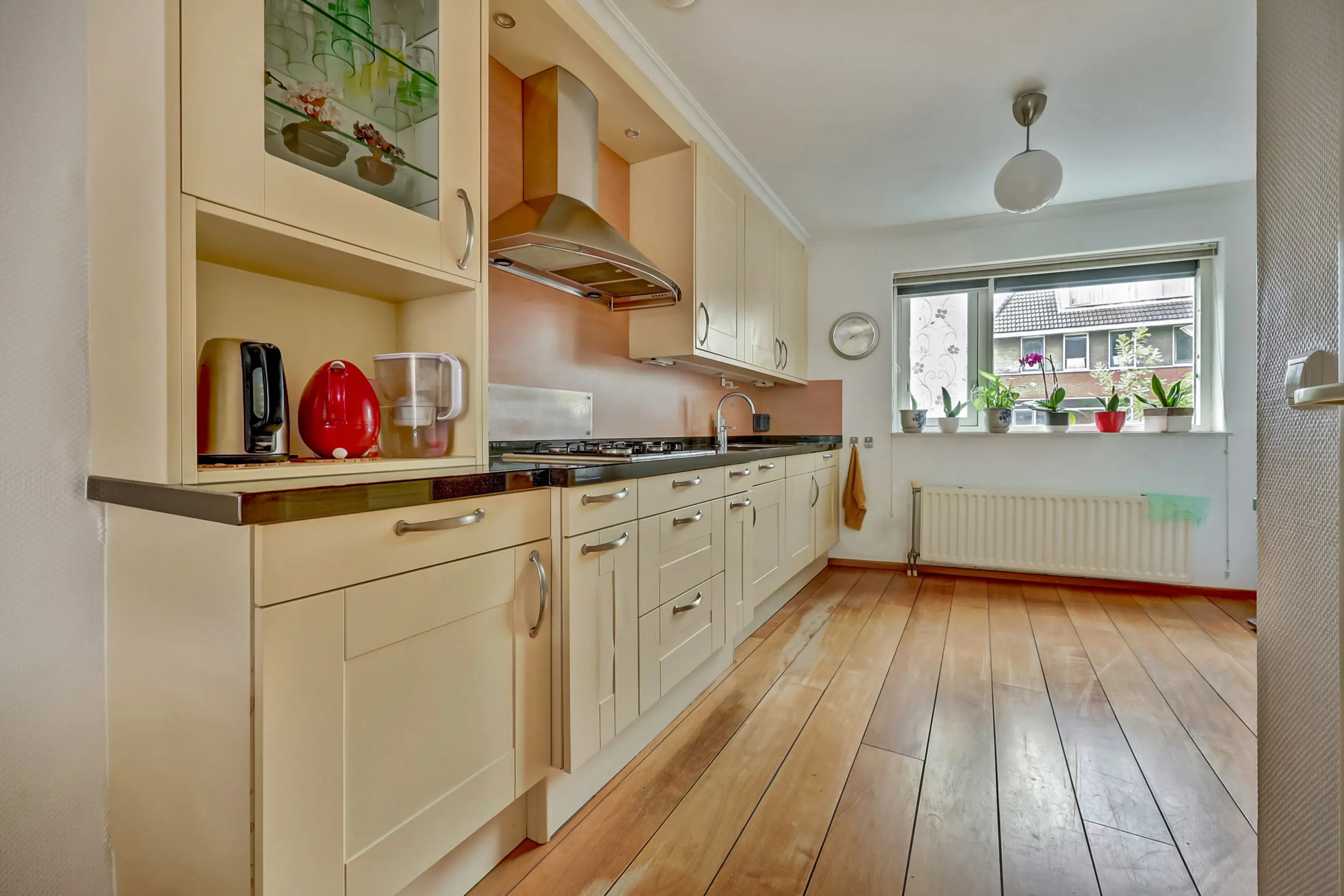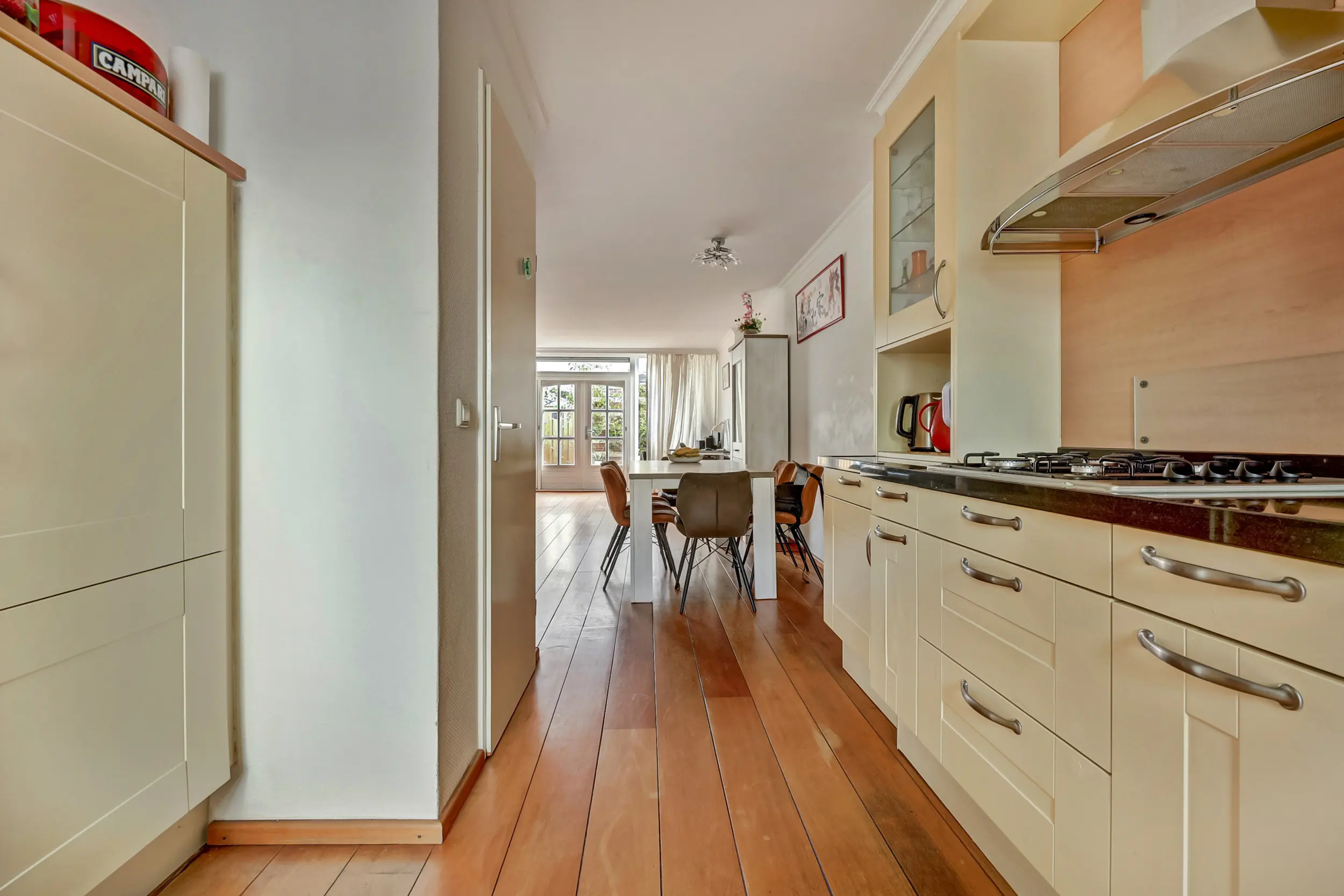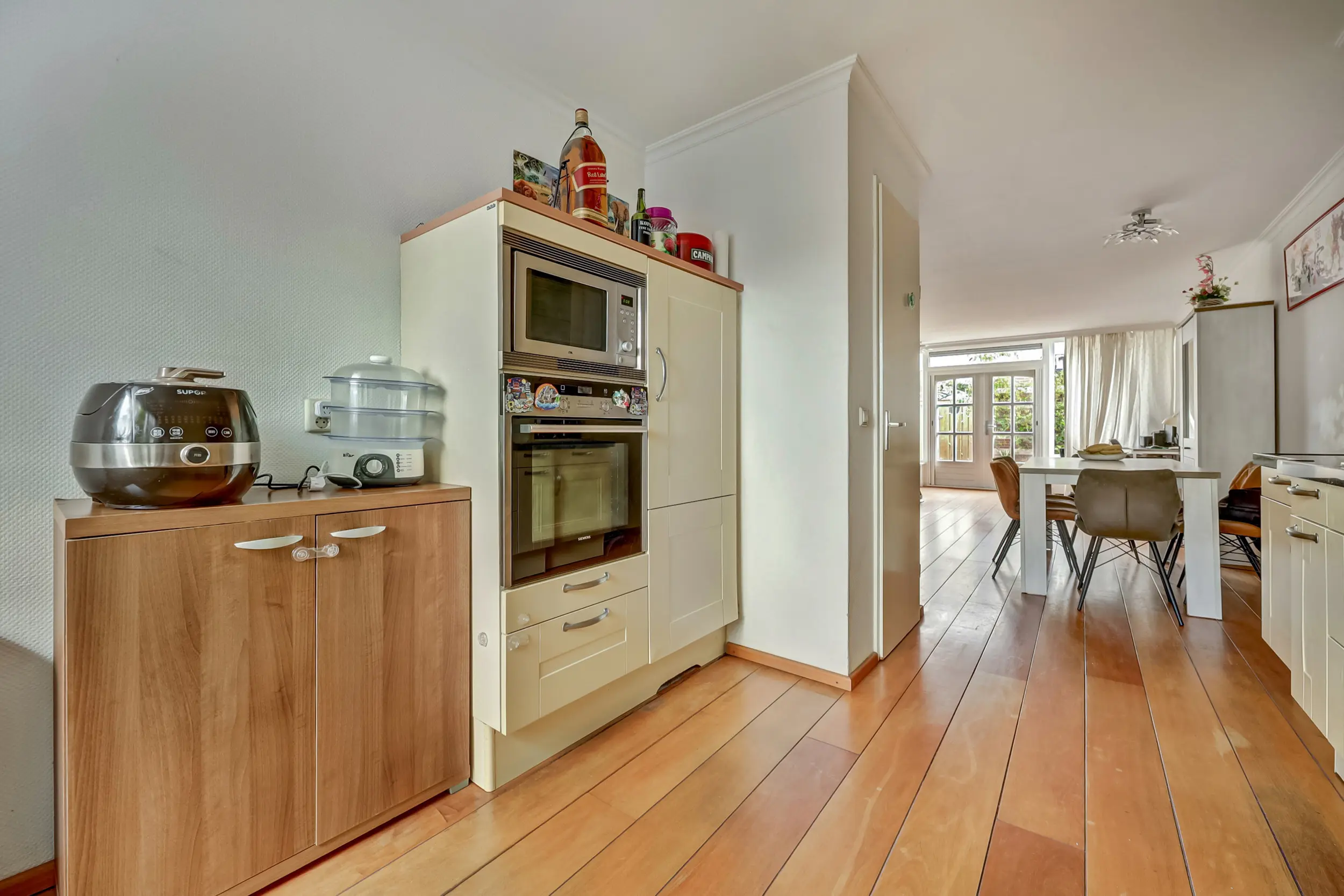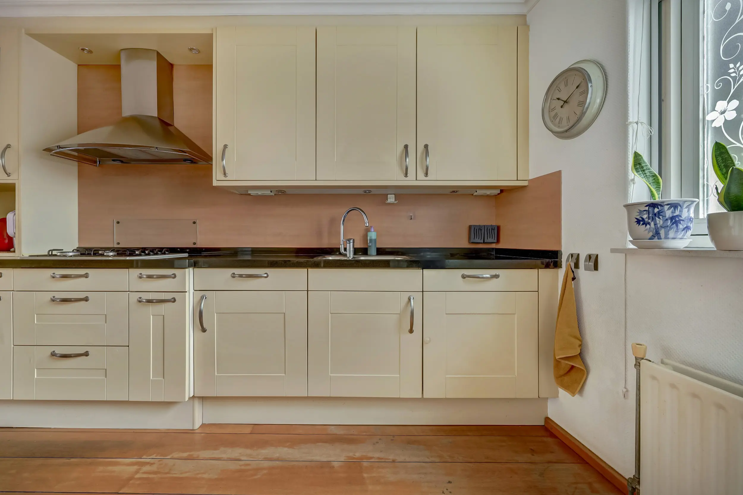 Aan de voorzijde ligt de open keuken welke beschikt over een gaskookplaat, oven, afzuigkap, magnetron, koelkast, vaatwasser en close-in boiler. De diepe trapkast biedt voldoende ruimte voor de voorraad.