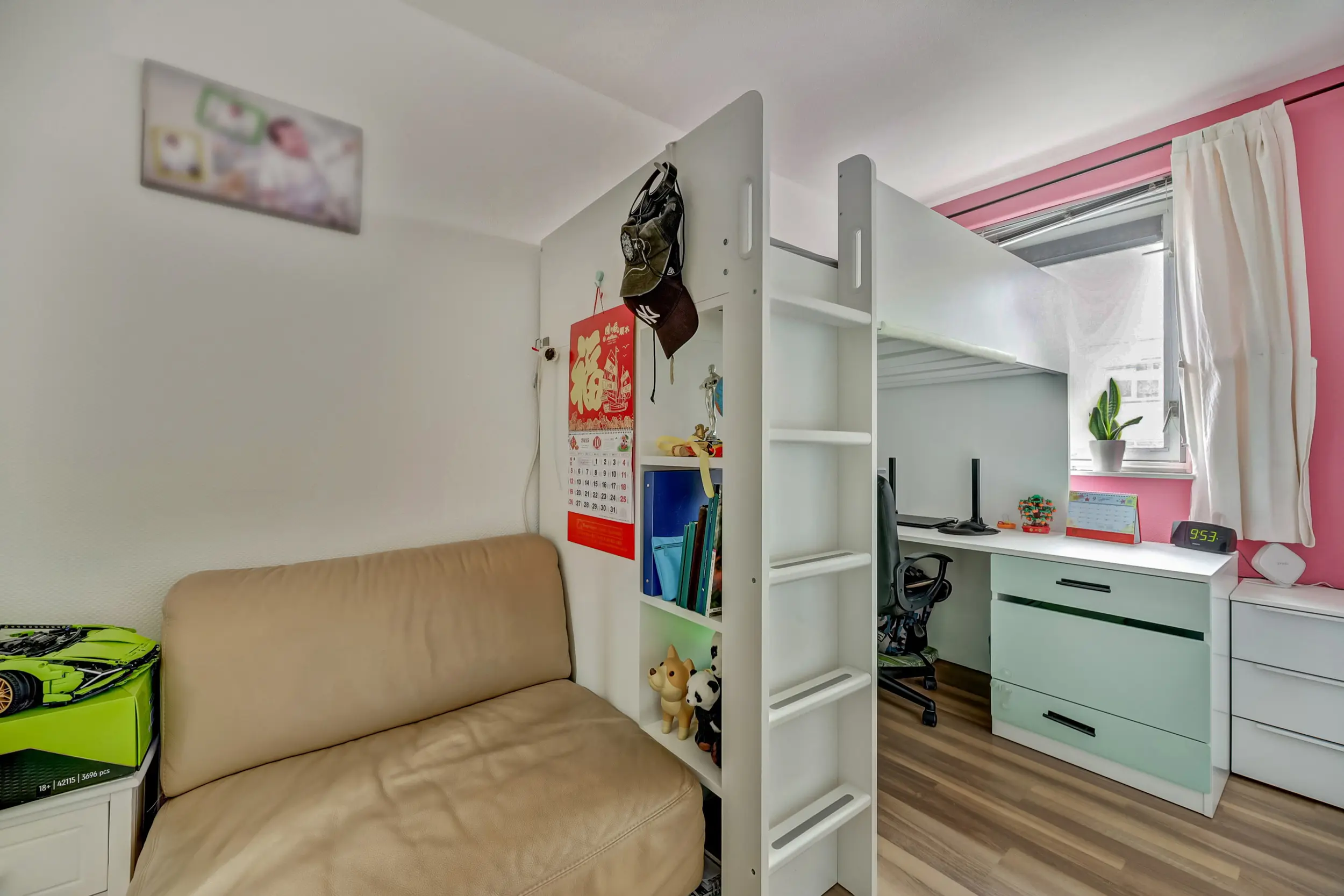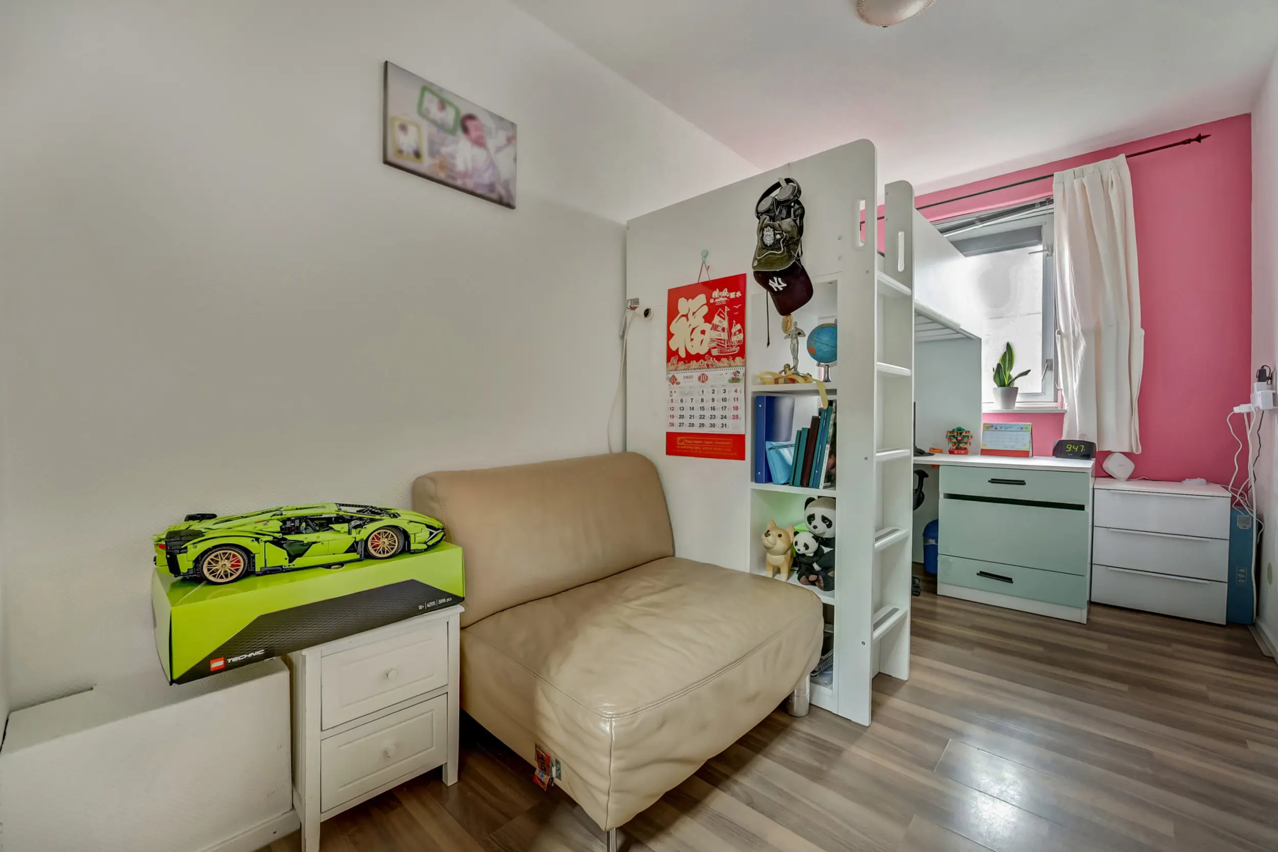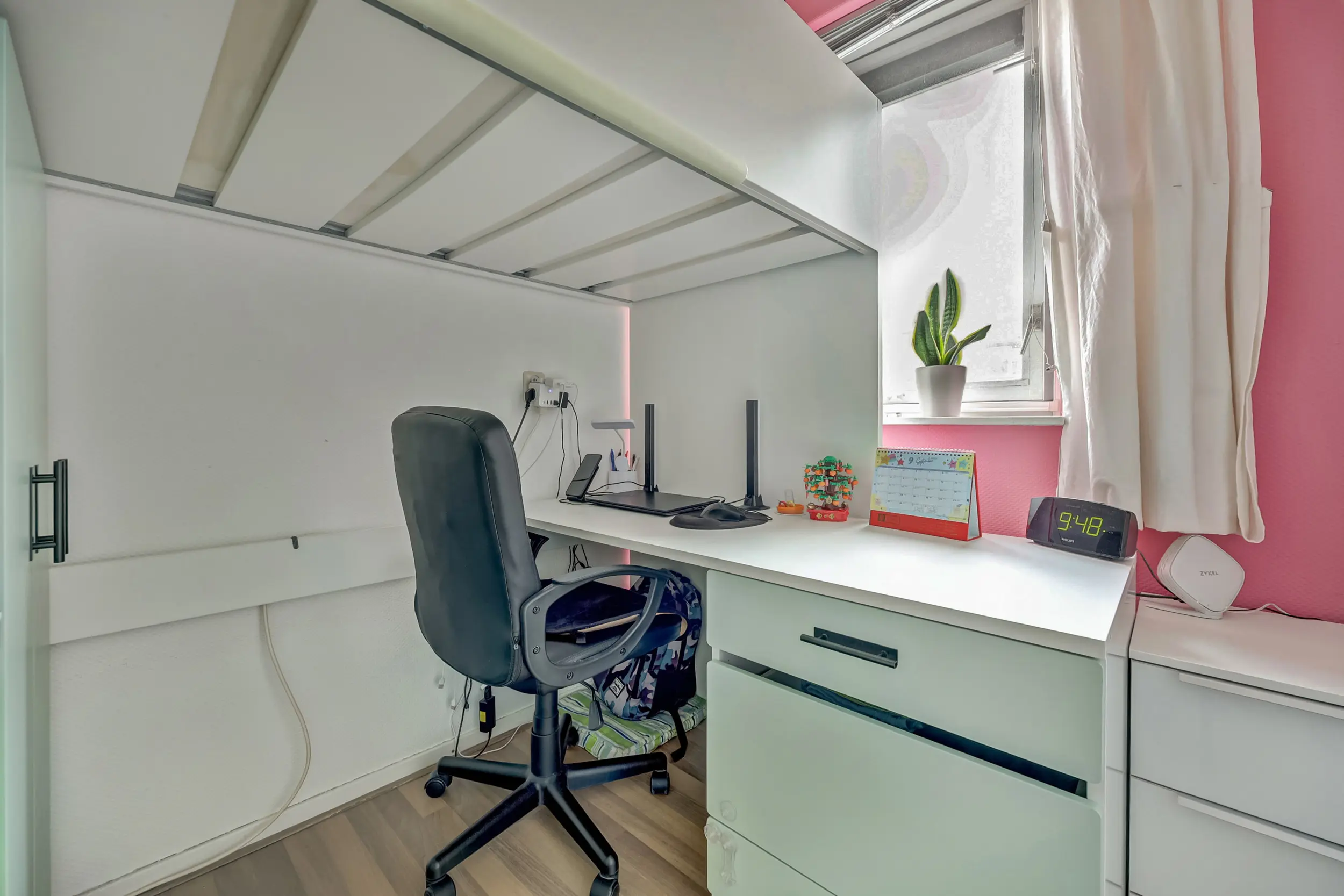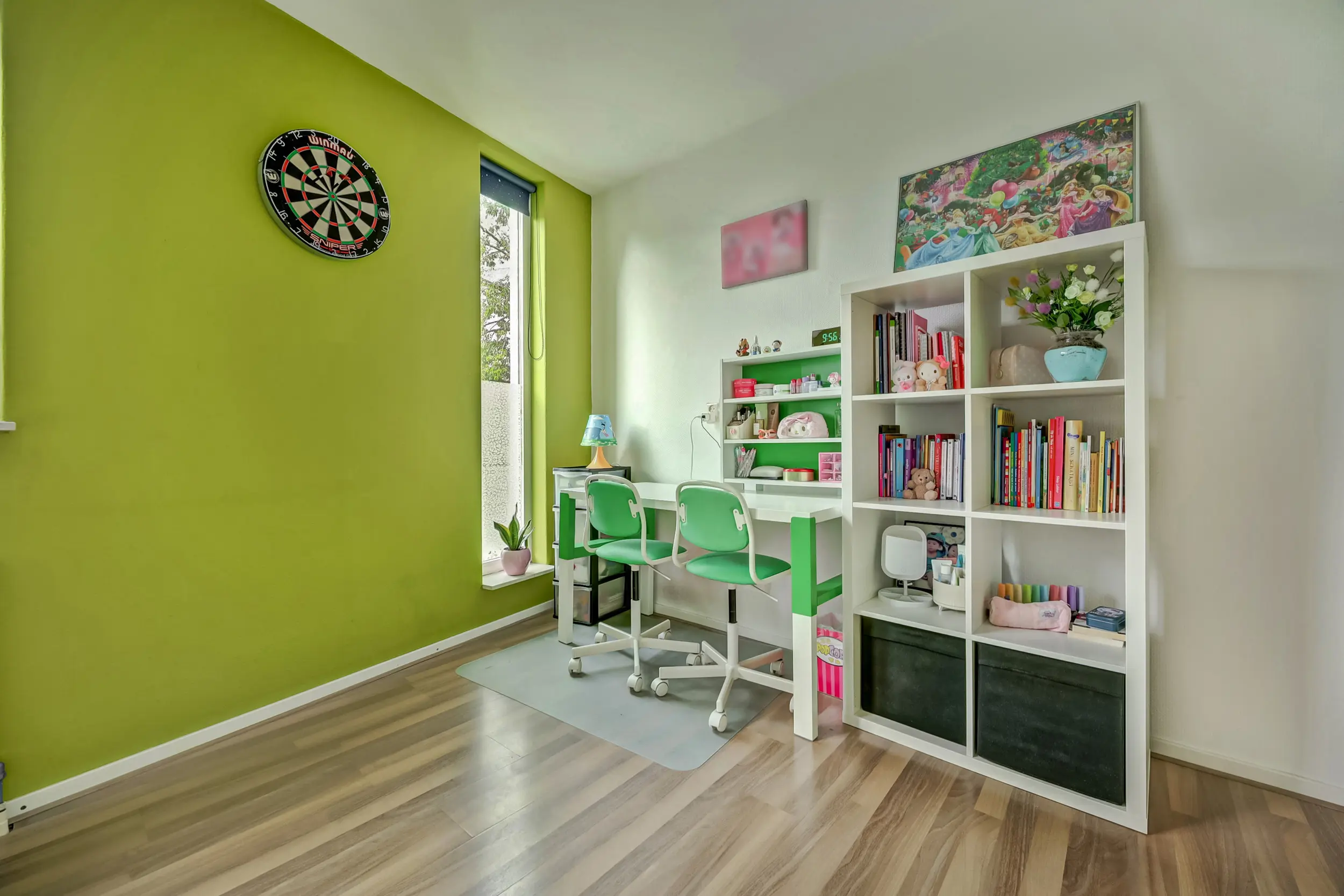 Een aangename ruimte welke eveneens is afgewerkt met een laminaatvloer en behang.