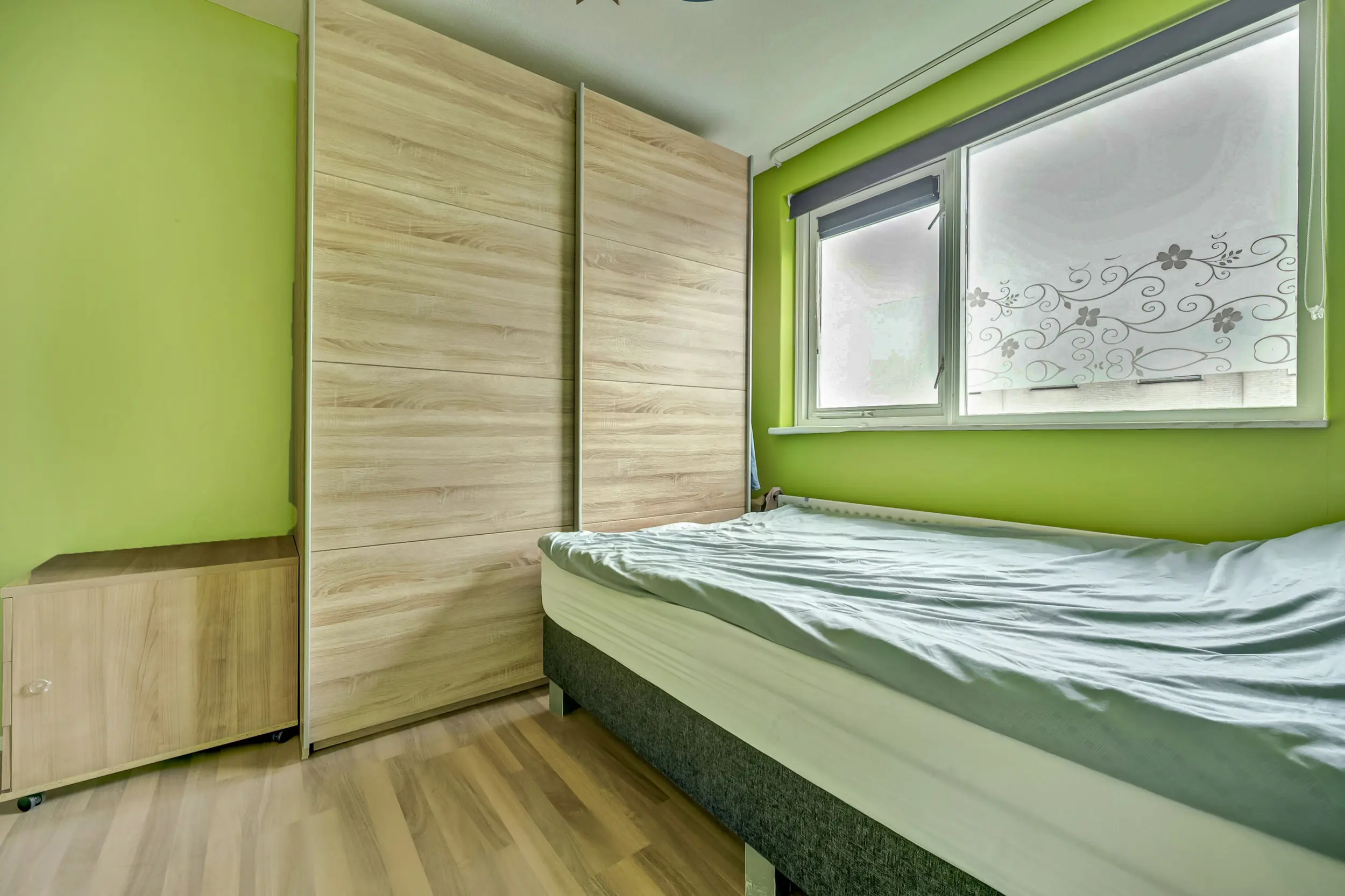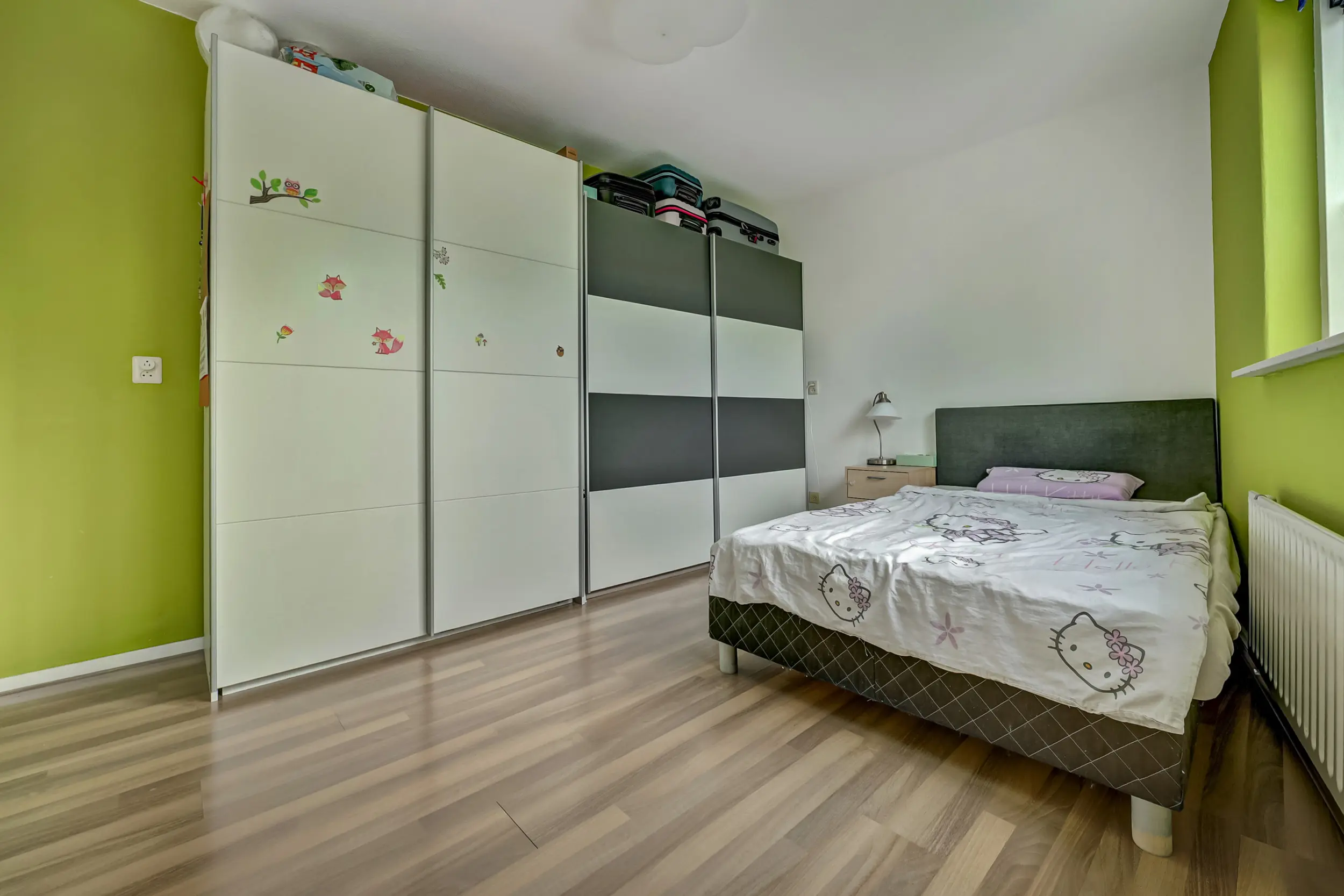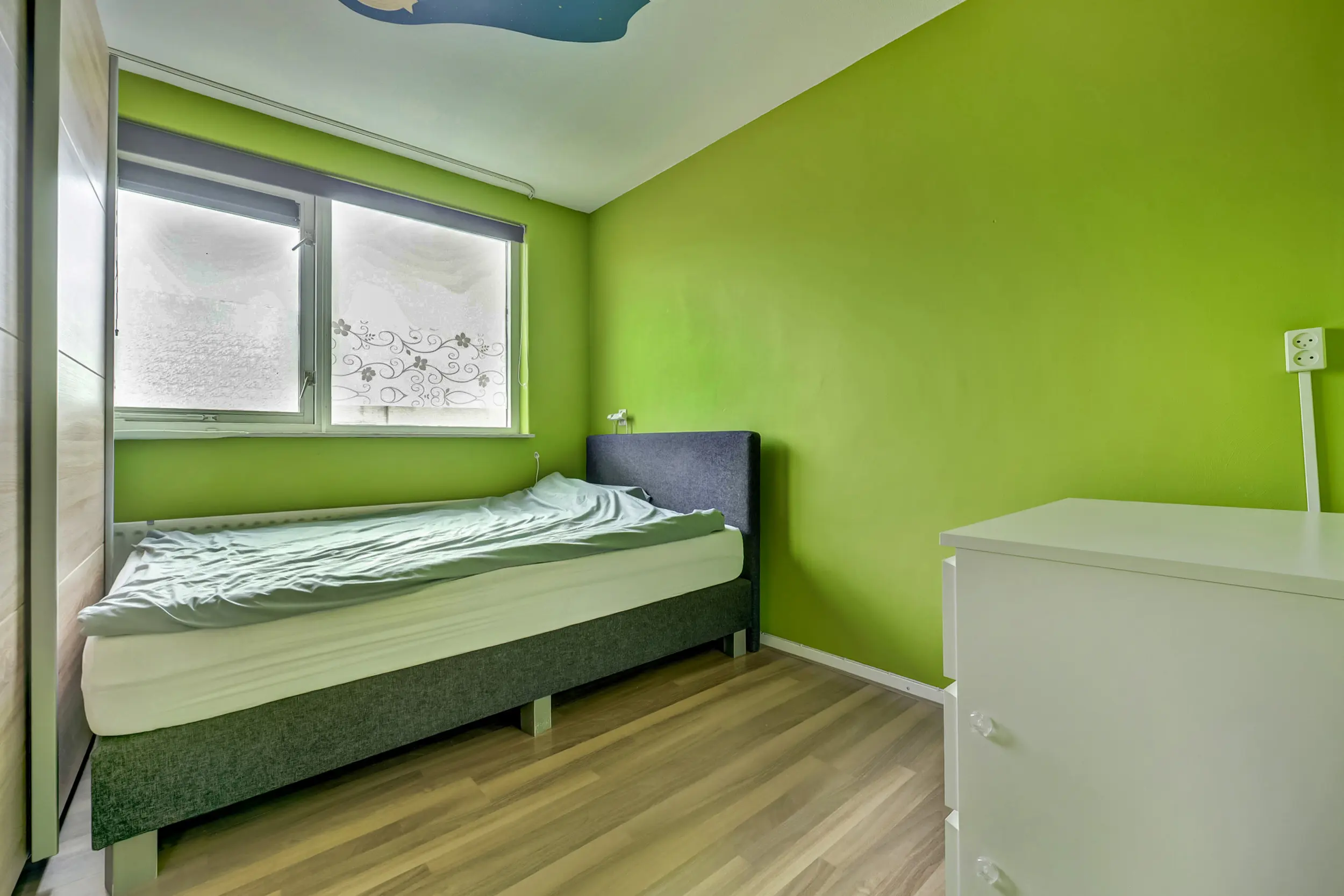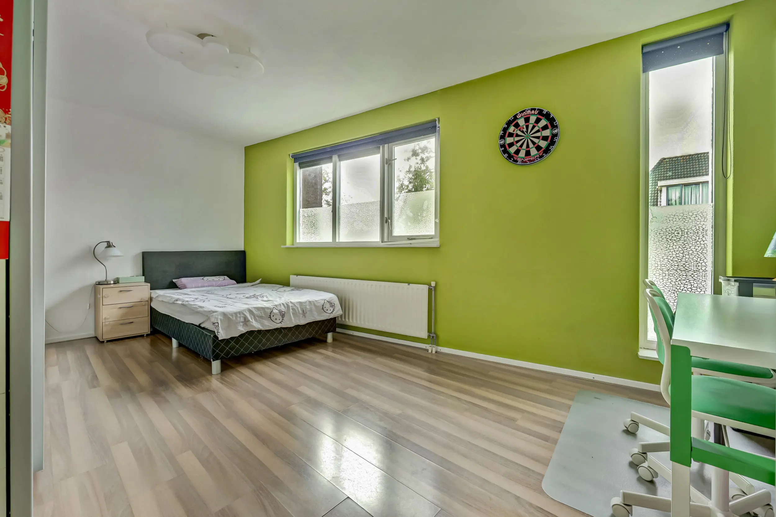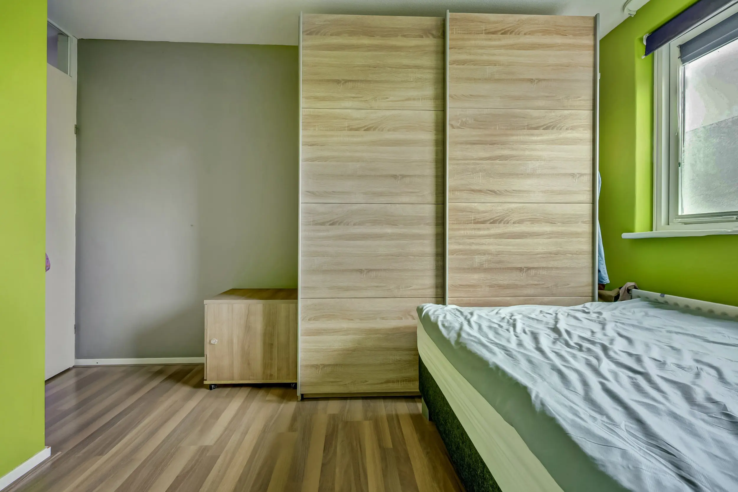 Aan de voorzijde van de woning ligt de hoofdslaapkamer, de afwerking van deze slaapkamer bestaat uit een laminaatvloer en behang.