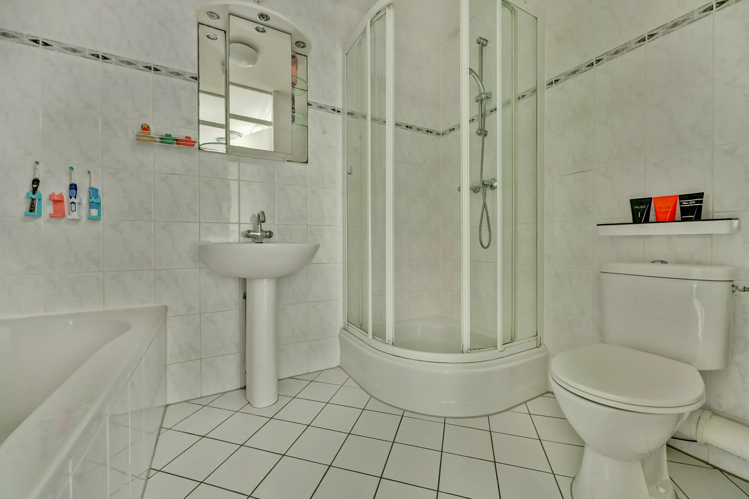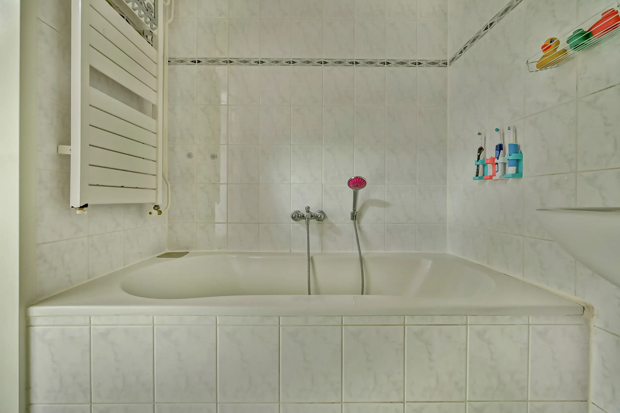 Aan de achterzijde liggen nog 2 slaapkamers, ook deze slaapkamers zijn afgewerkt met laminaat en behang. De ruime badkamer beschikt over een ligbad, douchecabine, wastafel, 2e toilet en een handdoekradiator.
