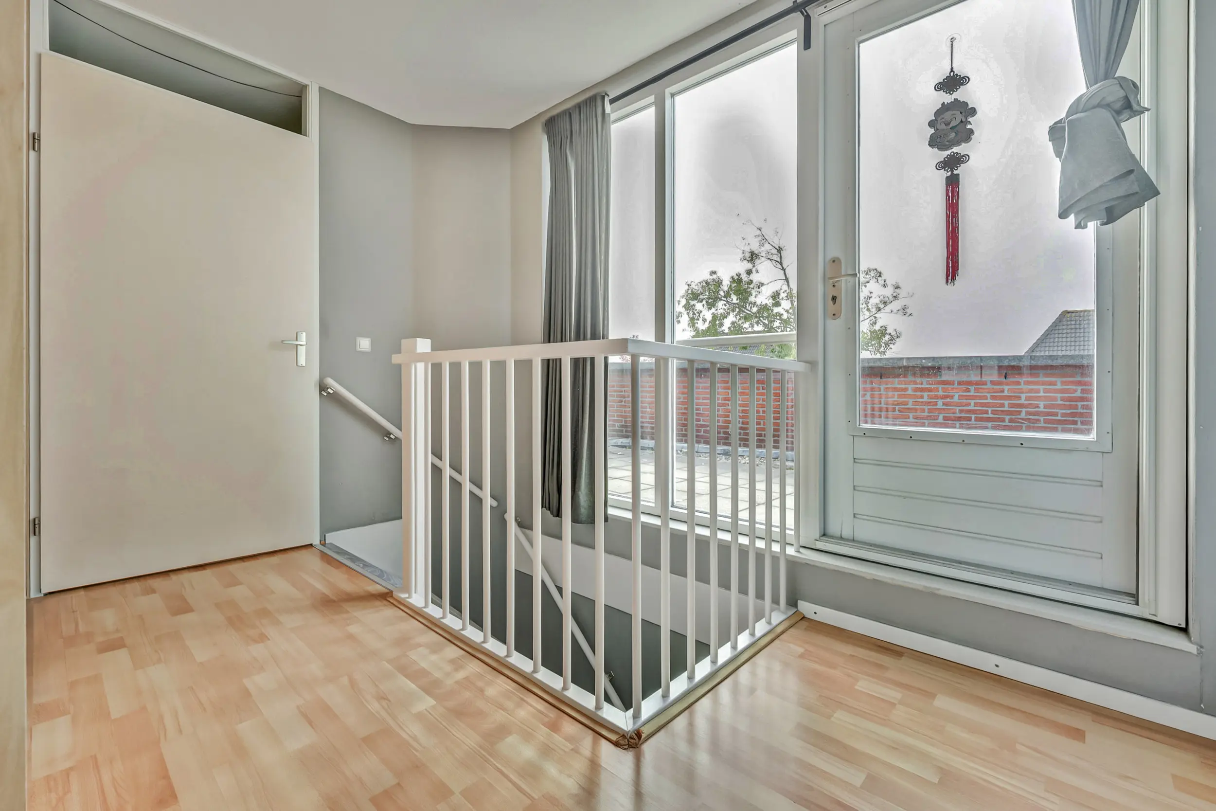 Overloop met toegang tot het heerlijke dakterras aan de voorzijde. De ligging is op het zuiden. Ook is vanaf de overloop een separate stook-/wasruimte bereikbaar. Hier vindt u de aansluitingen voor wasmachine/droger en de opstelling voor de cv-combiketel en mechanische ventilatie.