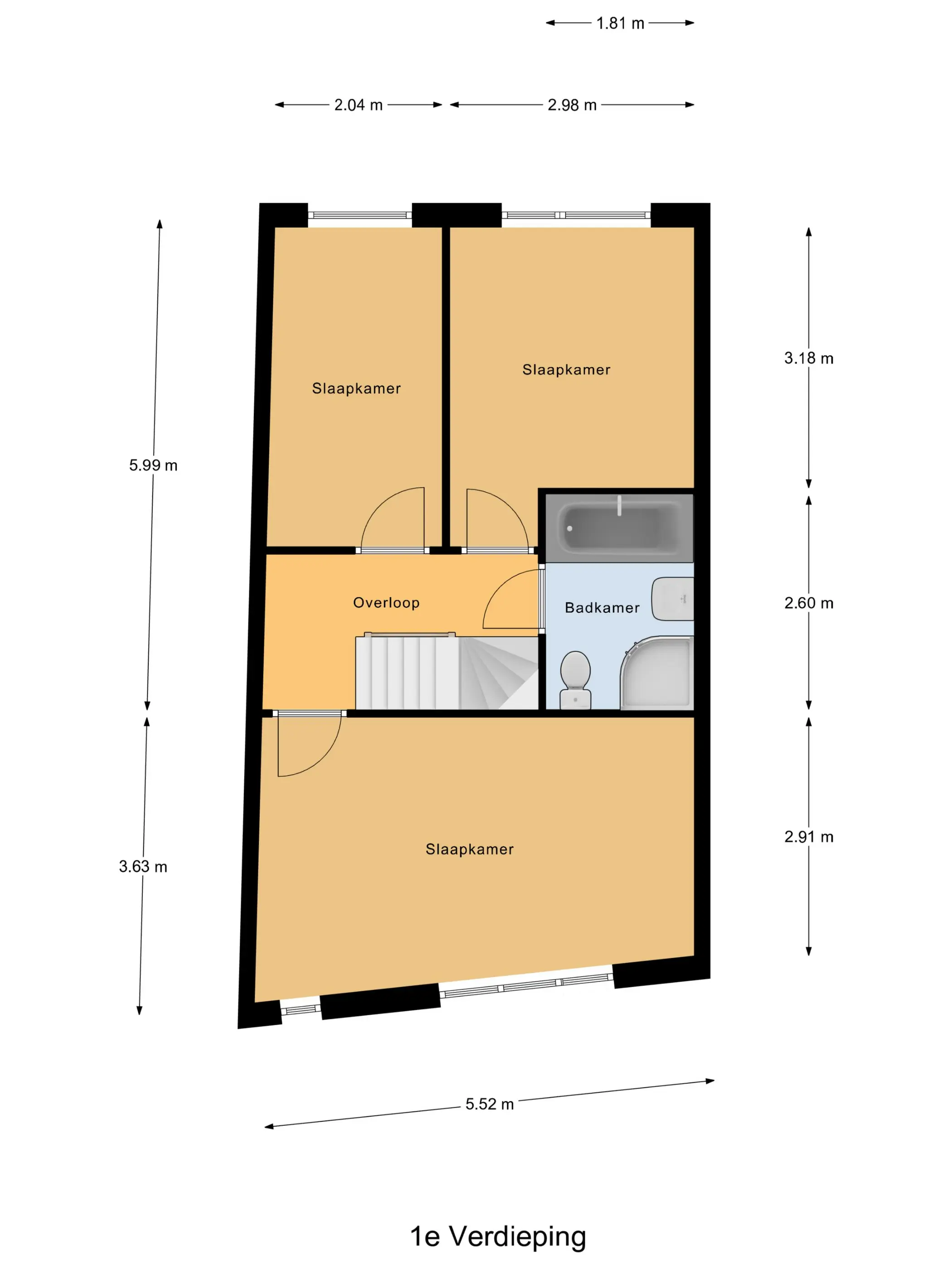 Slaapkamer I: 5,52 x 3,63/2,91m