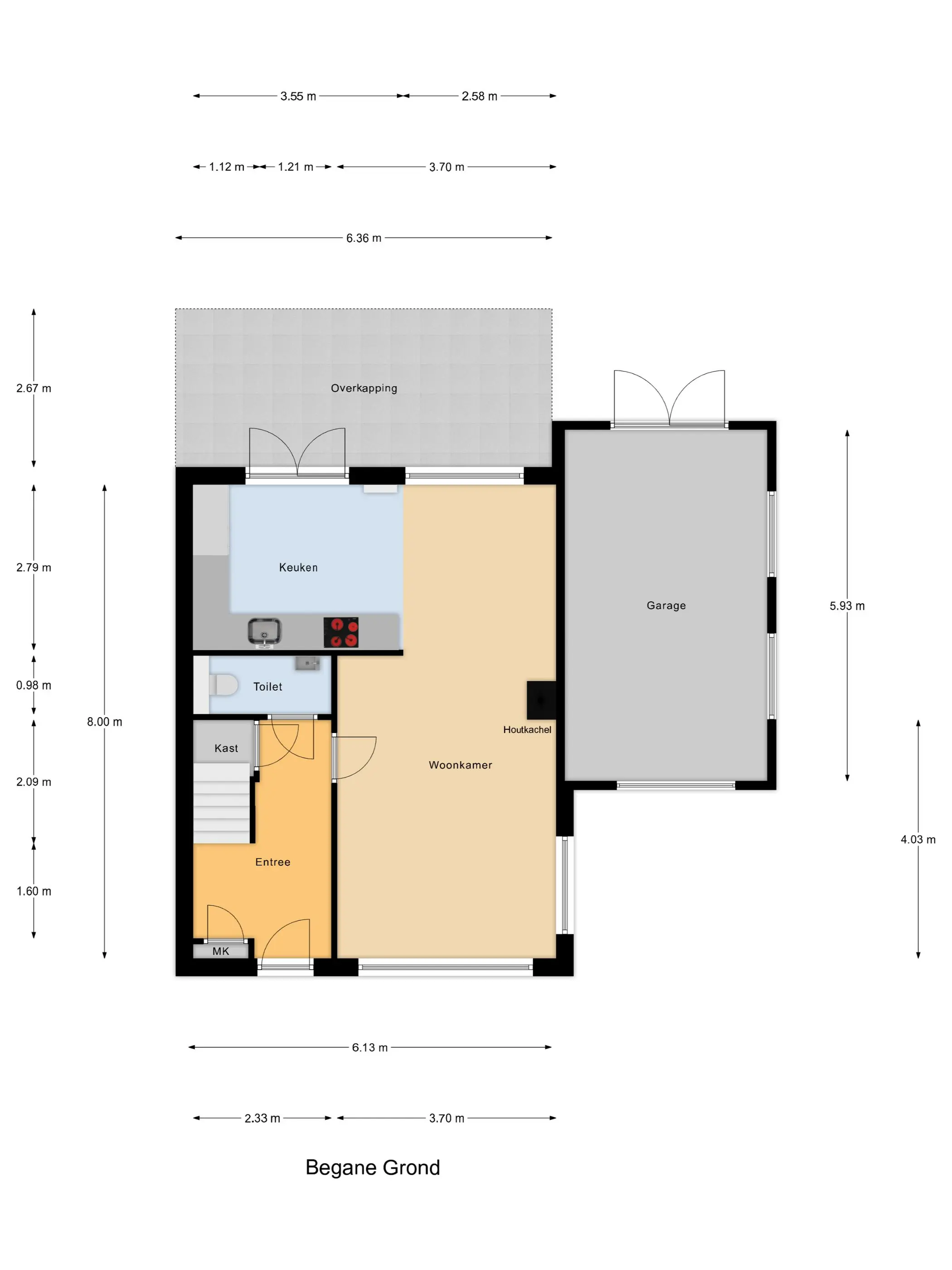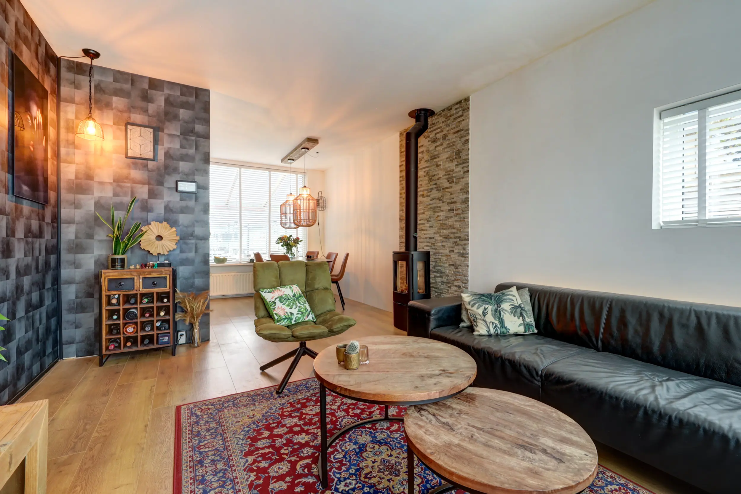 Door de nieuwe voordeur komt u in de hal, hier vind je de meterkast, een eveneens nieuwe toiletruimte welke geheel betegeld is met fontein, de trap naar de eerste verdieping en de trapkast. De woonkamer is een sfeervolle ruimte met het zitgedeelte aan de voorzijde, een houtkachel en het eetgedeelte aan de tuinzijde. De vloer is voorzien van een laminaatvloer (gehele begane grond), de wanden en plafond zijn afgewerkt met stucwerk. De open keuken geplaatst in 2023 bestaat uit een hoekopstelling en beschikt over een inductie kookplaat met afzuigschouw, combi-magnetron, vaatwasser, koelkast, vriezer, Quooker en veel lades met bergruimte. Vanuit de keuken toegang naar de tuin via dubbele deuren.