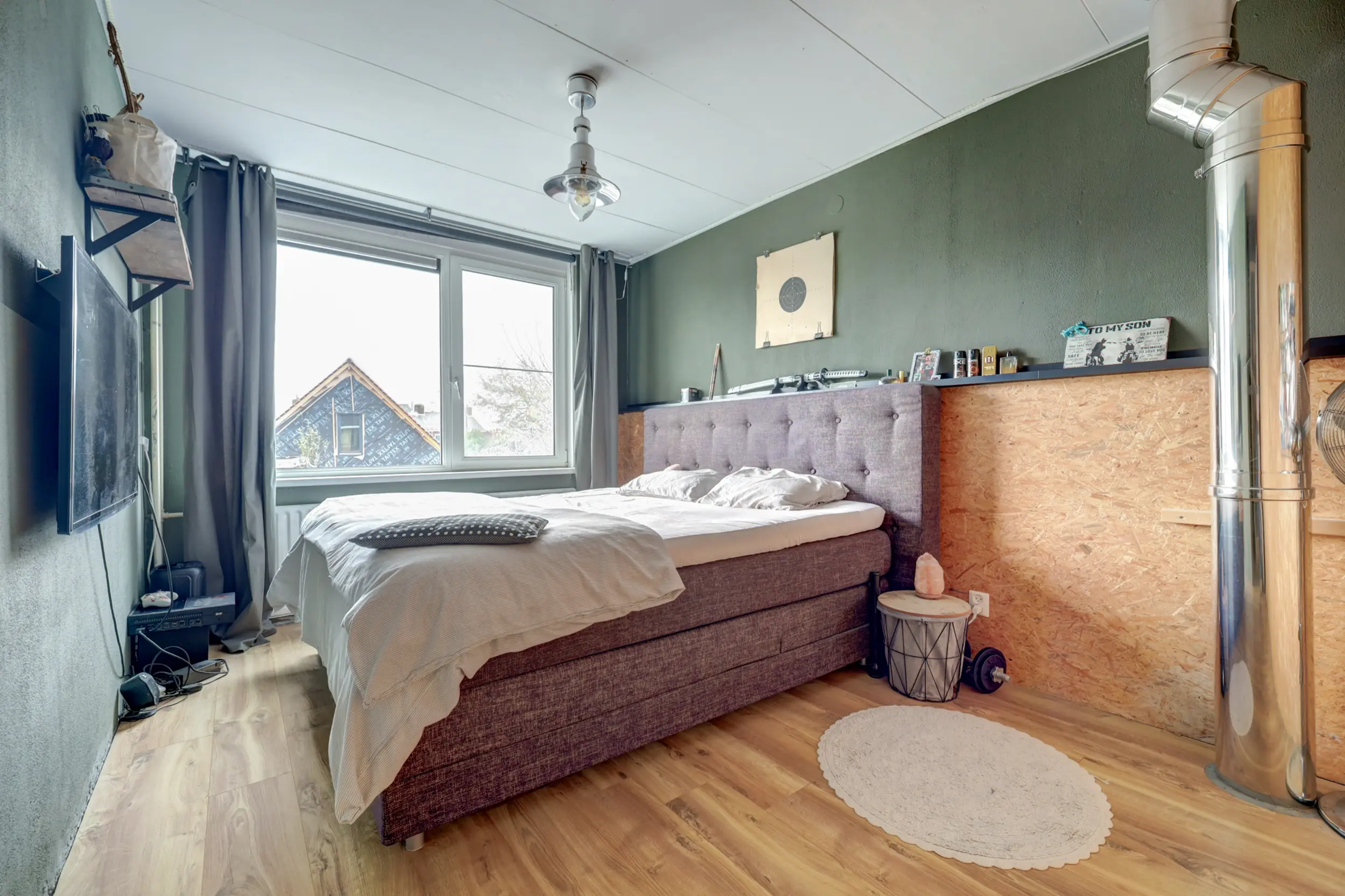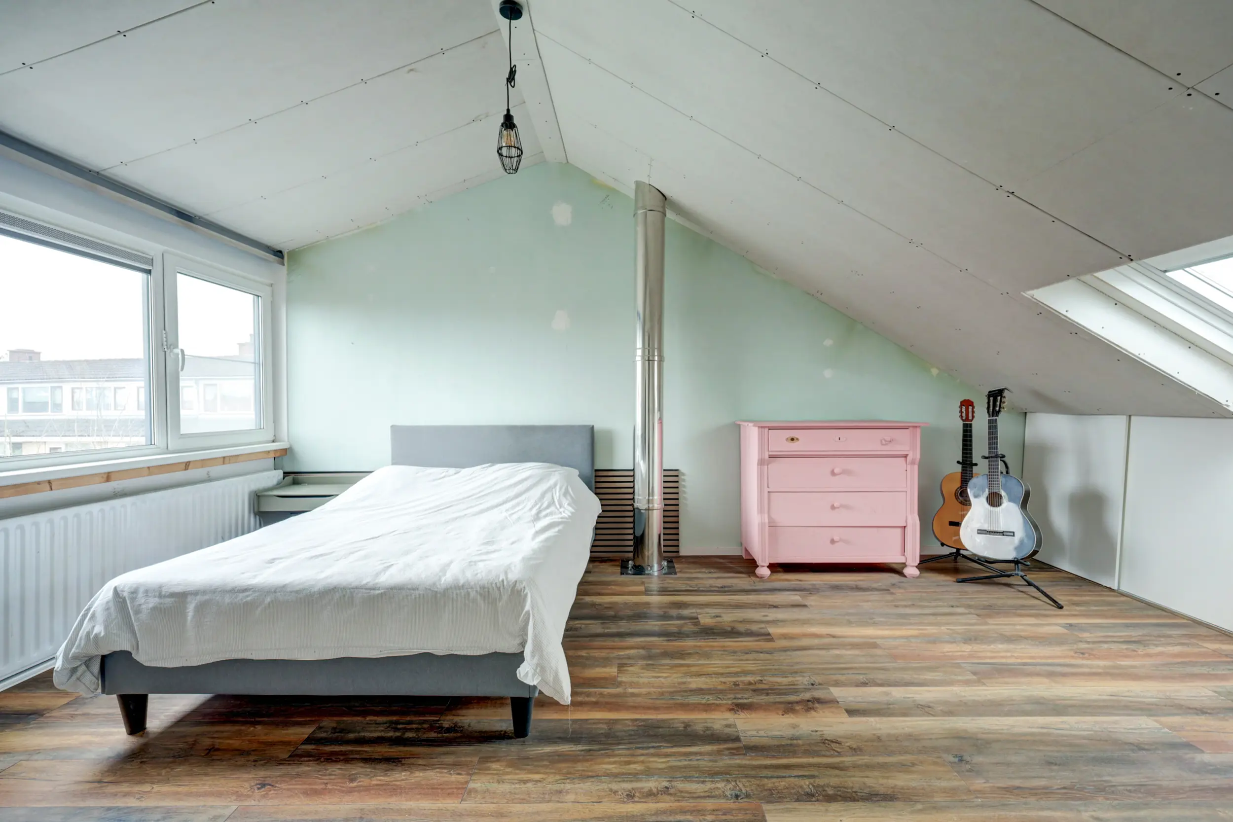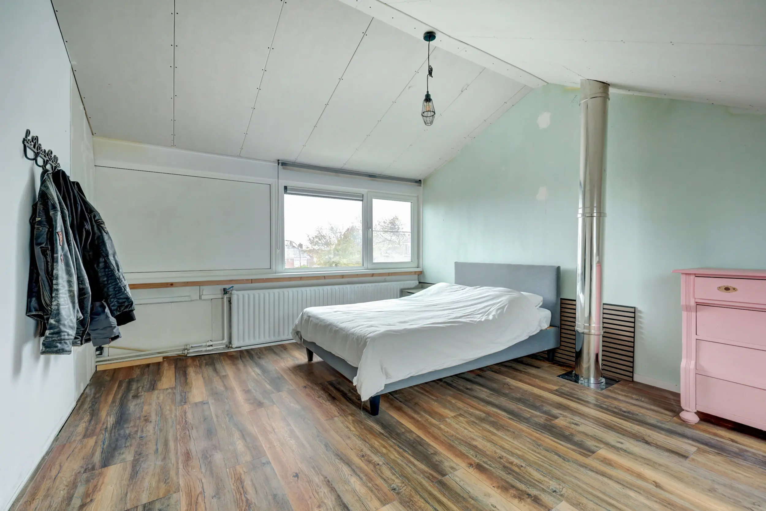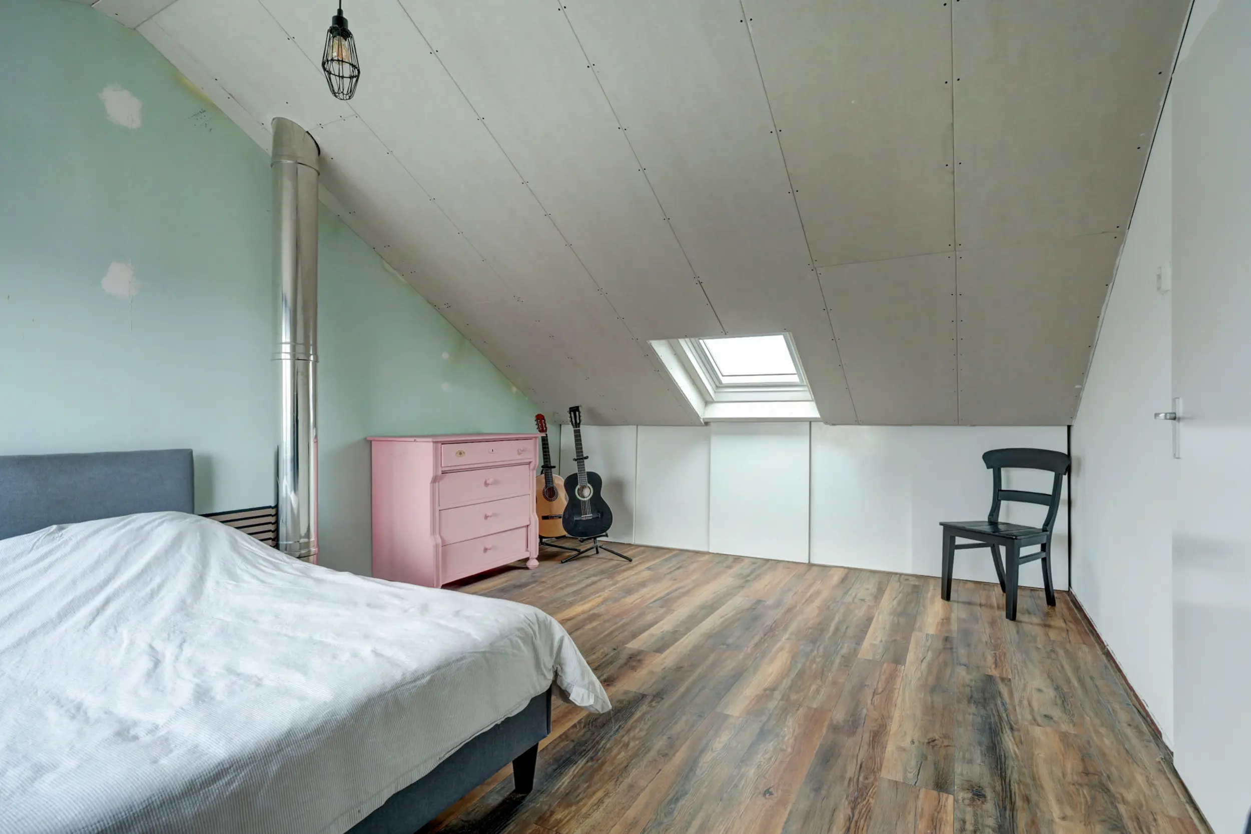De ruime slaapkamer beschikt over knieschotberging en een laminaatvloer (gehele verdieping).