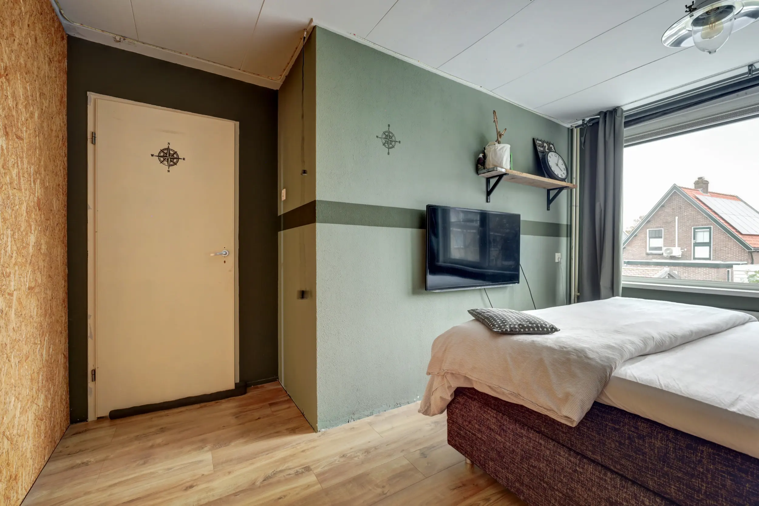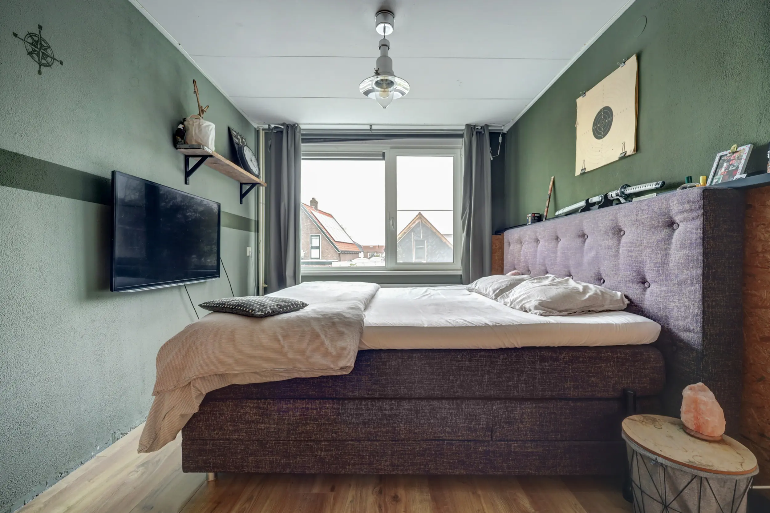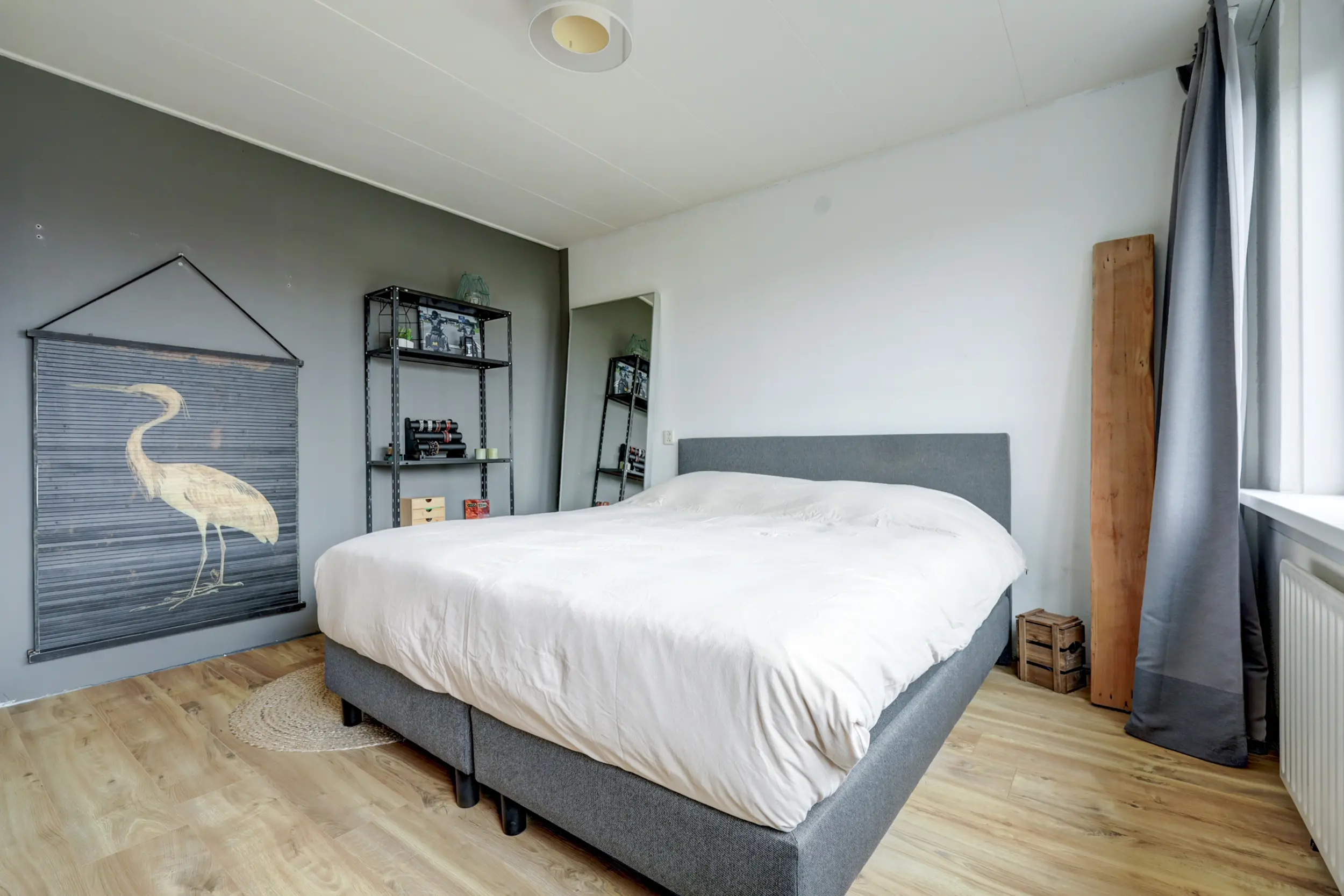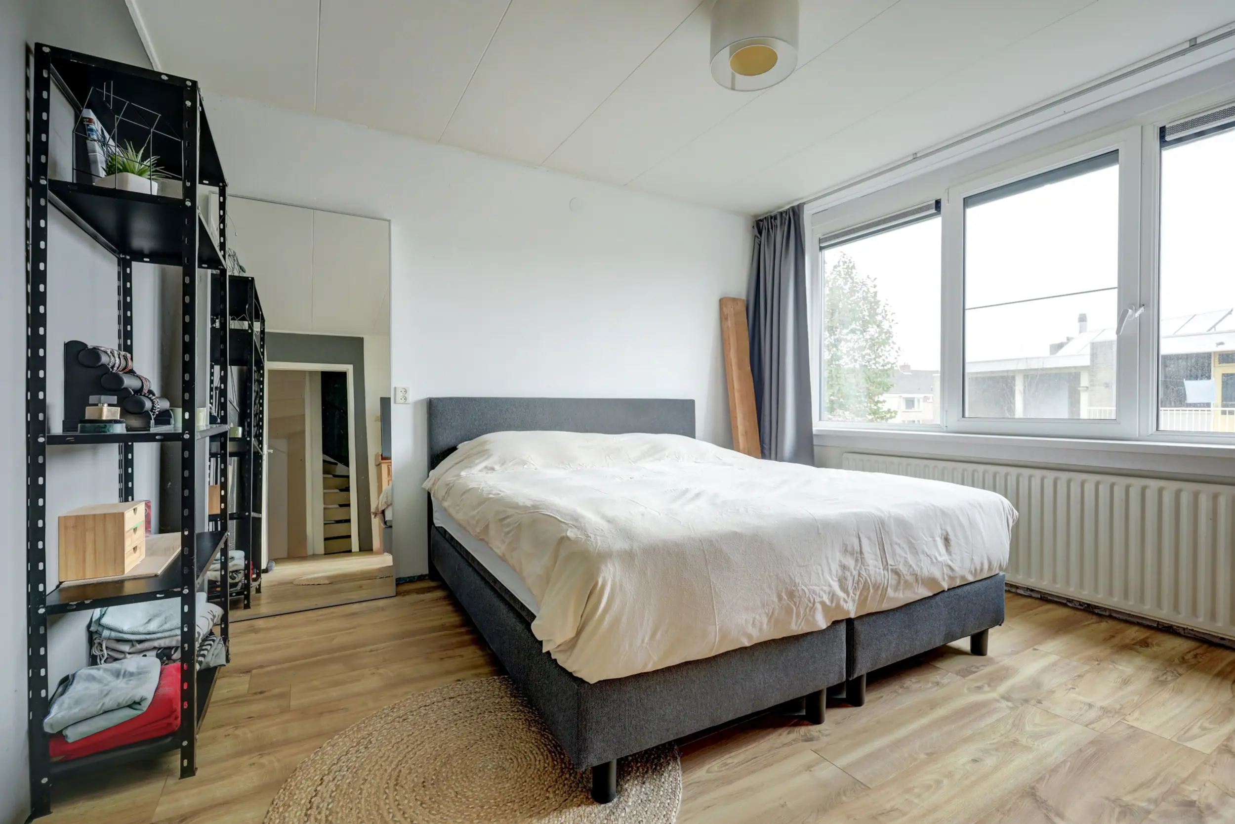 De ruime slaapkamer beschikt over knieschotberging en een laminaatvloer (gehele verdieping).