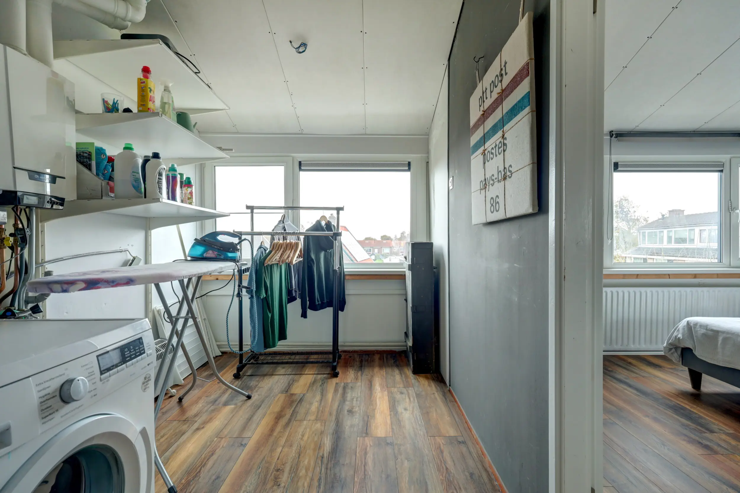 Op de overloop is de opstelplaats voor zowel wasmachine als -droger, CV combiketel en de unit van de mechanische ventilatie.