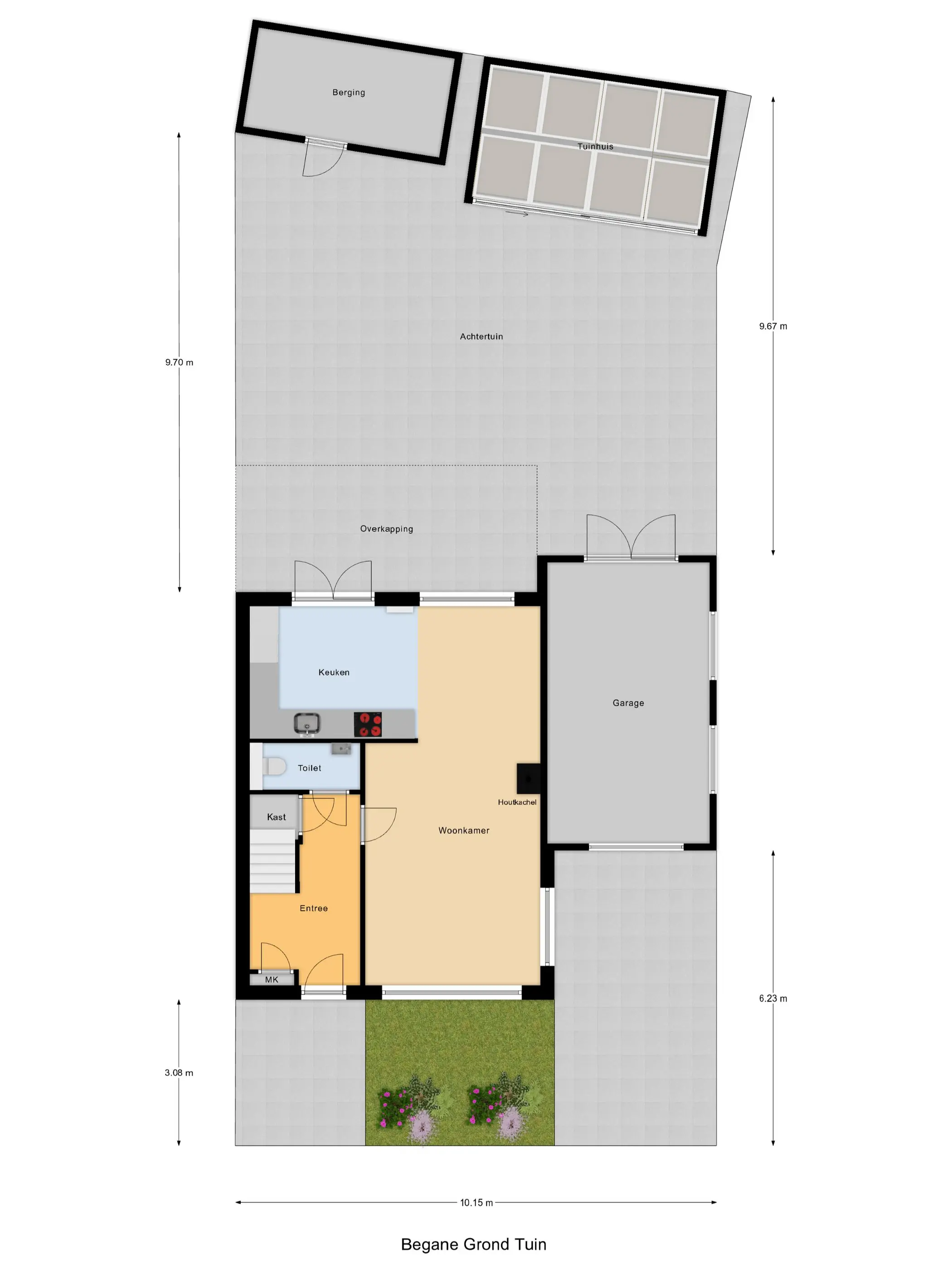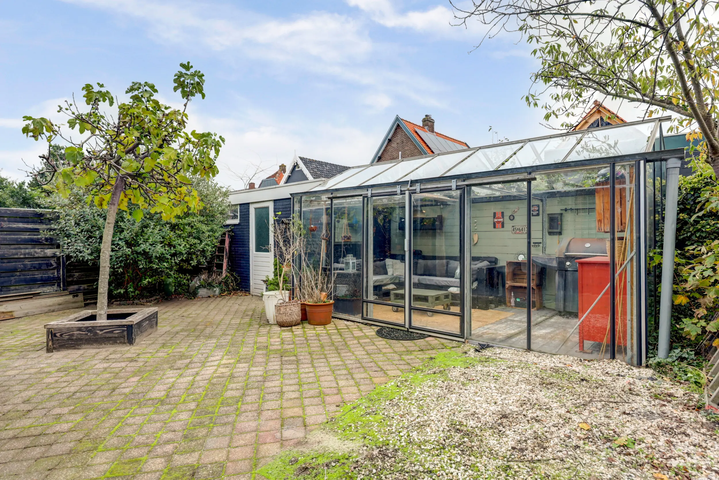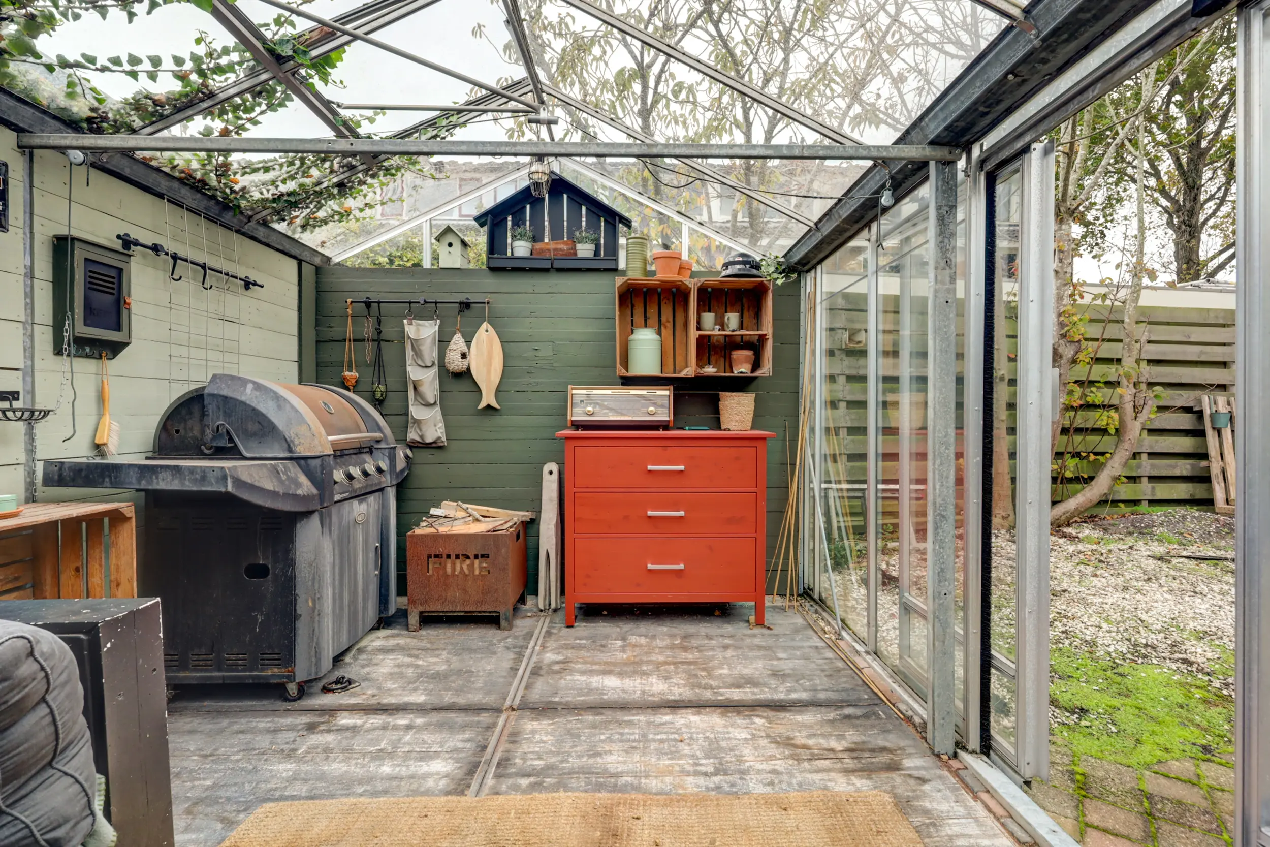 De tuin is gelegen op het zuidoosten heeft volop zon. Aan de achtergevel is een overkapping, elektra punten en een waterkraan. Achterin de tuin staat een stenen berging voorzien van elektra, een hobbykas en er is een achterom. Toegang naar de garage welke bestaat uit sandwich panelen, een betonnen vloer met daarop een laminaatvloer, elektra en tevens aan de voorzijde dubbele deuren. De voortuin is bestraat met een plantenborder.