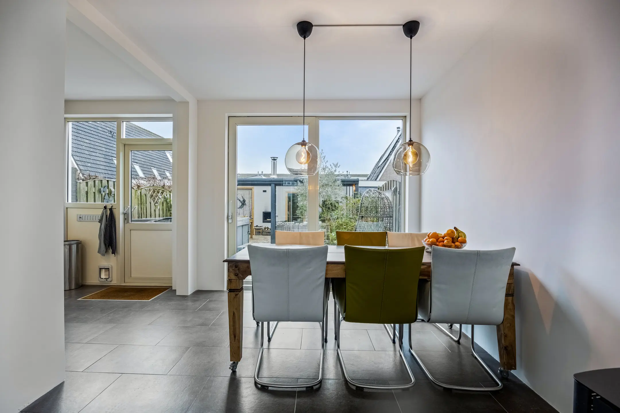 Hal/entree in de aanbouw met plavuizen vloer (gehele begane grond) en de meterkast. De toiletruimte is volledig betegeld met wandcloset en fonteintje. De ruime woonkamer is heerlijk licht door de vele raampartijen, de sfeervolle palletkachel is de hoofdverwarming voor de begane grond. Aansluitend de open keuken in een hoek opstelling en beschikt over een vaatwasser, koel,/vriescombinatie, close-in-boiler, 5-pits inductie kookplaat, combi-oven en afzuigkap. Het werkblad is van composiet. Tevens is hier de achter entree.