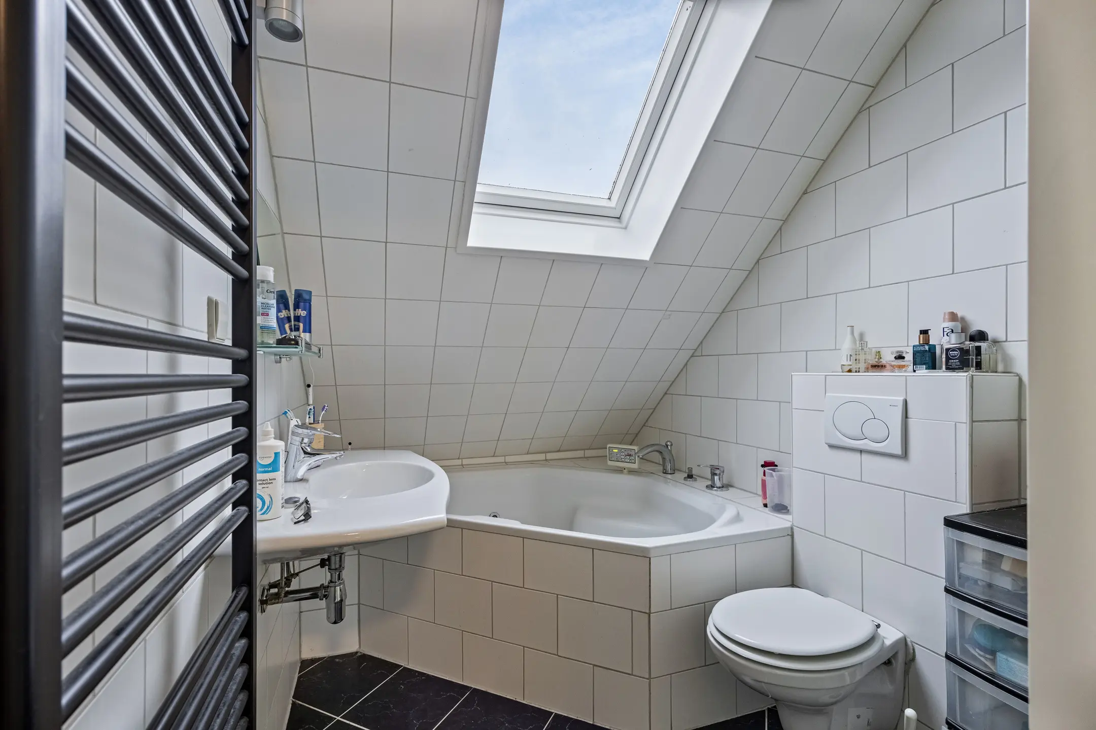 Overloopruimte met laminaatvloer (gehele verdieping) en de trapopgang naar zolder. Twee slaapkamers aan de achterzijde van de woning, de hoofdslaapkamer is aan de voorzijde gelegen. Volledig betegelde badkamer uitgevoerd met een douchecabine, toilet, hoekbad, wastafel en Velux kantelraam.
