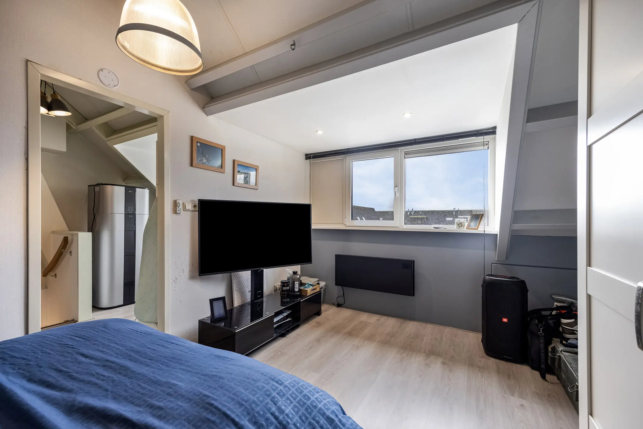 Overloopruimte met laminaatvloer (gehele verdieping). De opstelling van de tapboiler (200 ltr) t.b.v. warm water en de aansluiting voor de wasmachine en droger. Door de dakkapel is er een ruime zolder(slaap)kamer met knieschotberging.