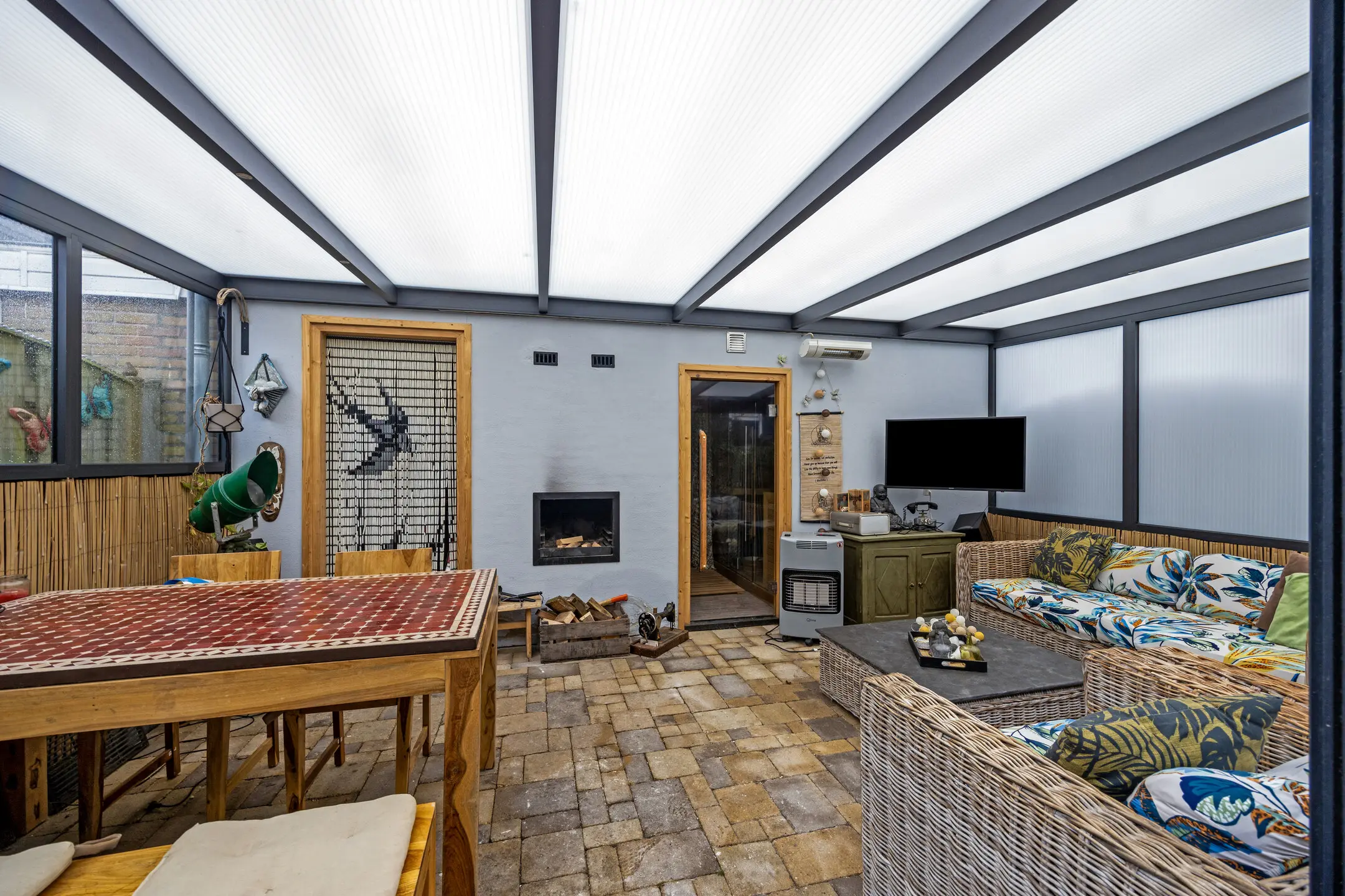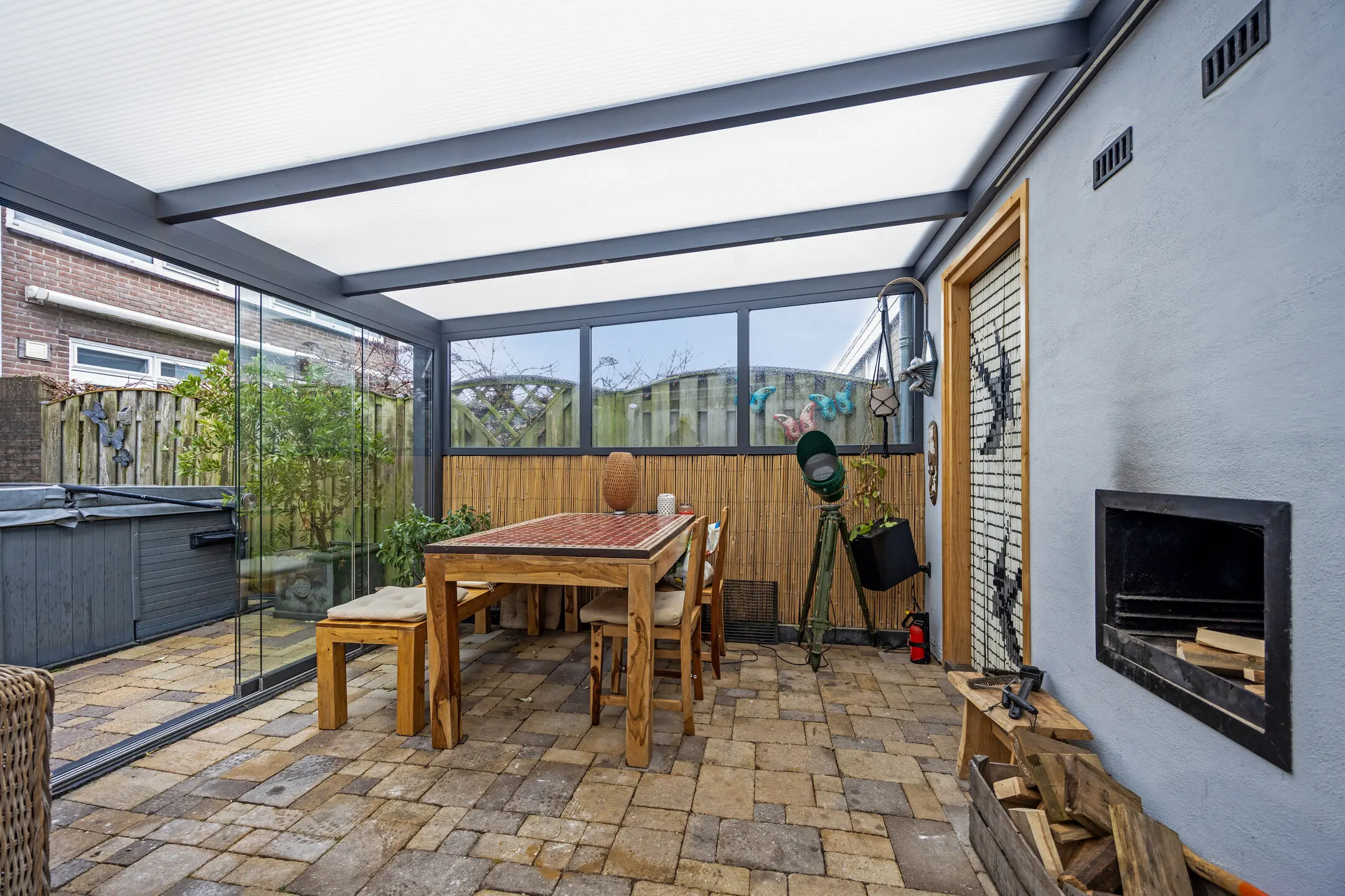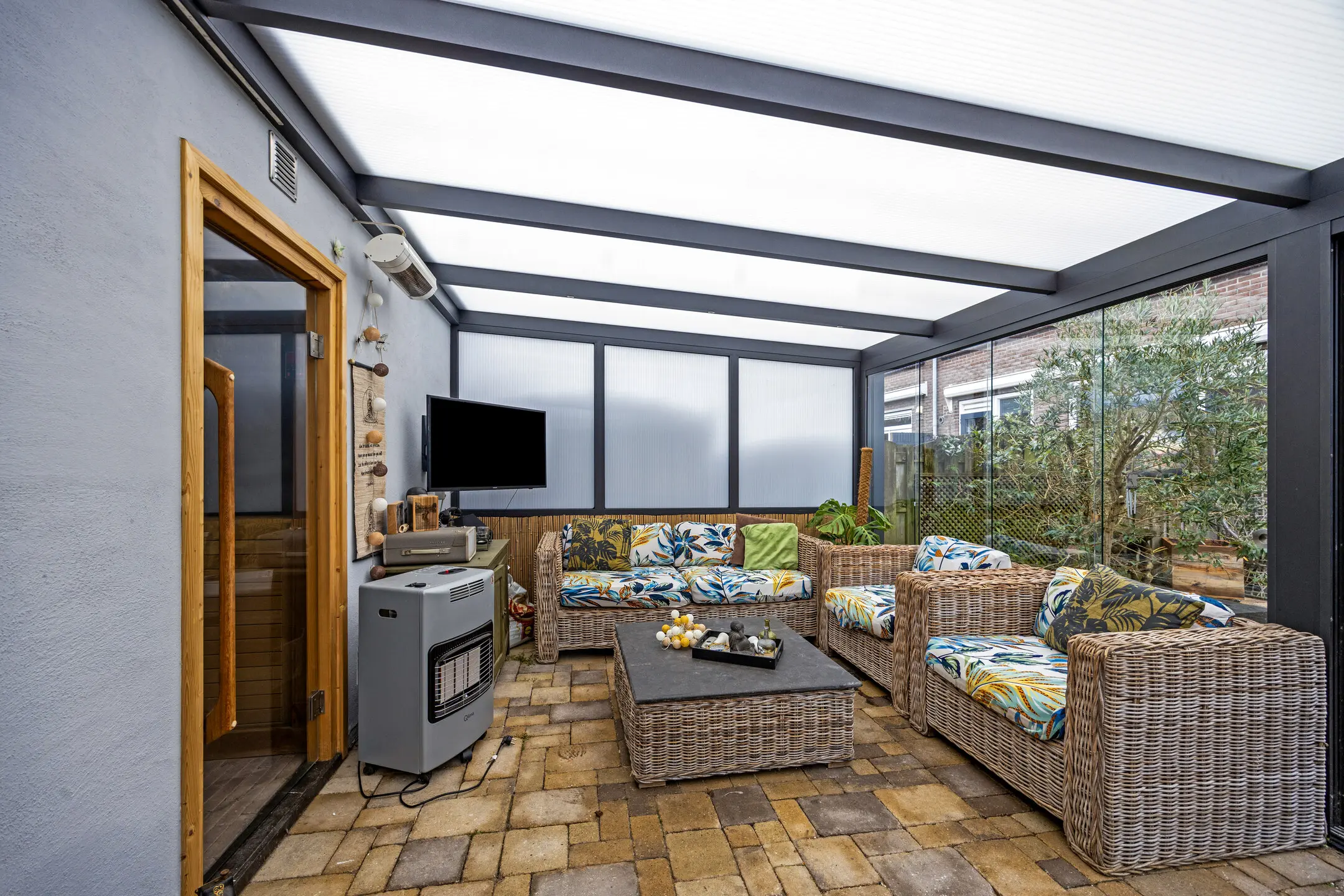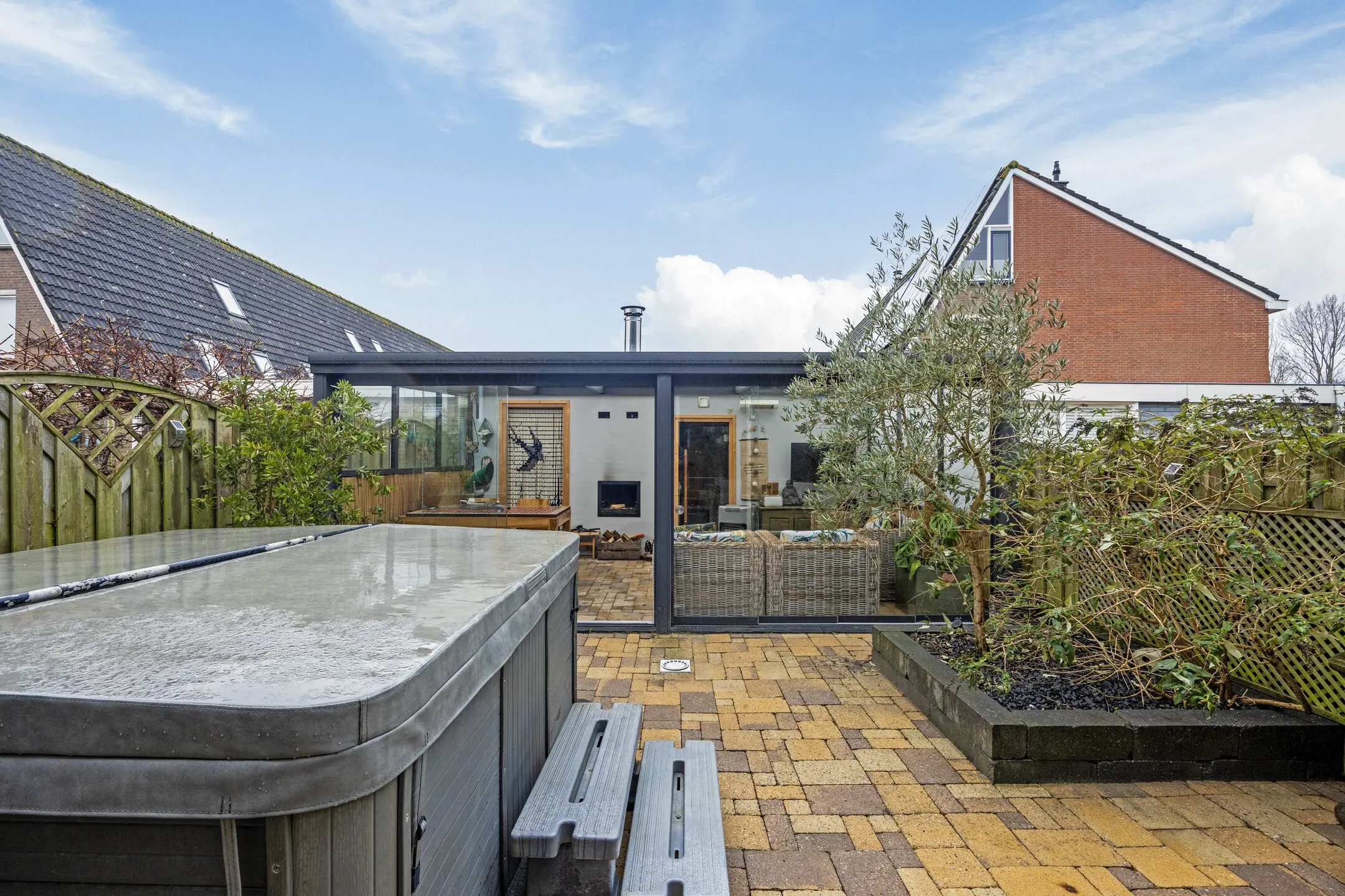 De achtertuin is op het zuidwesten gelegen en voorzien van sierbestrating en schuttingdelen. Een riante terras overkapping met vaste BBQ en een glazen schuifpui, ideaal voor de lange zomeravonden of als chill plek voor de jeugd. Aansluitend de sauna (infrarood en traditioneel) en de berging. Tevens blijft de jacuzzi in de tuin achter voor de nieuwe bewoners. De achtergevel beschikt over een elektrisch bedienbaar zonnescherm en buitenkraan.