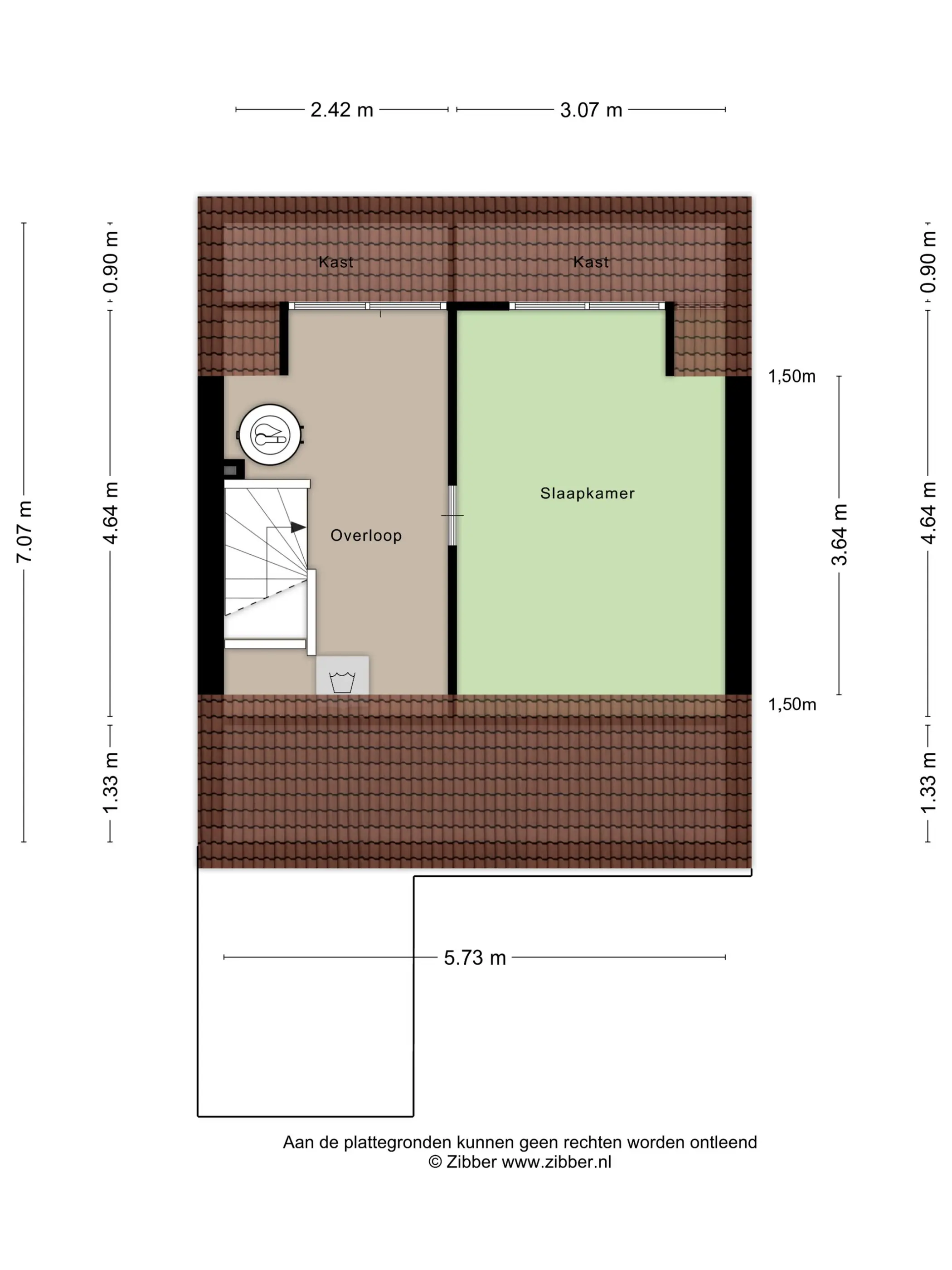 Zolder(slaap)kamer: 4,64/3,64 x 3,07m