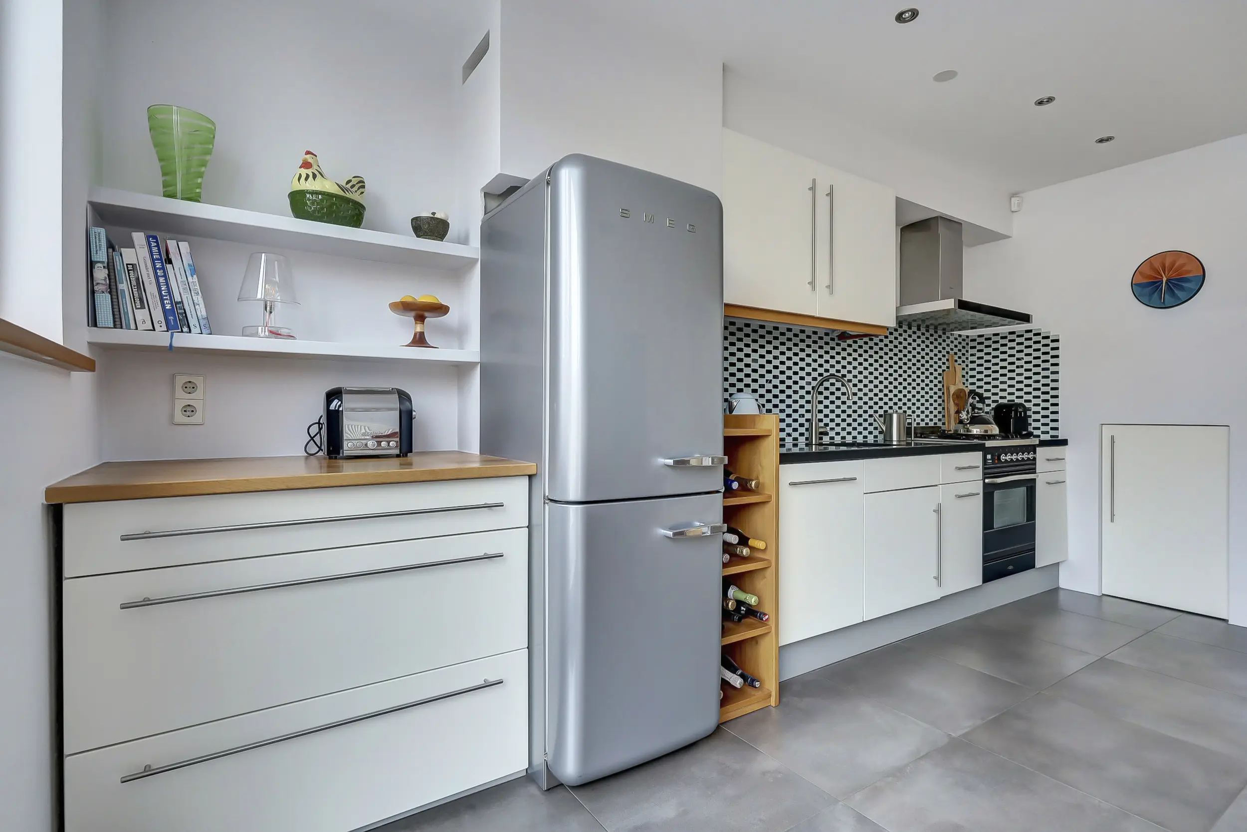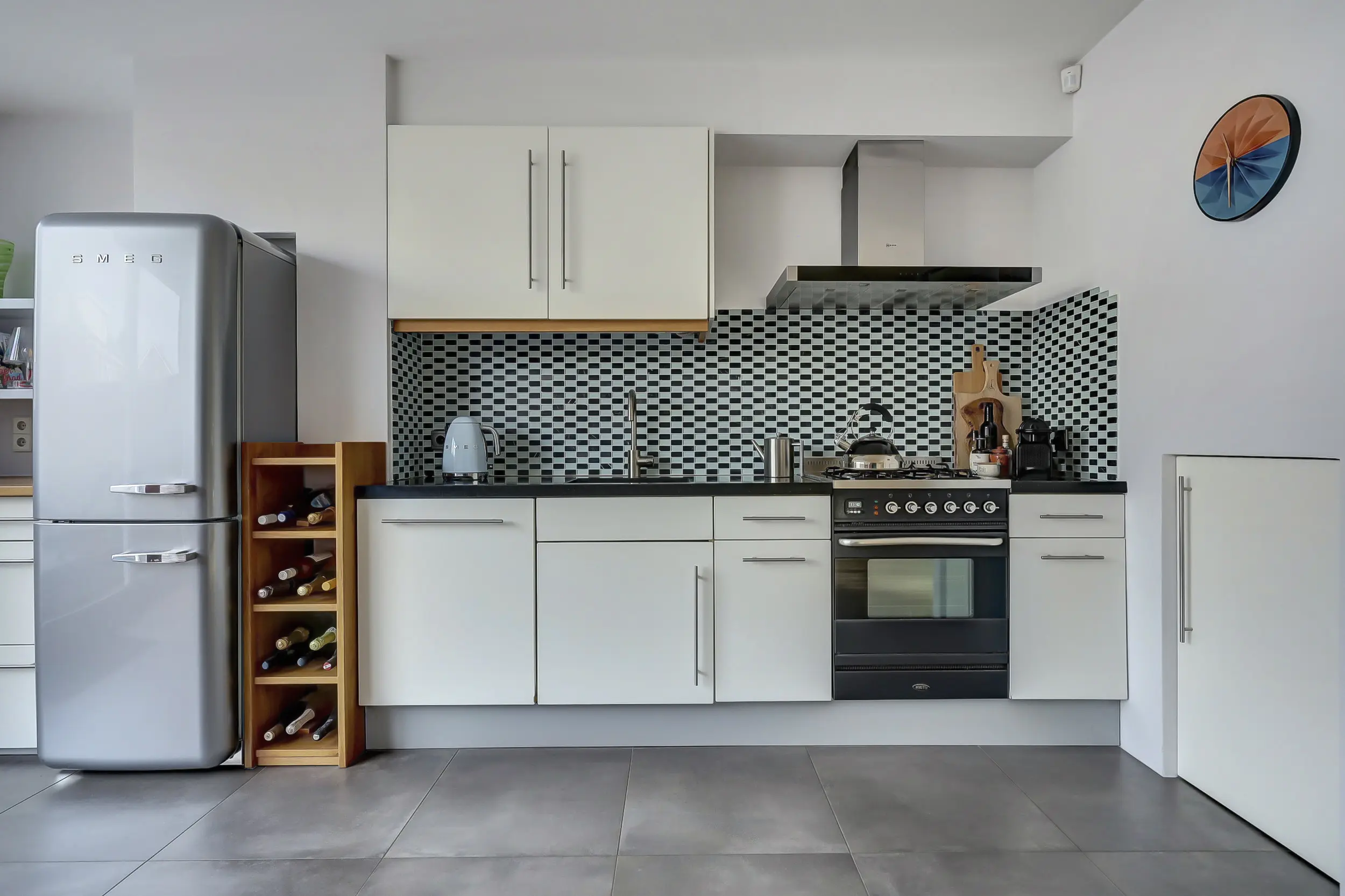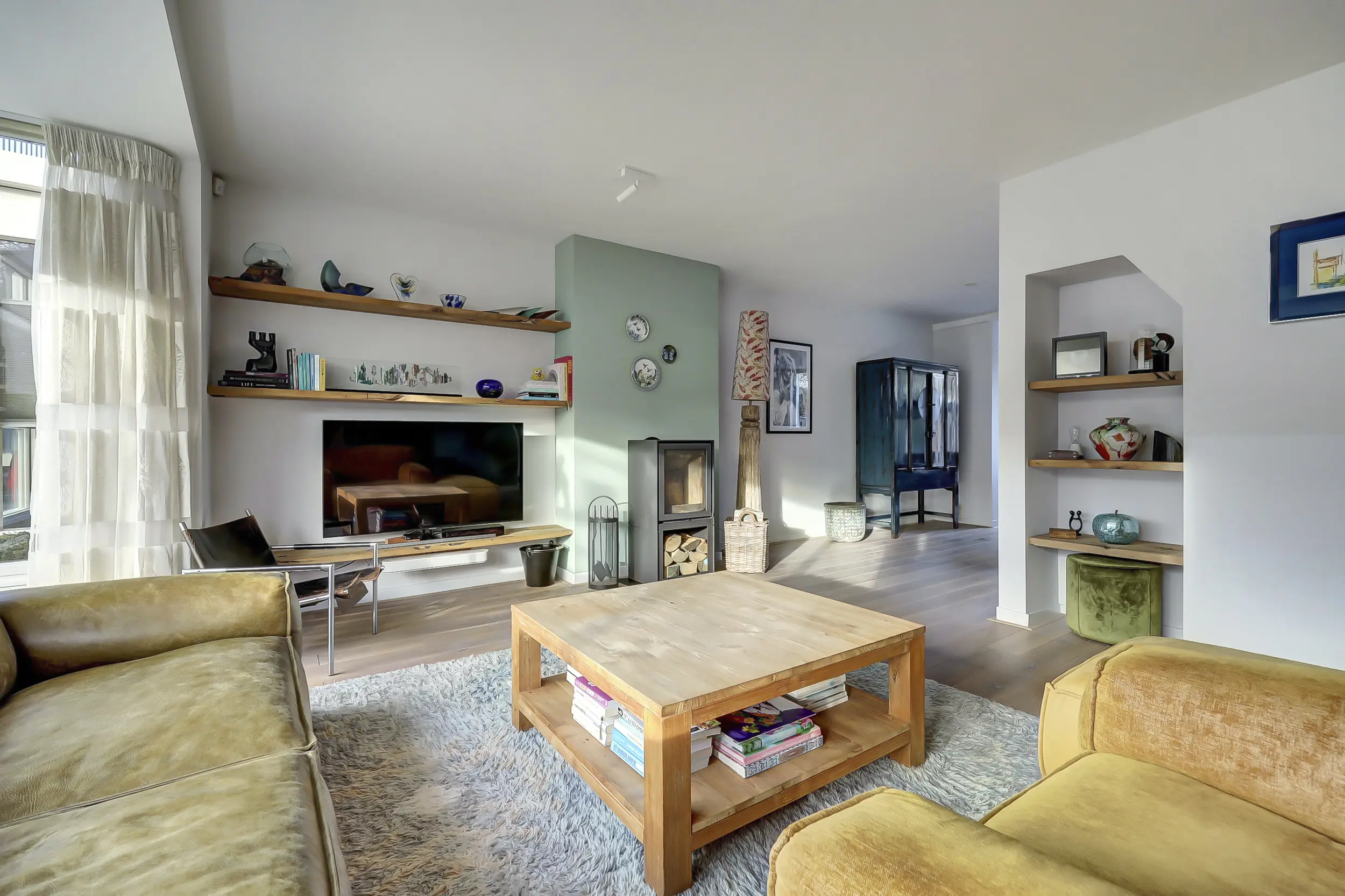 Ruime hal/entree met de trapopgang, garderobe en meterkast. Volledig betegelde toiletruimte met wandcloset. Ruime, mede door de erker aan de voorzijde, lichte woonkamer met Frans eiken vloerdelen en een sfeervolle (Barbas) houtkachel. Open (woon) keuken in een lichte keukeninrichting voorzien van een Boretti fornuis met afzuigkap, oven, vaatwasser en meer dan voldoende bergruimte in de kastjes en lades. Via de schuifpui komt u in de achtertuin.