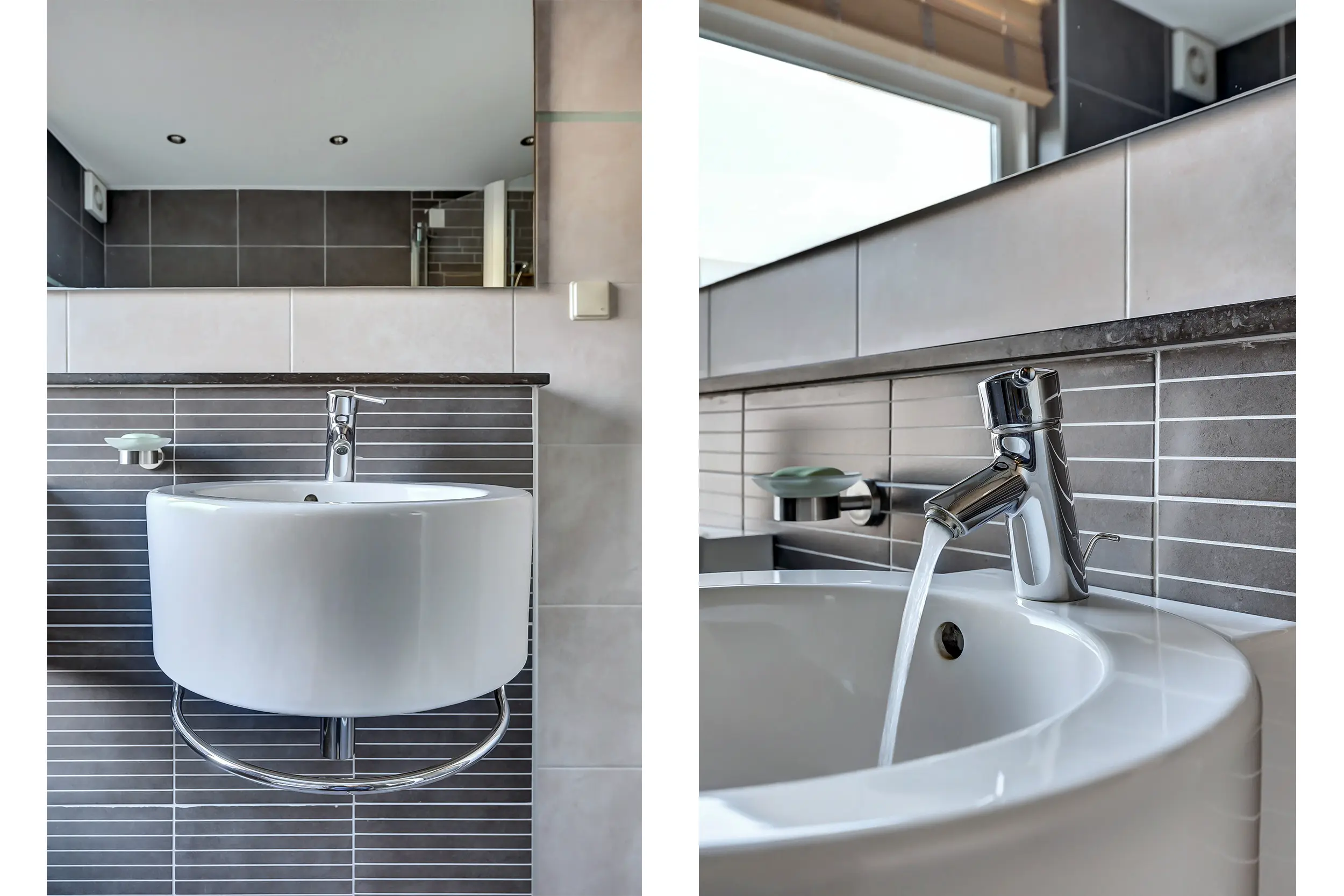 Overloopruimte met vaste trapopgang naar de zolderverdieping. Toegang naar de drie ruime slaapkamers. Volledig betegelde badkamer voorzien van een dubbele wastafel, wandcloset, douchecabine en vloerverwarming.