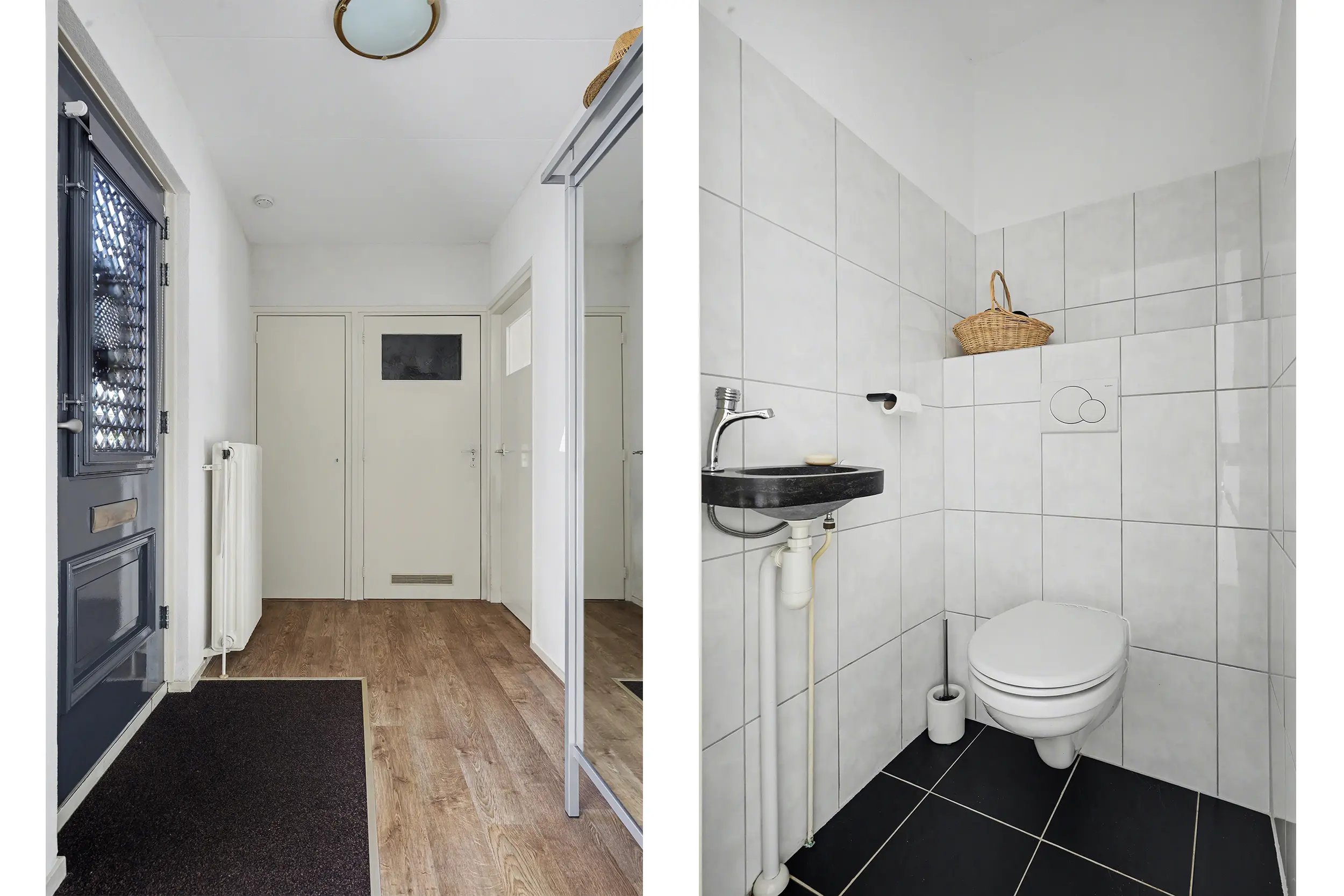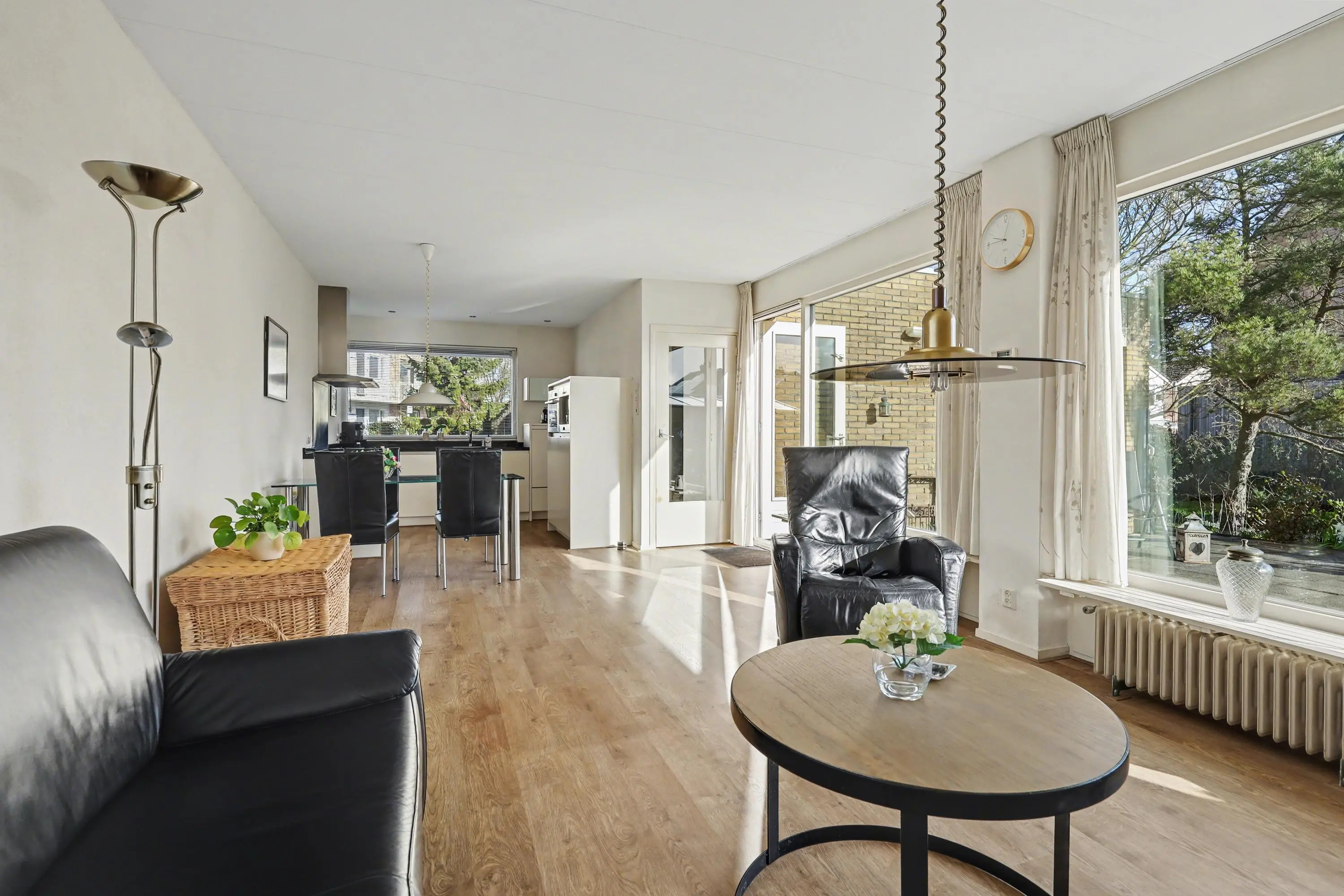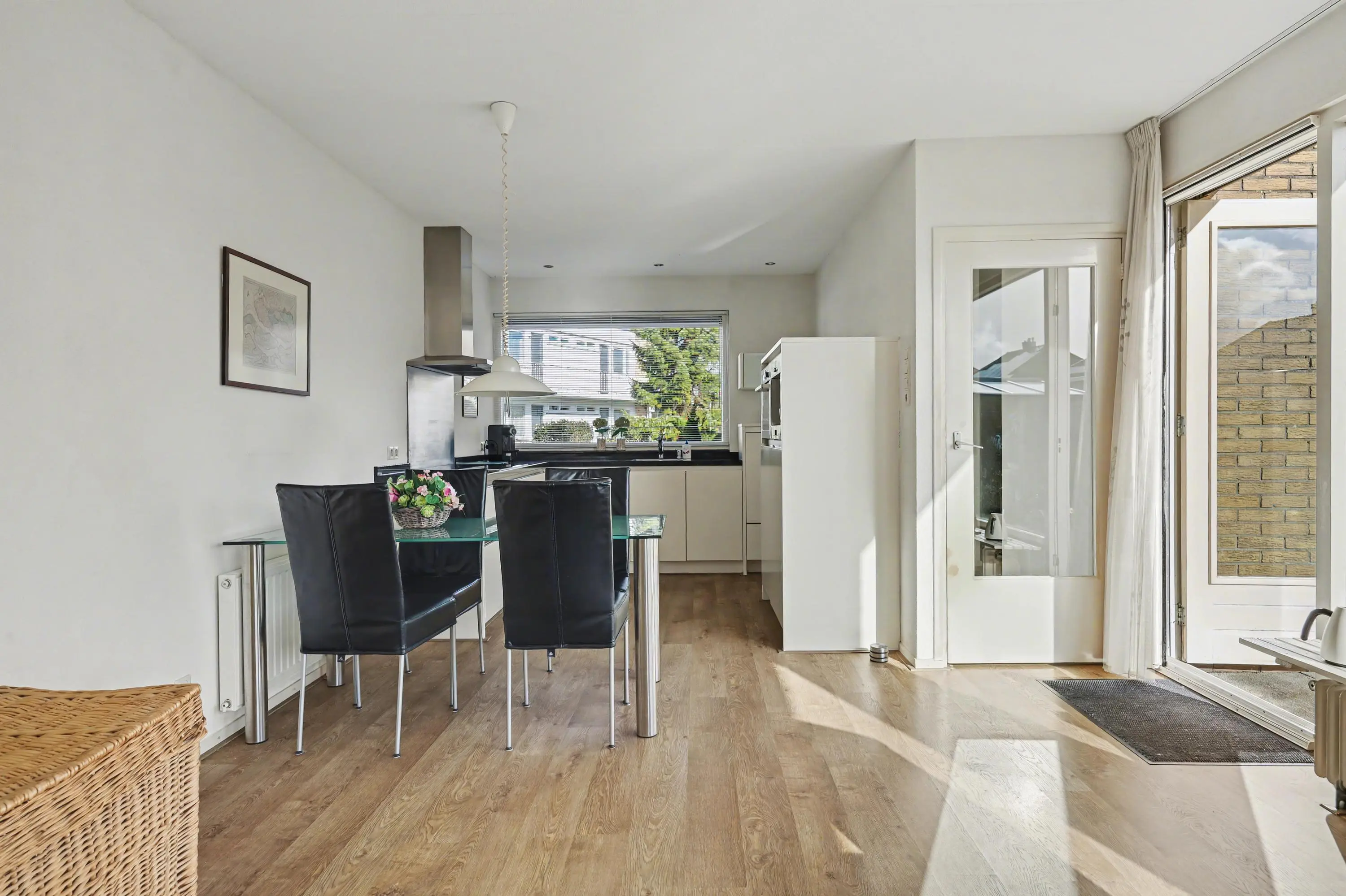 Entree met hal, meterkast en vaste kast met boiler. Toiletruimte met hangend toilet en fonteintje. De lichte woonkamer met grote raampartijen en laminaatvloer biedt een mooi zicht op de tuin en directe toegang tot de achtertuin.