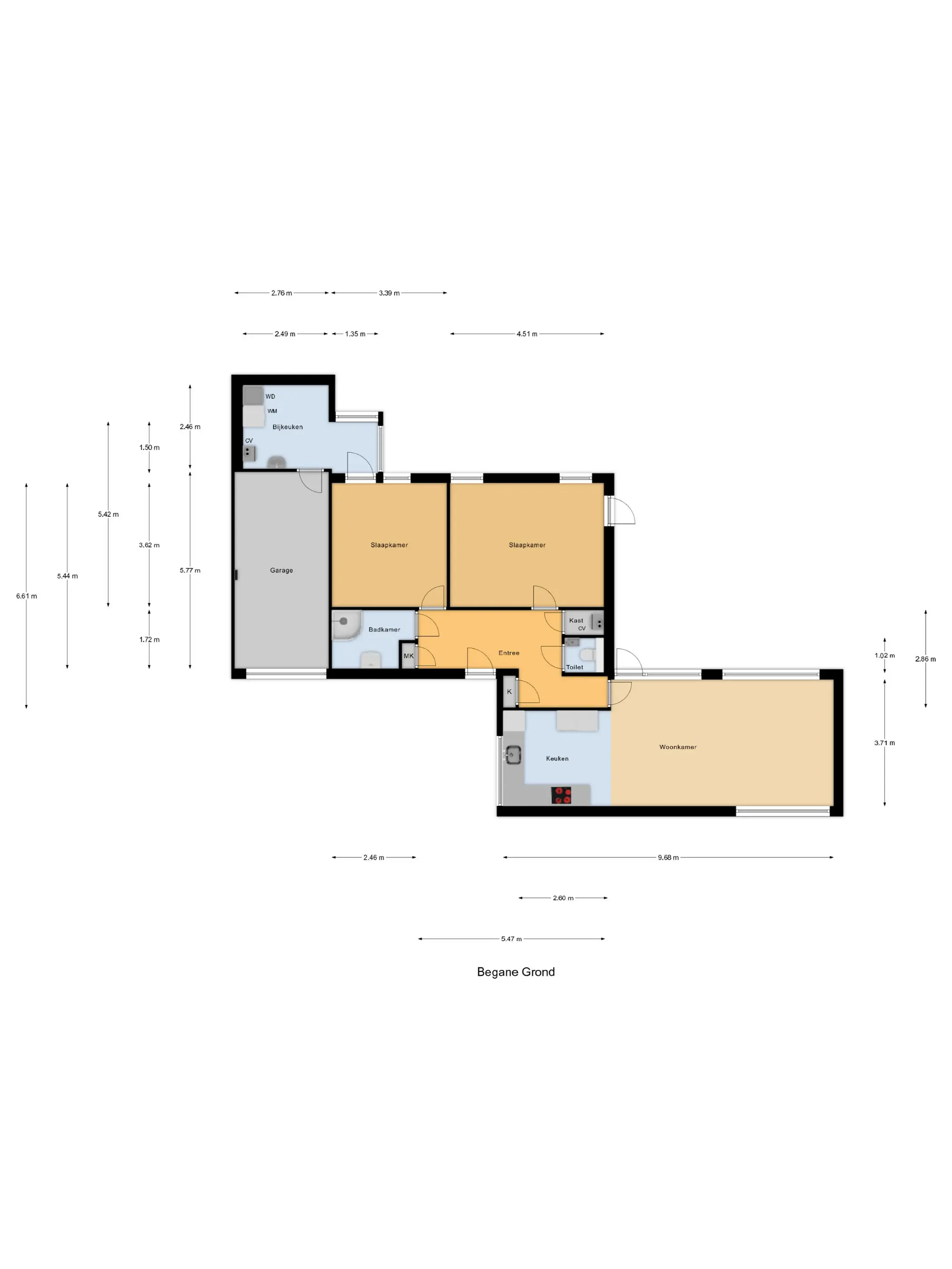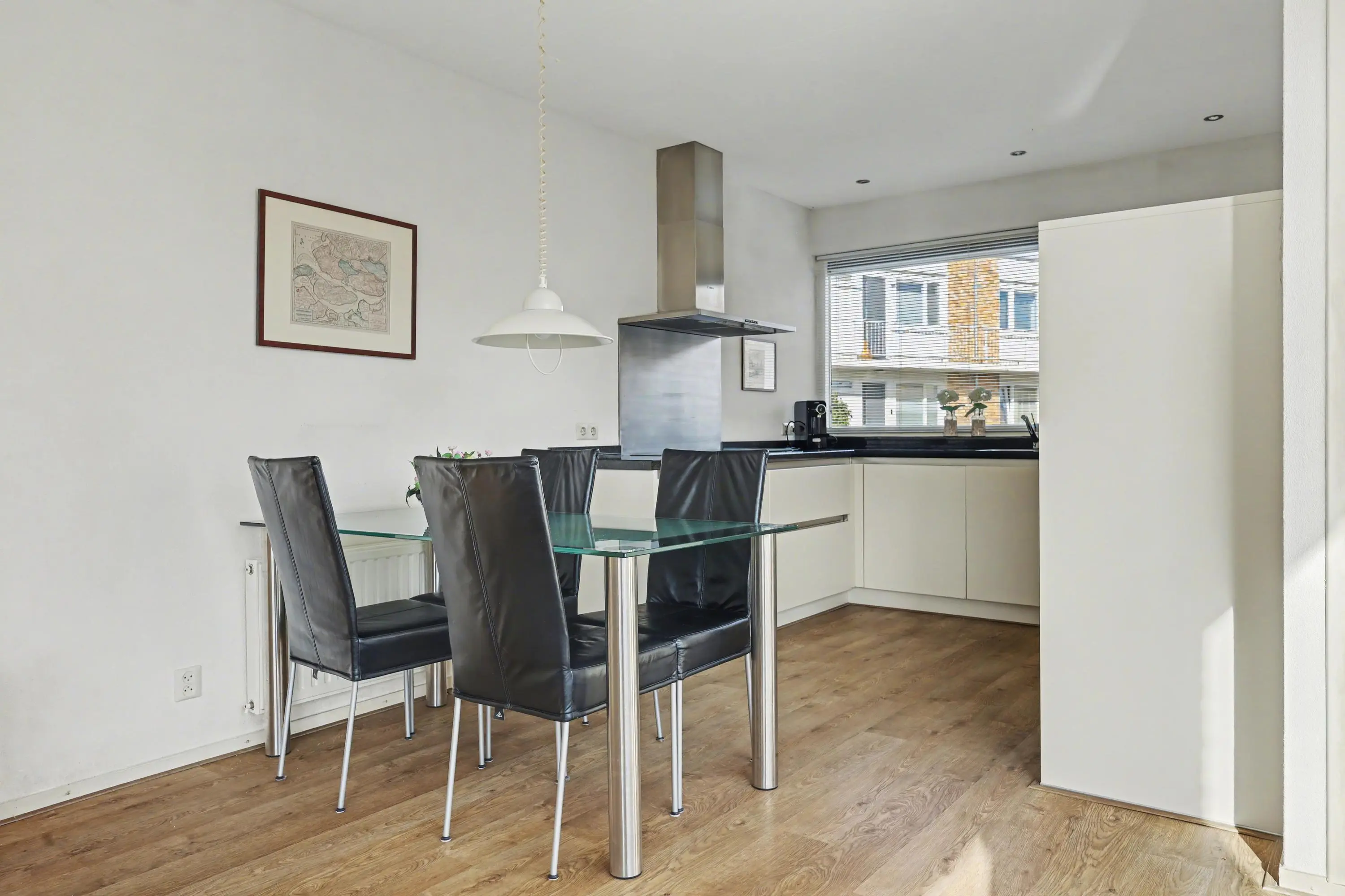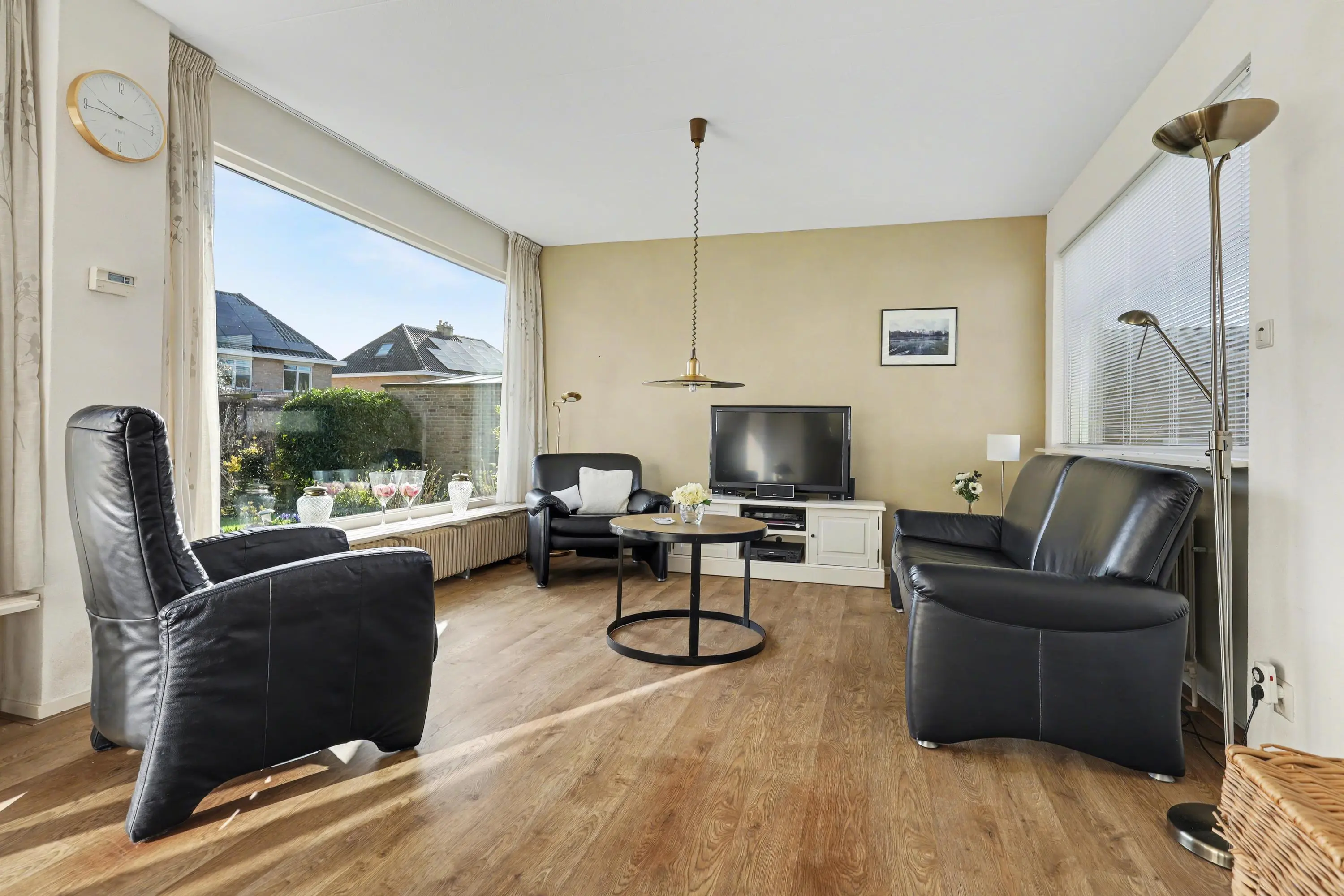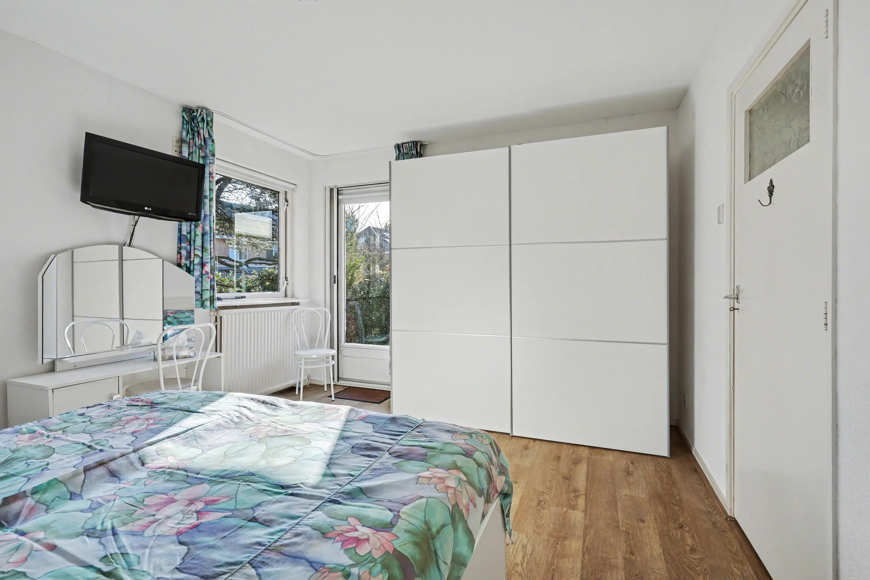 Entree met hal, meterkast en vaste kast met boiler. Toiletruimte met hangend toilet en fonteintje. De lichte woonkamer met grote raampartijen en laminaatvloer biedt een mooi zicht op de tuin en directe toegang tot de achtertuin.