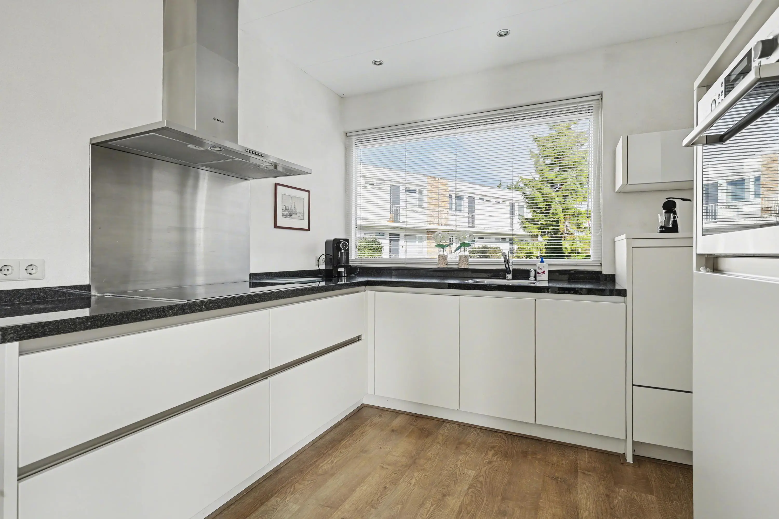 De open keuken is uitgevoerd in een moderne hoekopstelling met onder andere een hardstenen werkblad, keramische kookplaat, vaatwasser en een separate wandopstelling met een koel,-vriescombinatie, combimagnetron en een koffiemachine.