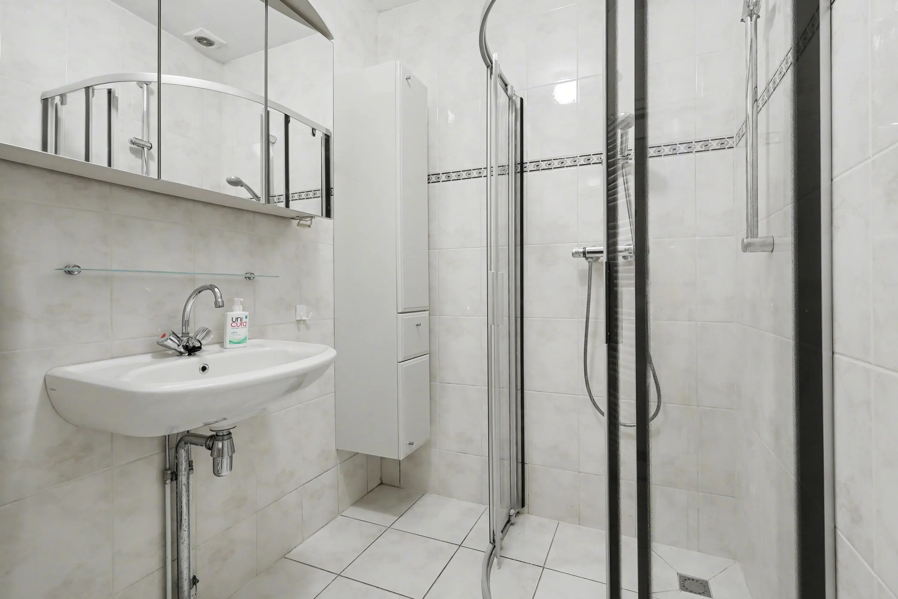 De badkamer is voorzien van een douchecabine, wastafel en handdoekenradiator.
