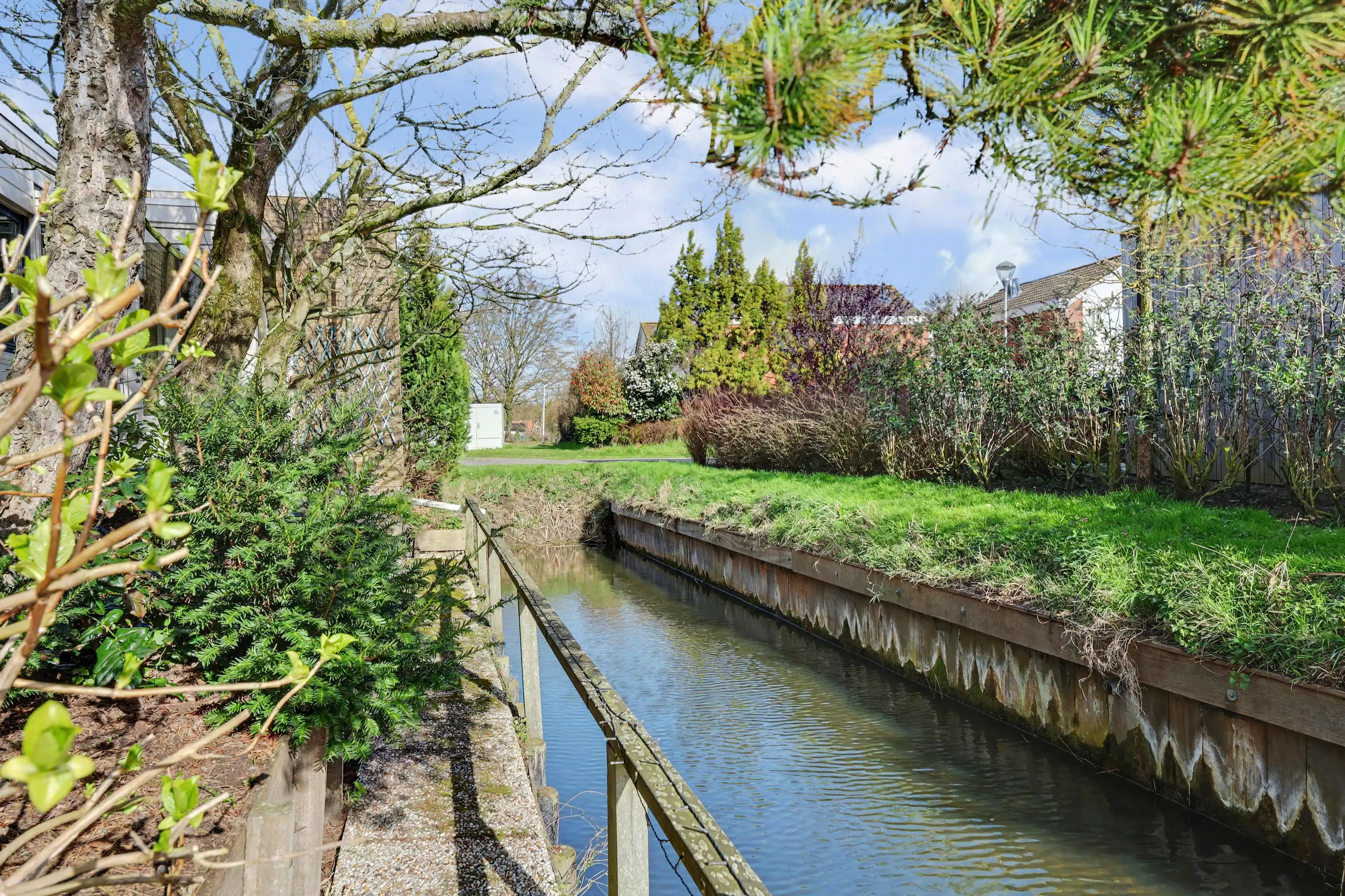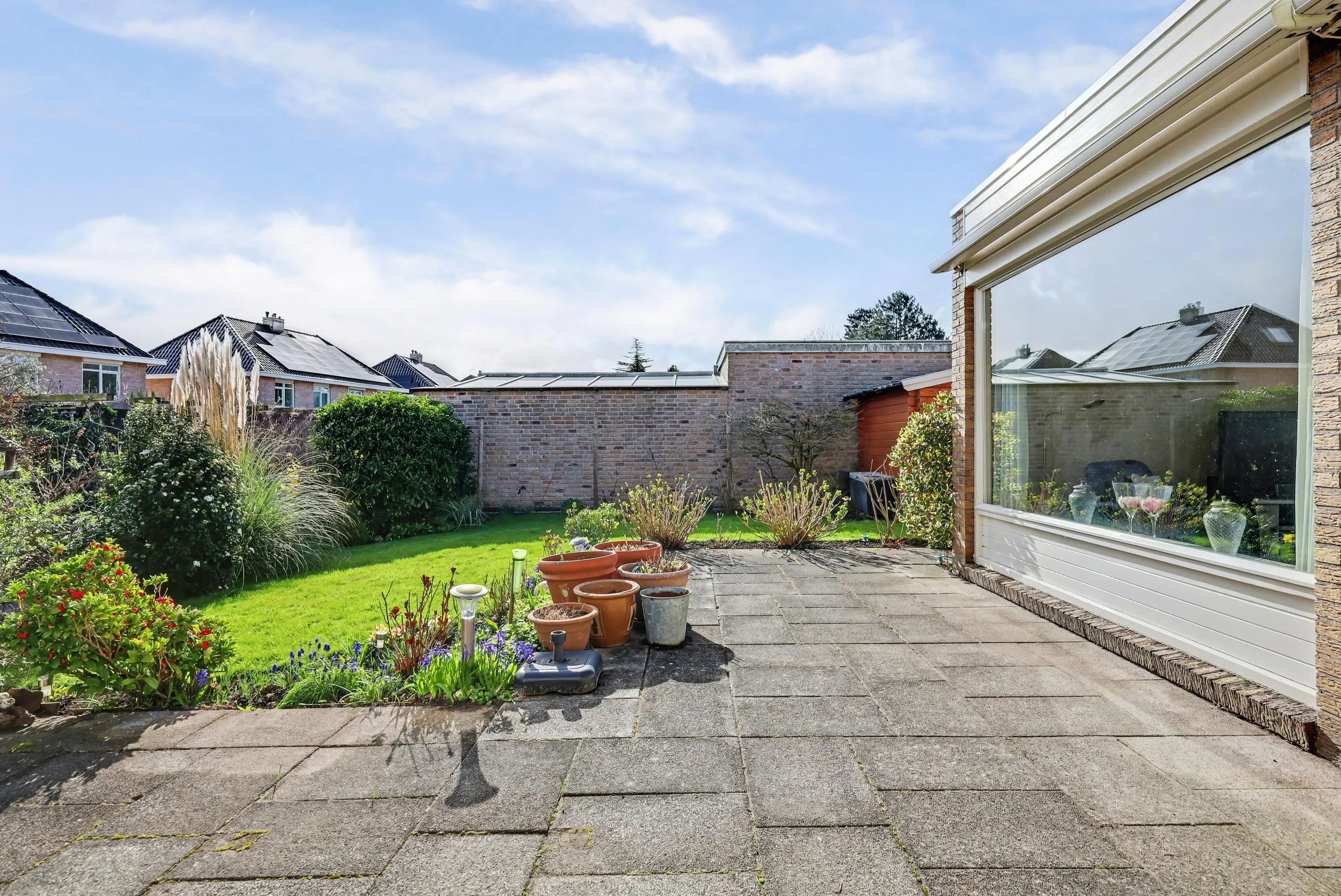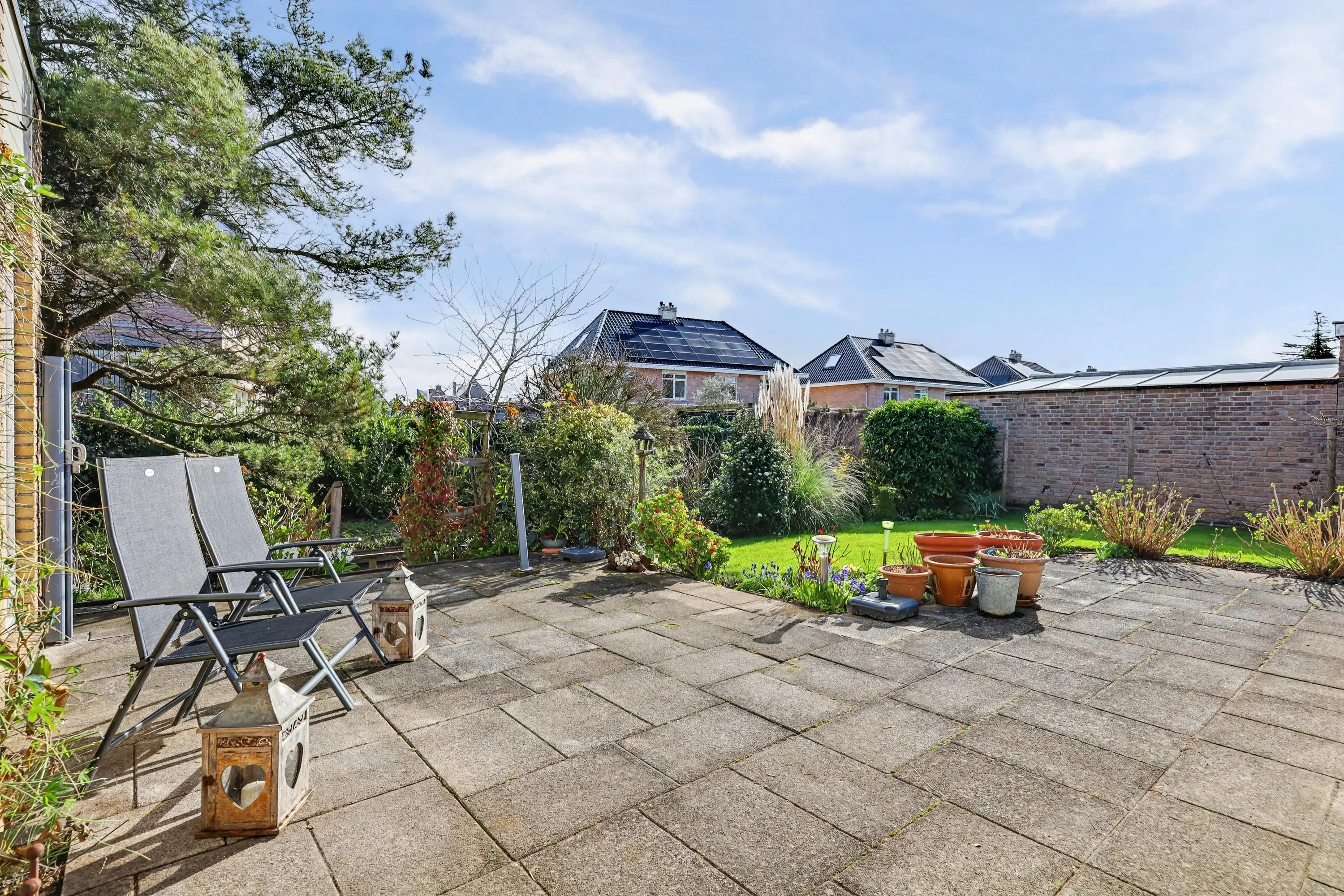 De tuin ligt rondom de woning. De achtertuin is gunstig gelegen op het zuidoosten, biedt veel privacy en beschikt over elektrisch bedienbare zonneschermen. Daarnaast staat er een ruime blokhutberging. Op eigen terrein is parkeergelegenheid voor twee auto's.