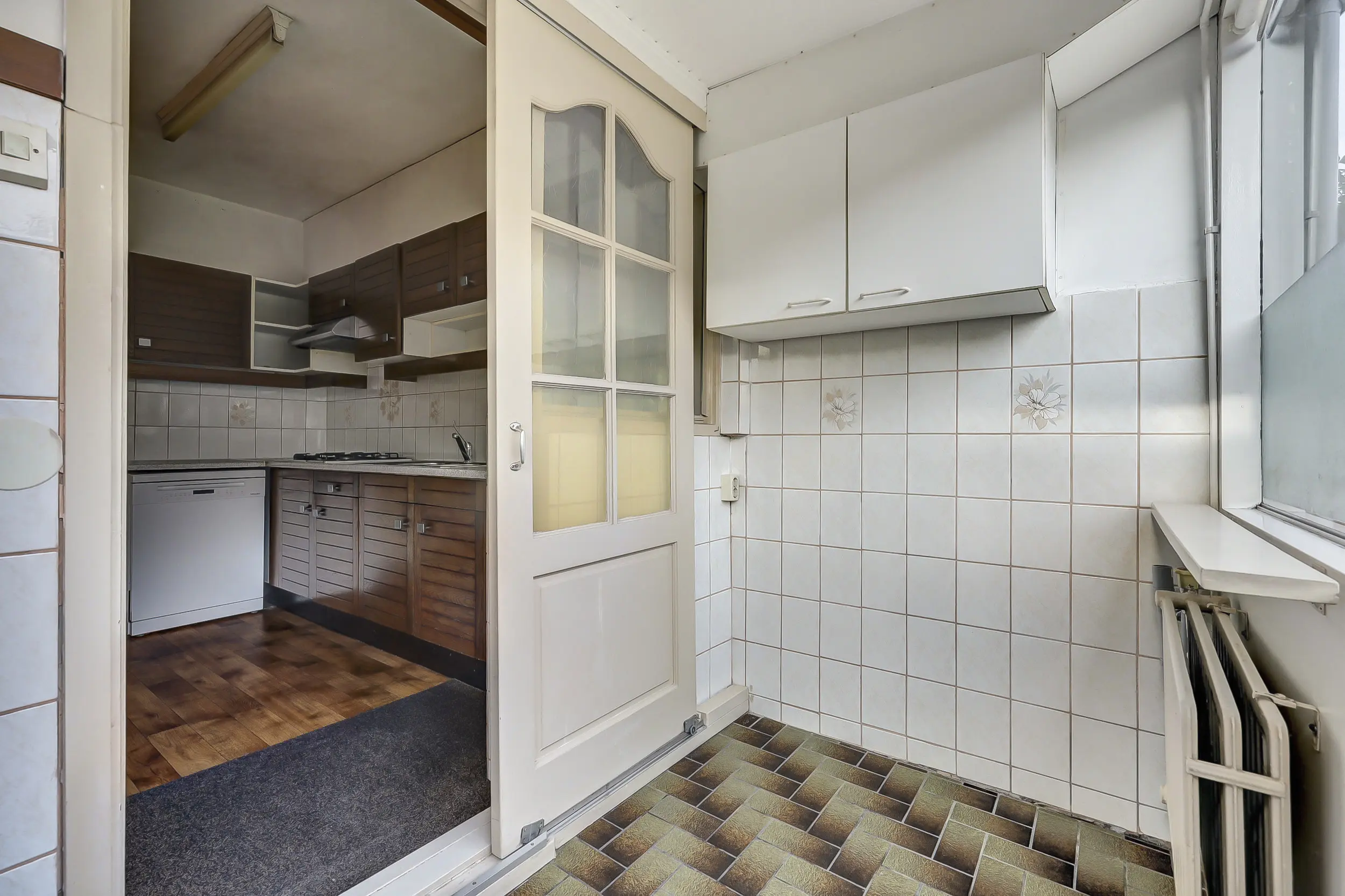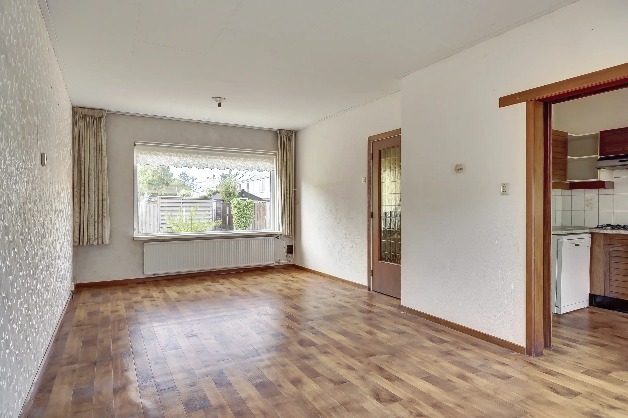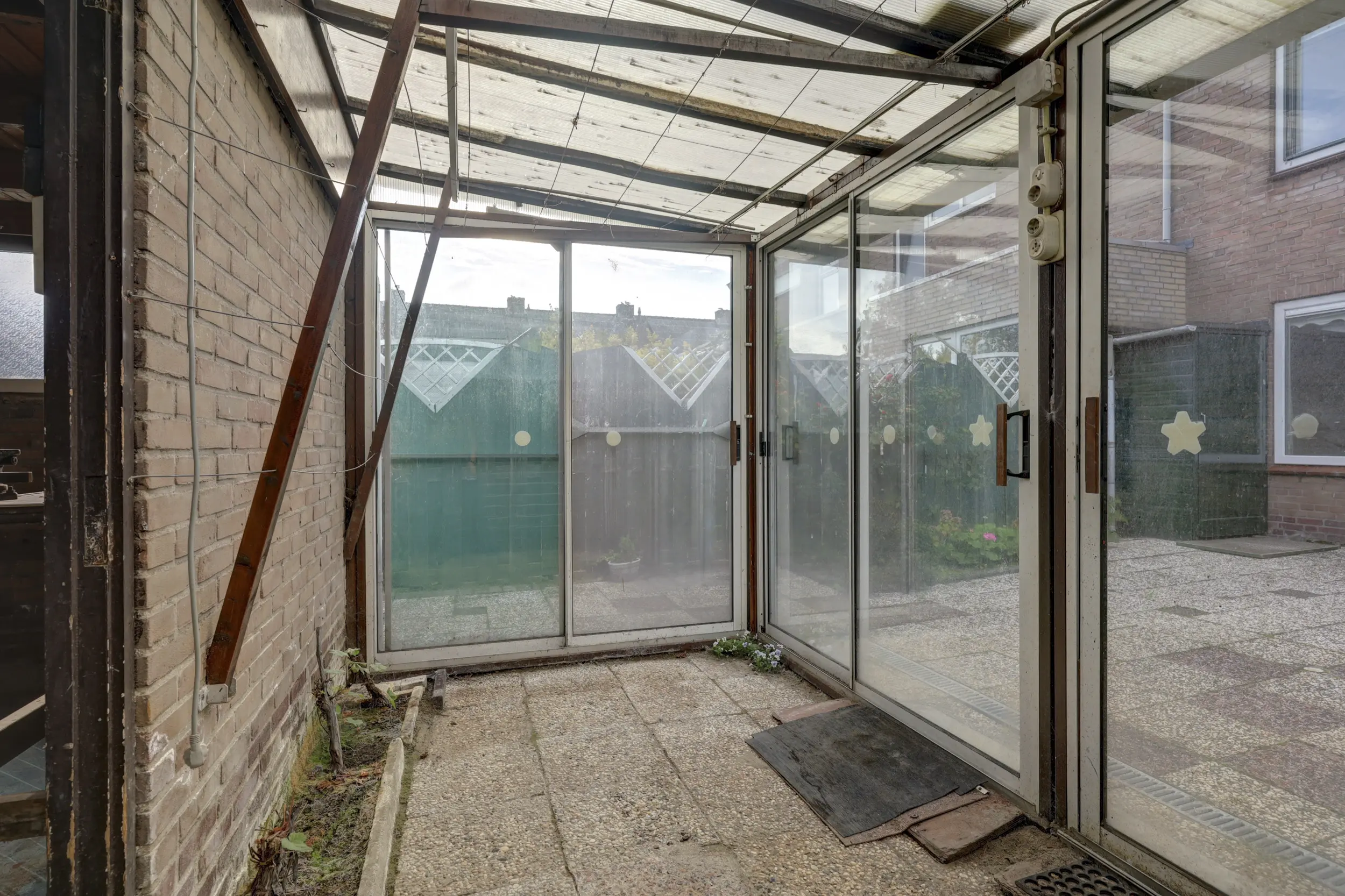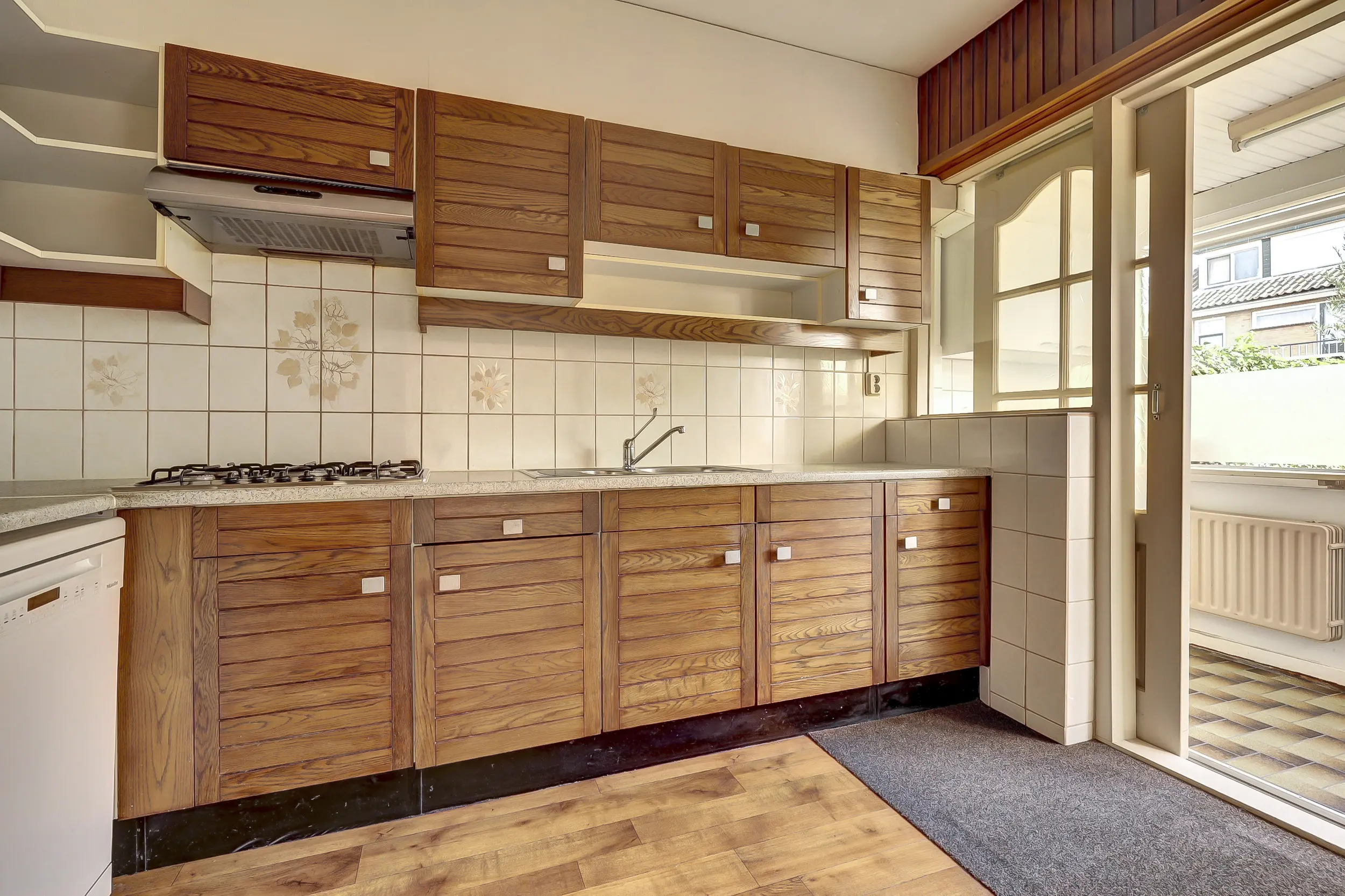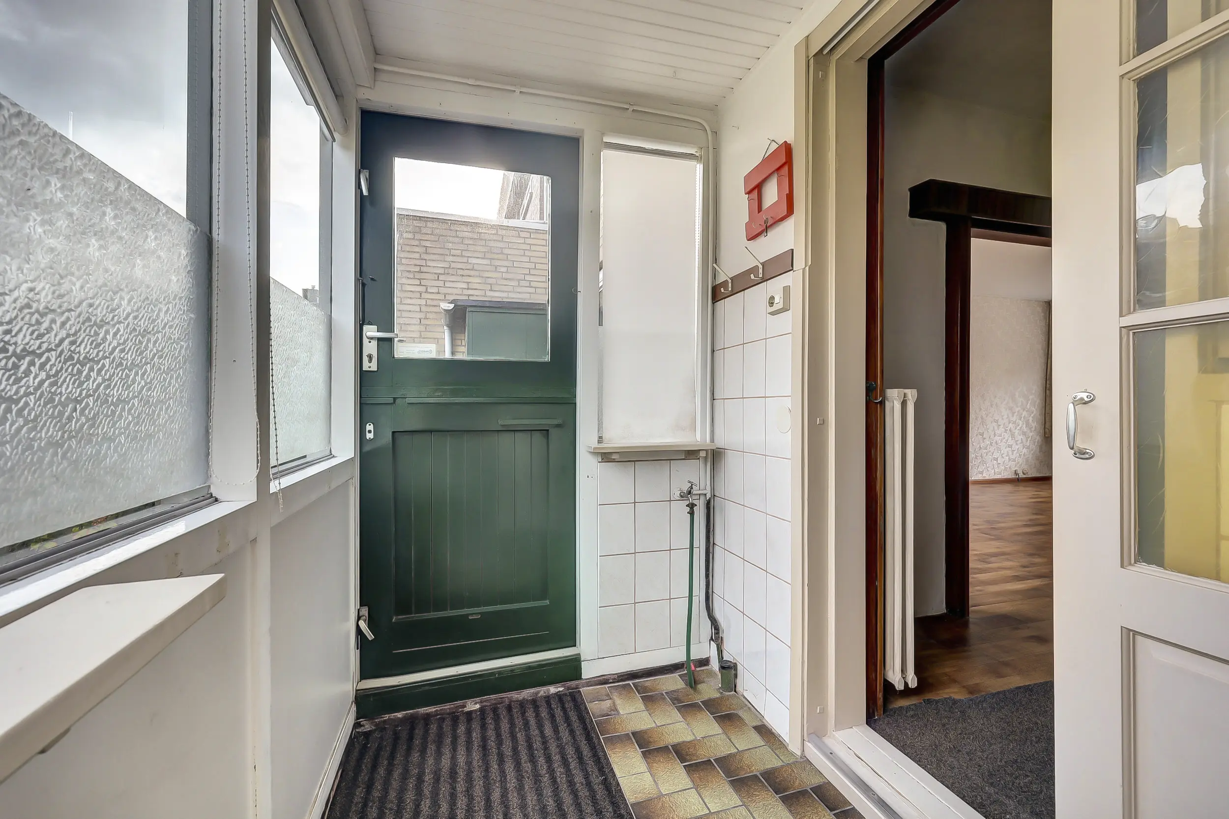 Hal/entree met vinyl vloerafwerking, toiletruimte en de meterkast. Toegang naar de doorzonkamer met aansluitend de open keuken in een eenvoudige rechte wandopstelling. Via een schuifdeur komt u in de aanbouw/klompenhok met de aansluiting voor de wasmachine en deur naar de achtertuin.