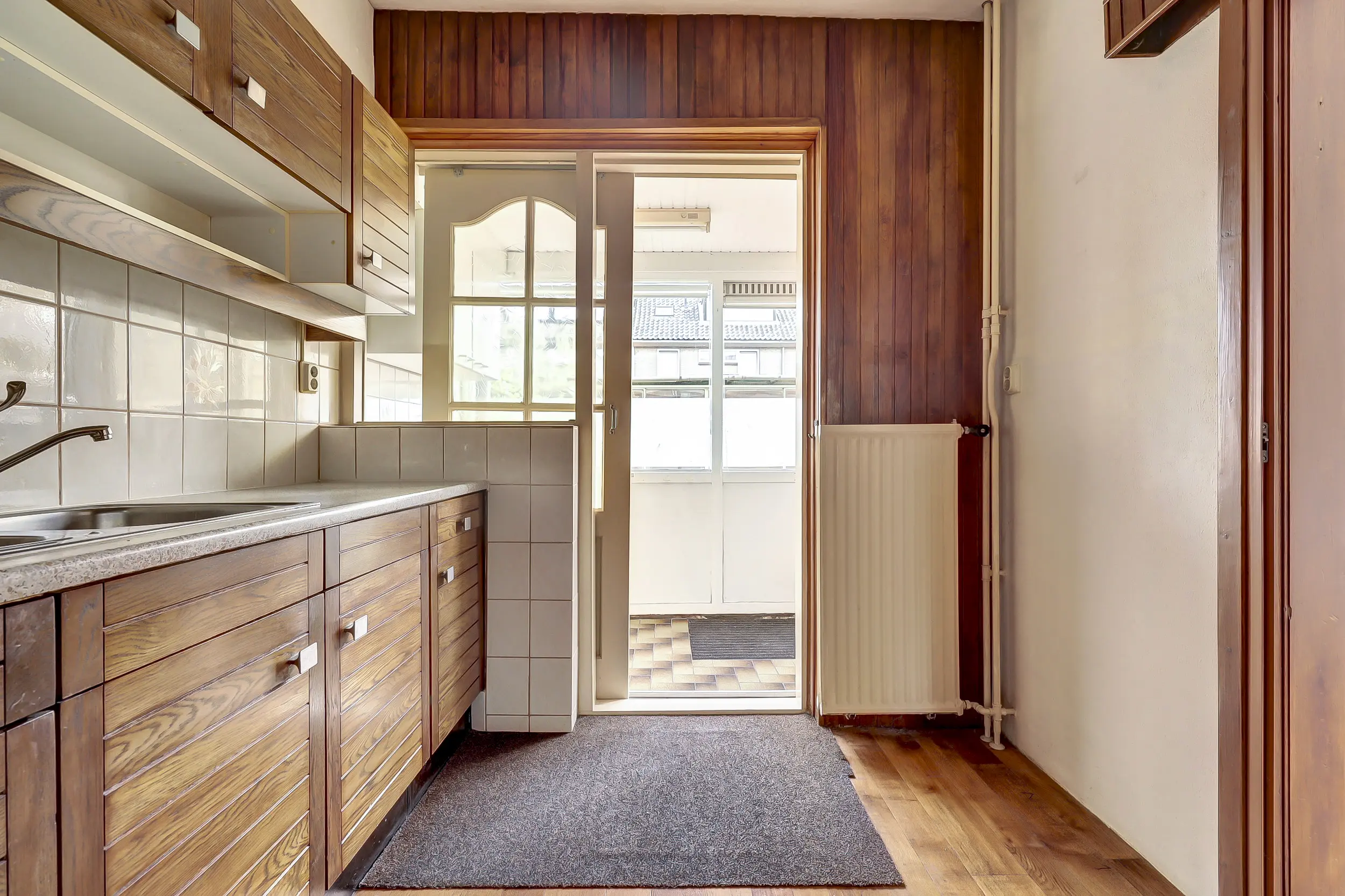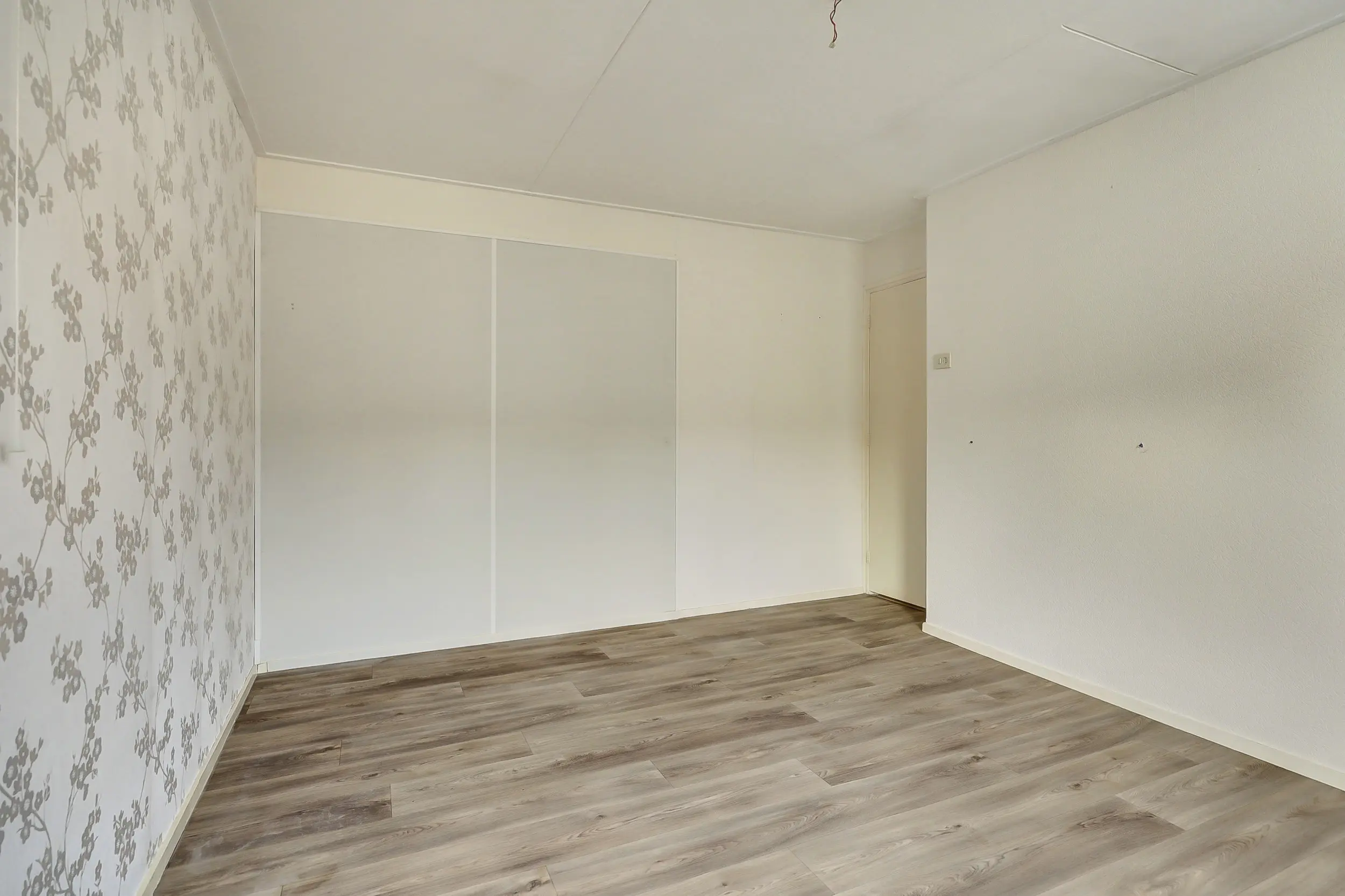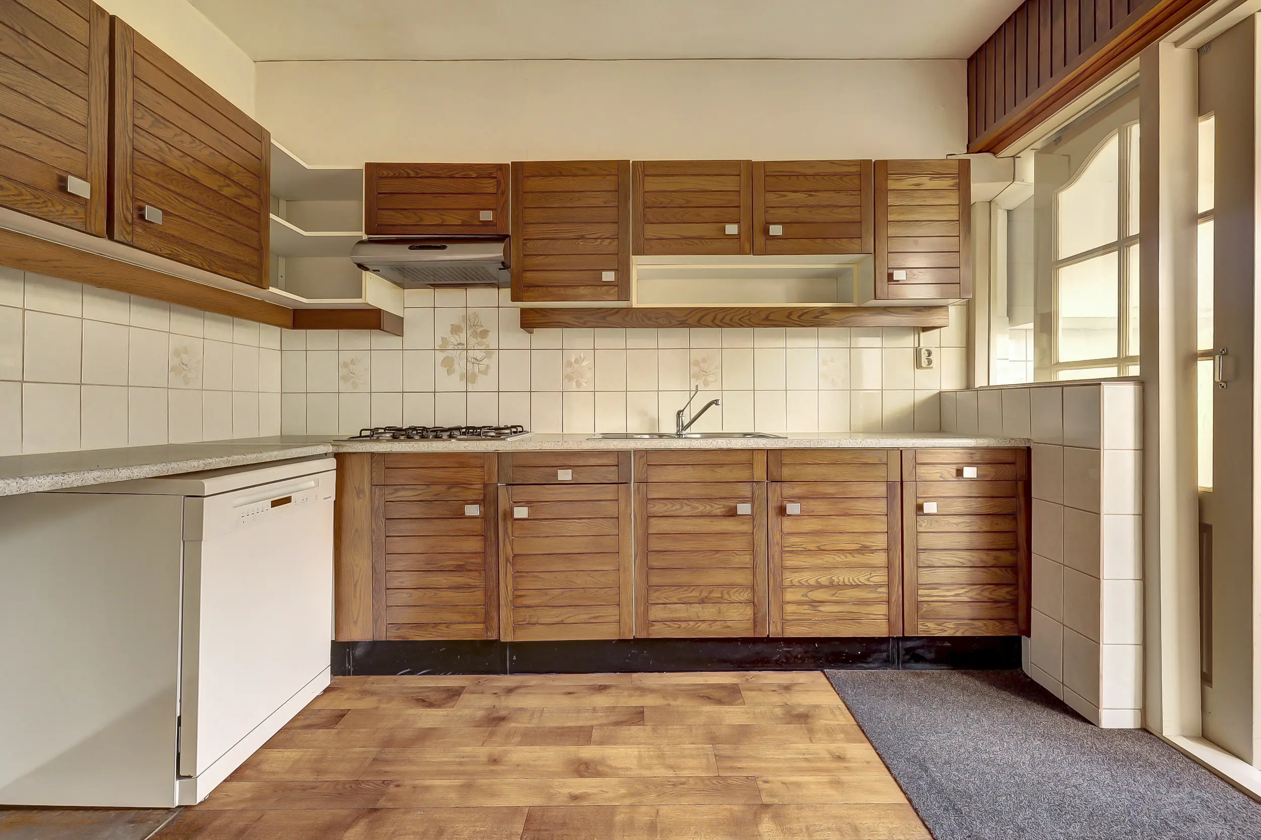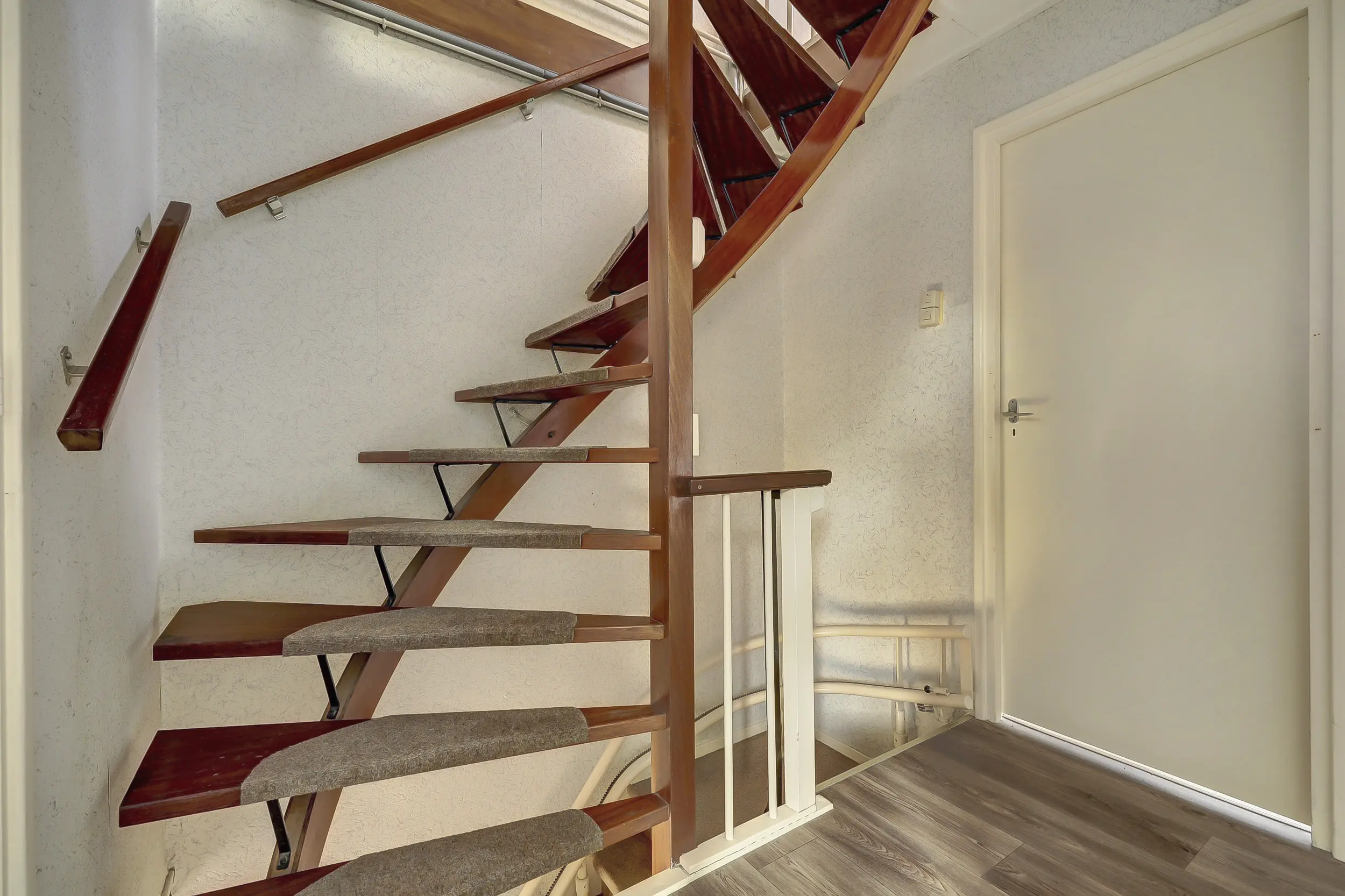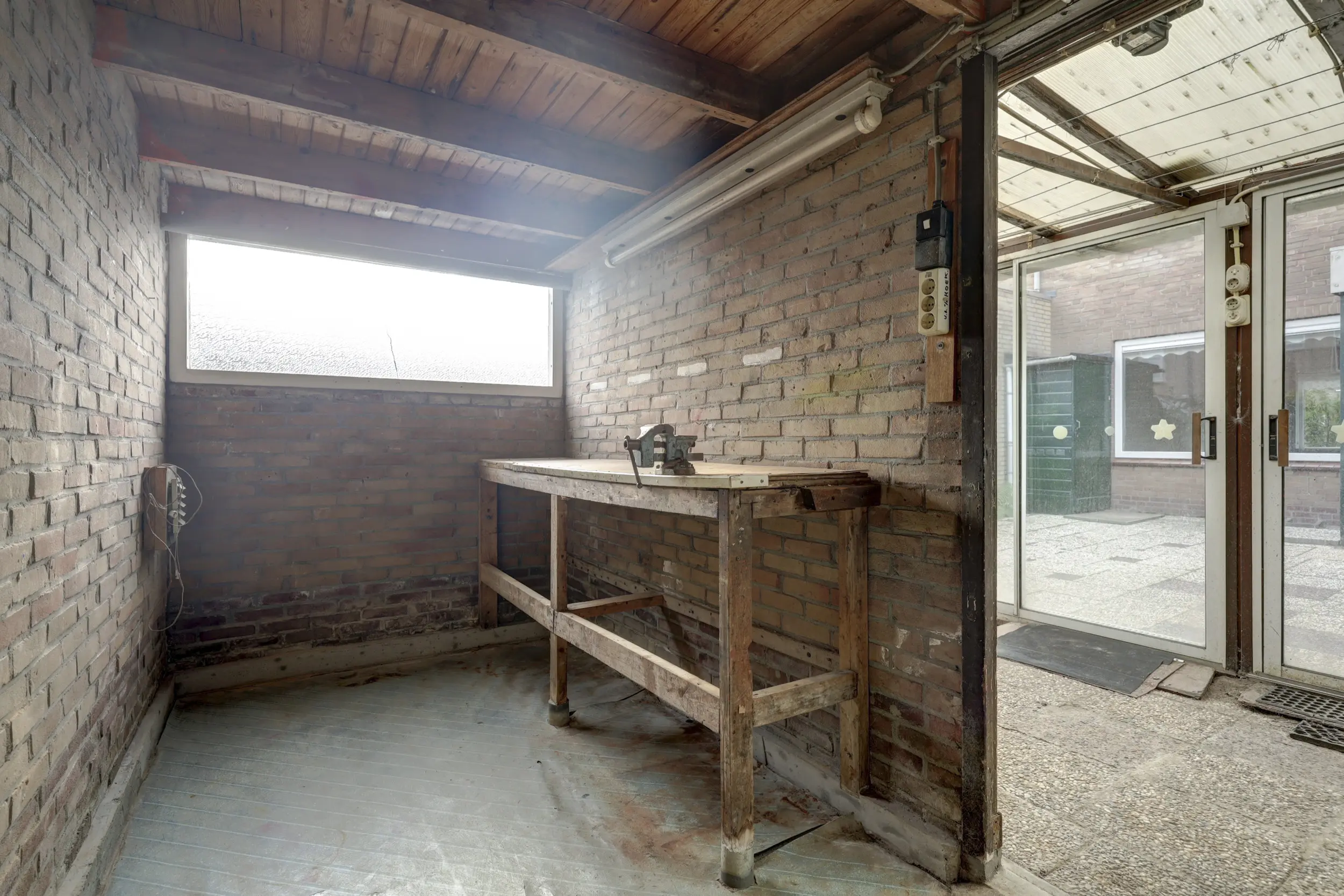 Hal/entree met vinyl vloerafwerking, toiletruimte en de meterkast. Toegang naar de doorzonkamer met aansluitend de open keuken in een eenvoudige rechte wandopstelling. Via een schuifdeur komt u in de aanbouw/klompenhok met de aansluiting voor de wasmachine en deur naar de achtertuin.