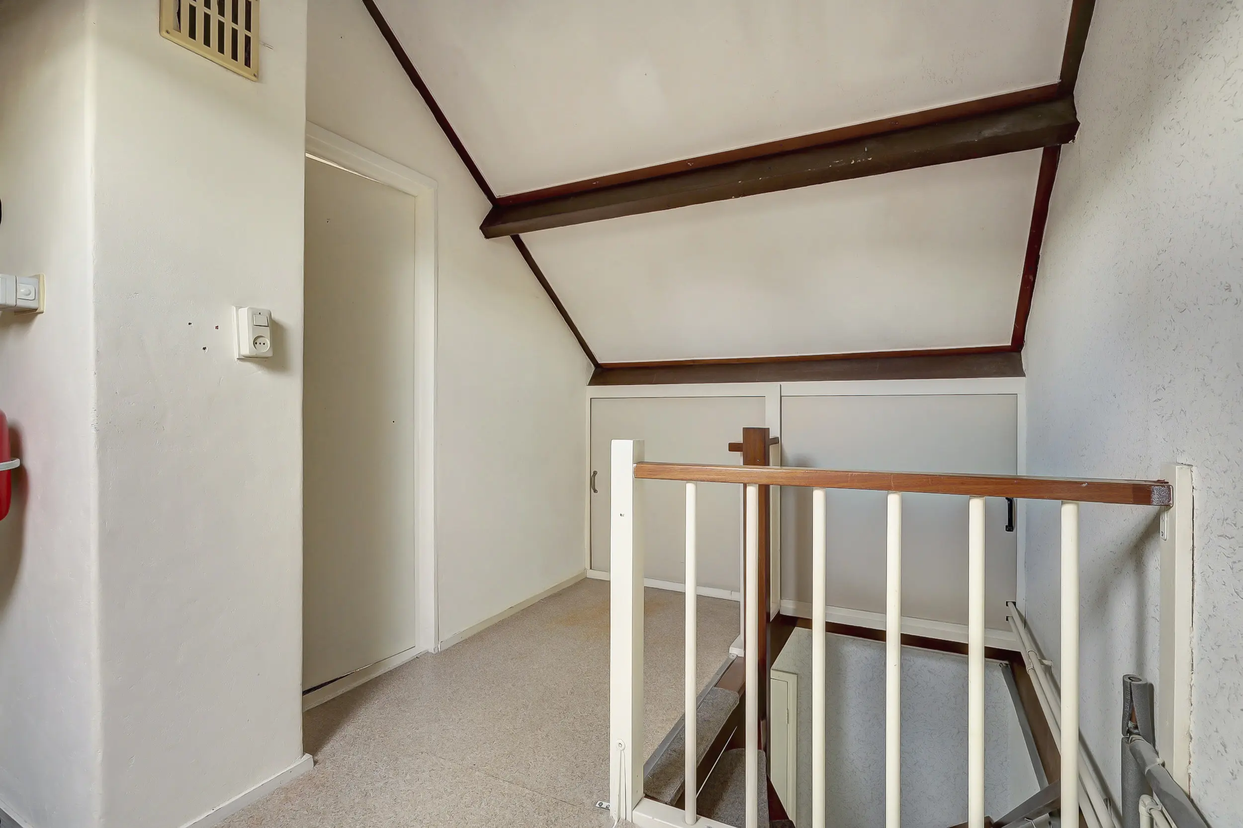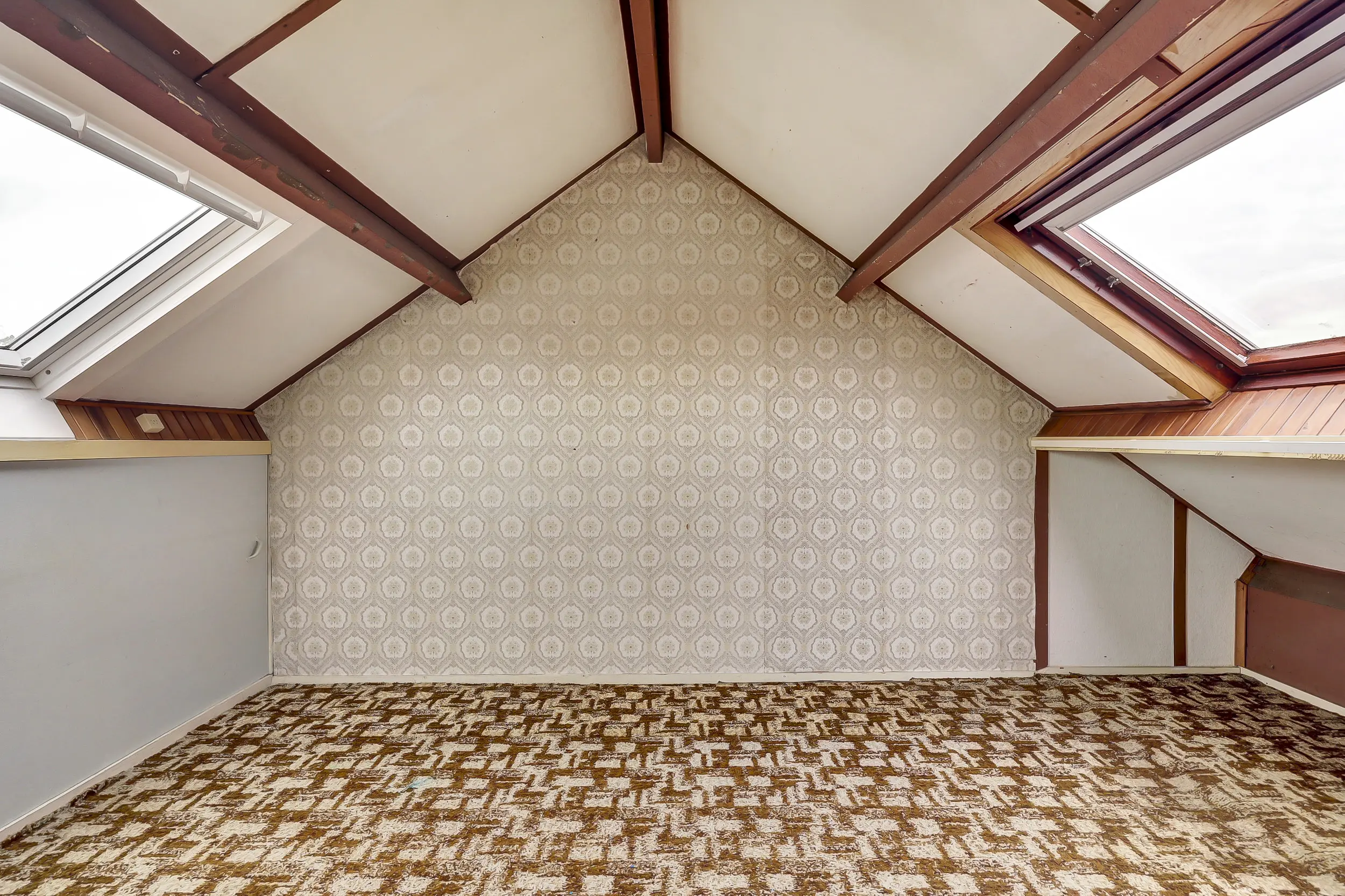 Overloopruimte met vinyl vloerafwerking (gehele verdieping), knieschotberging, de opstelling van de cv combi ketel en Velux kantelraam. Toegang naar de ruime lichte zolder(slaap)kamer met twee Velux kantelramen.