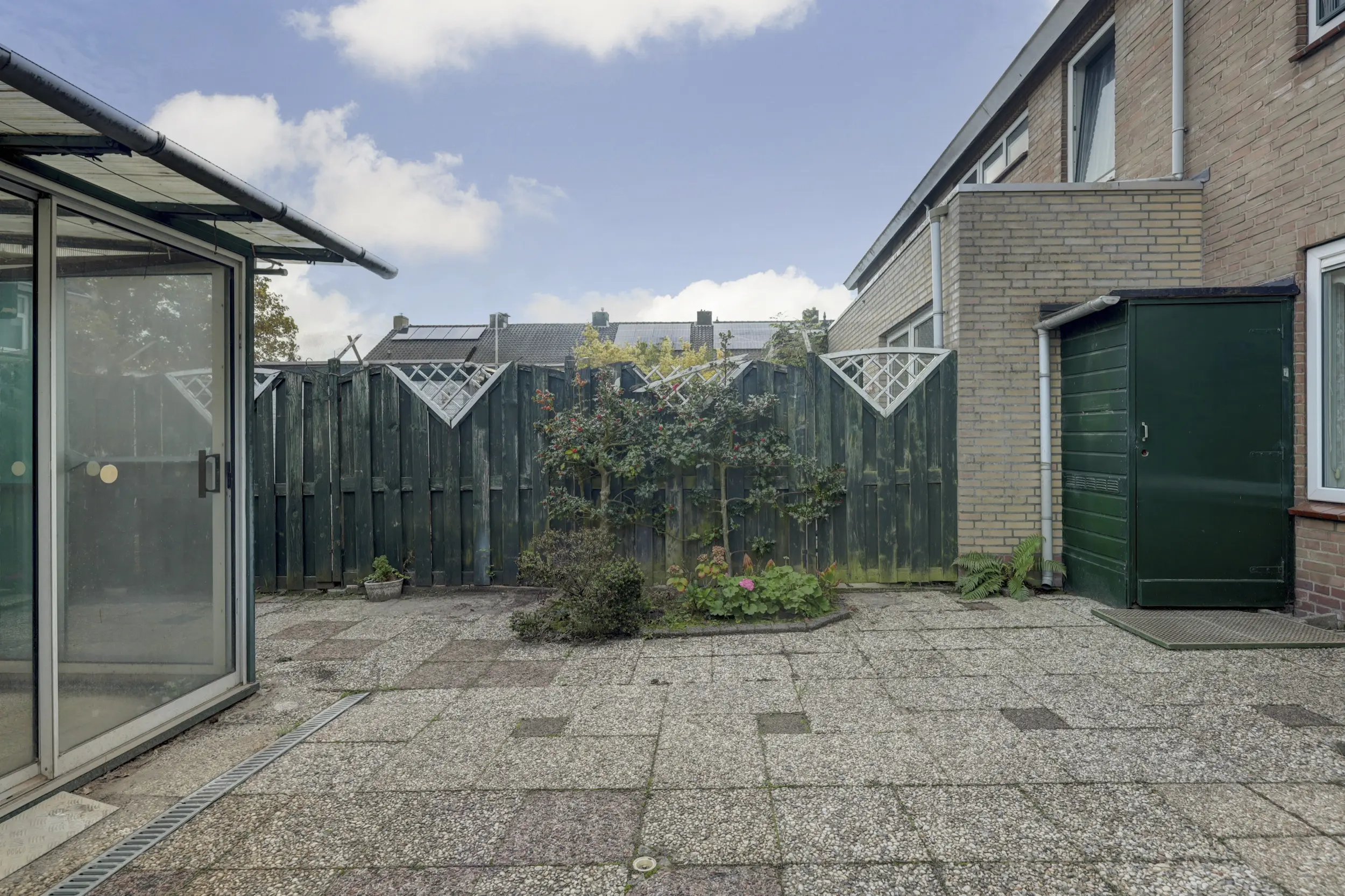 Achtertuin met achterom, stenen berging voorzien elektra en aangebouwde kas.