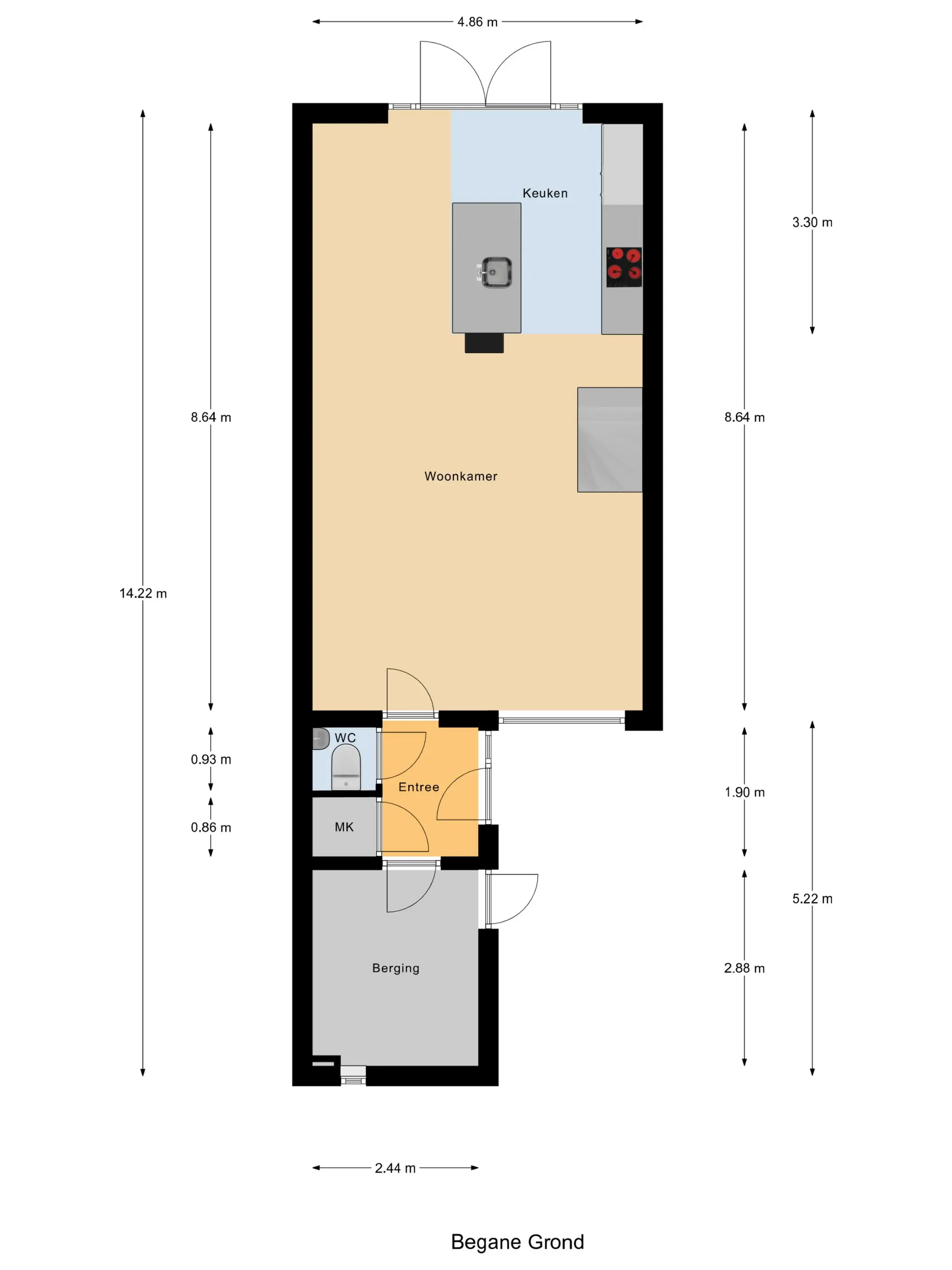 Keuken: 3,30 x 4,86m.