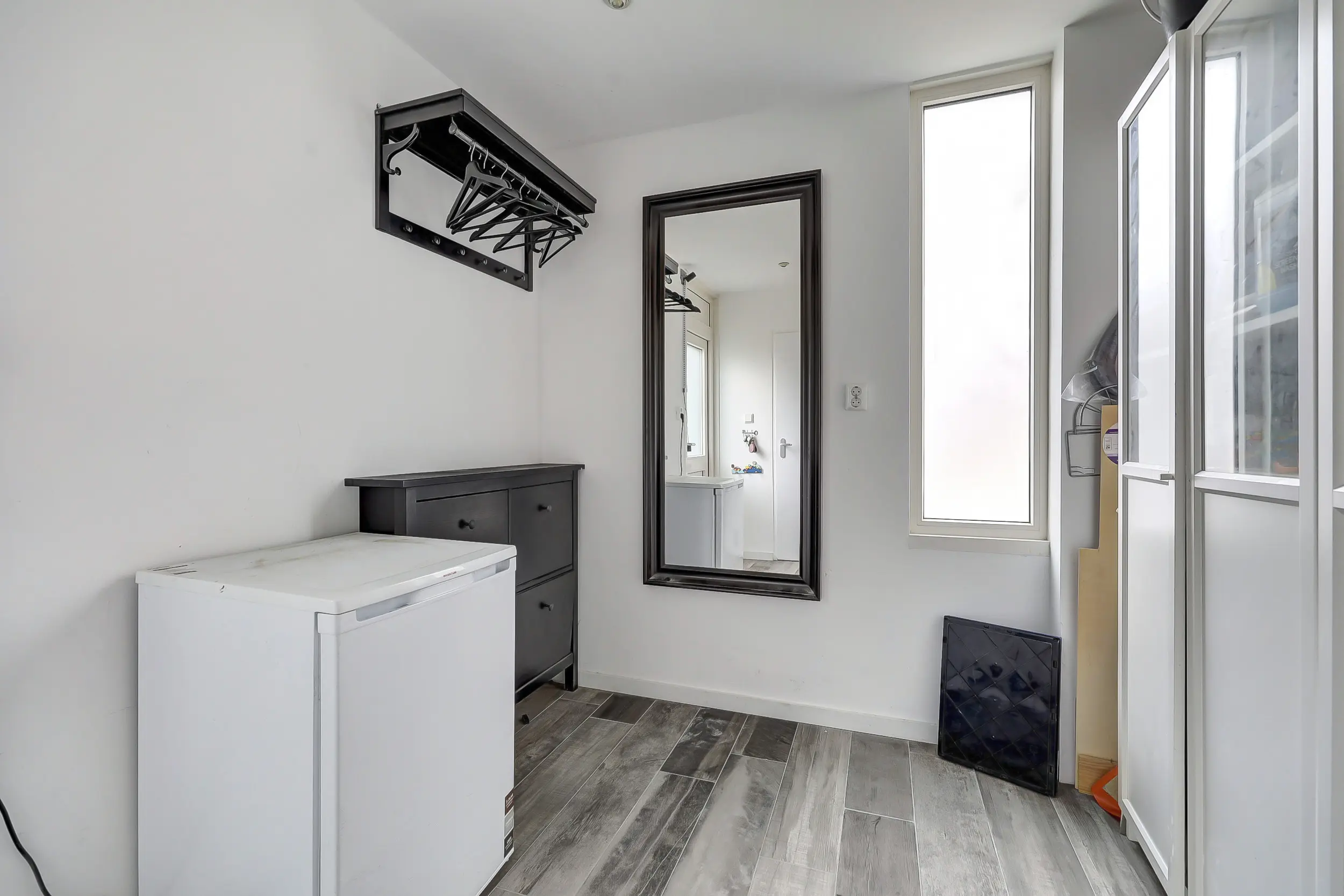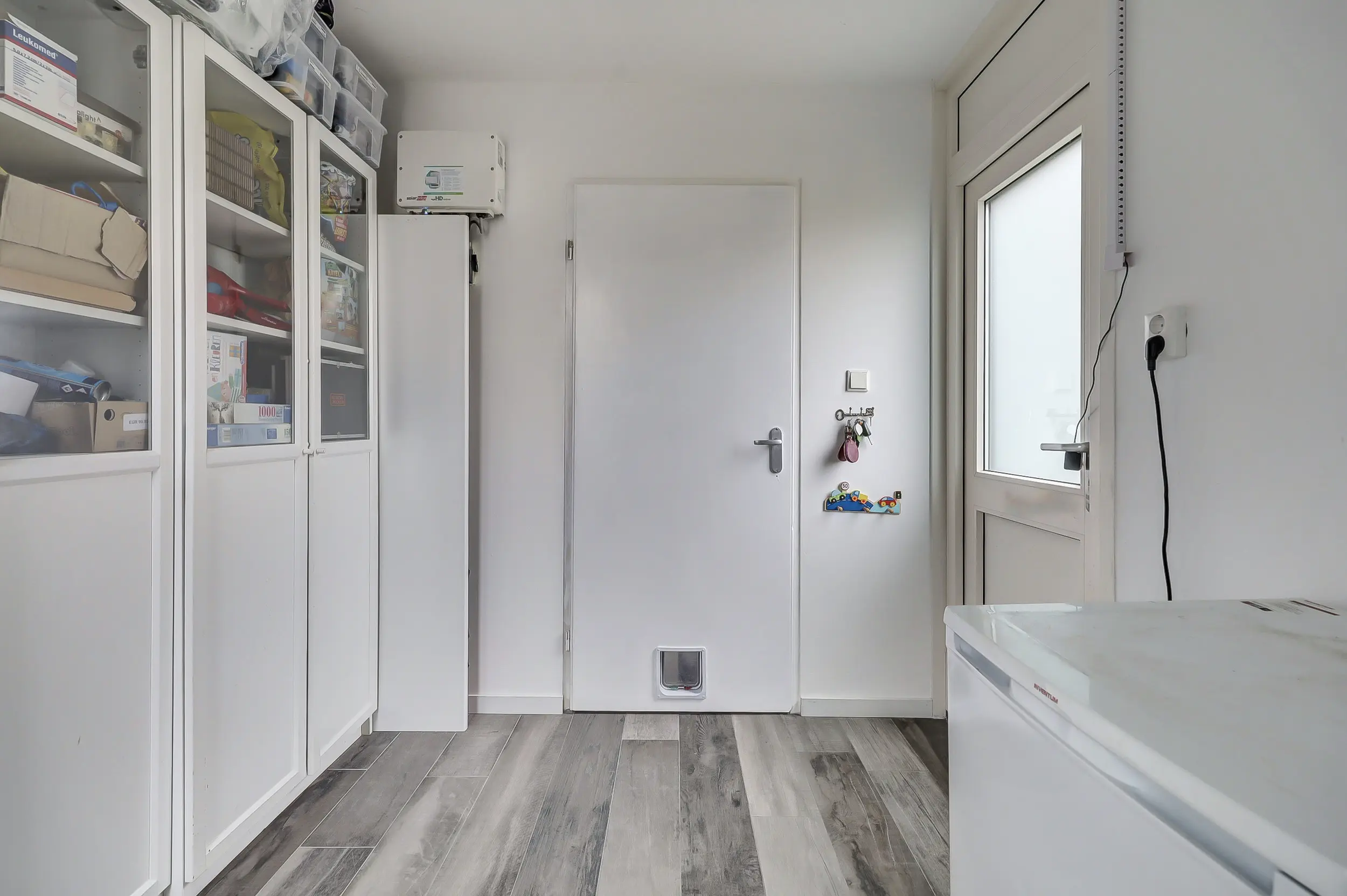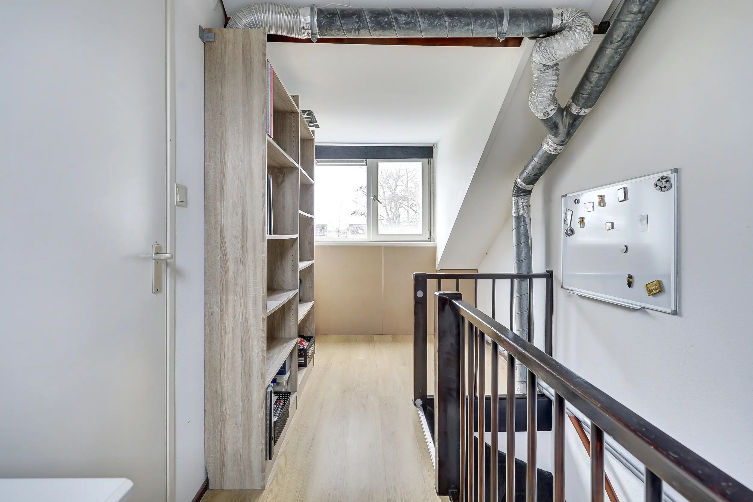 Overloopruimte met een laminaat vloerafwerking (gehele verdieping), de opstelling van de cv combiketel (lease) en de unit van de centrale afzuiging.Tevens is hier ook een aansluiting voor de wasmachine en droger. Toegang naar de slaapkamer met dakkapel en vaste kasten.