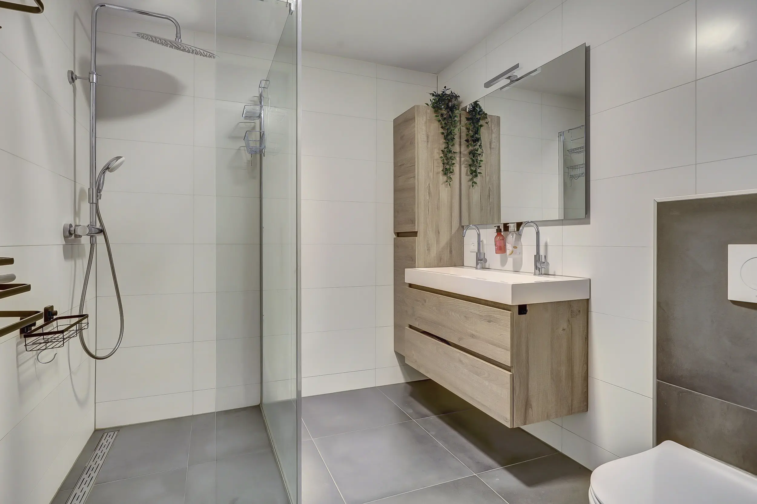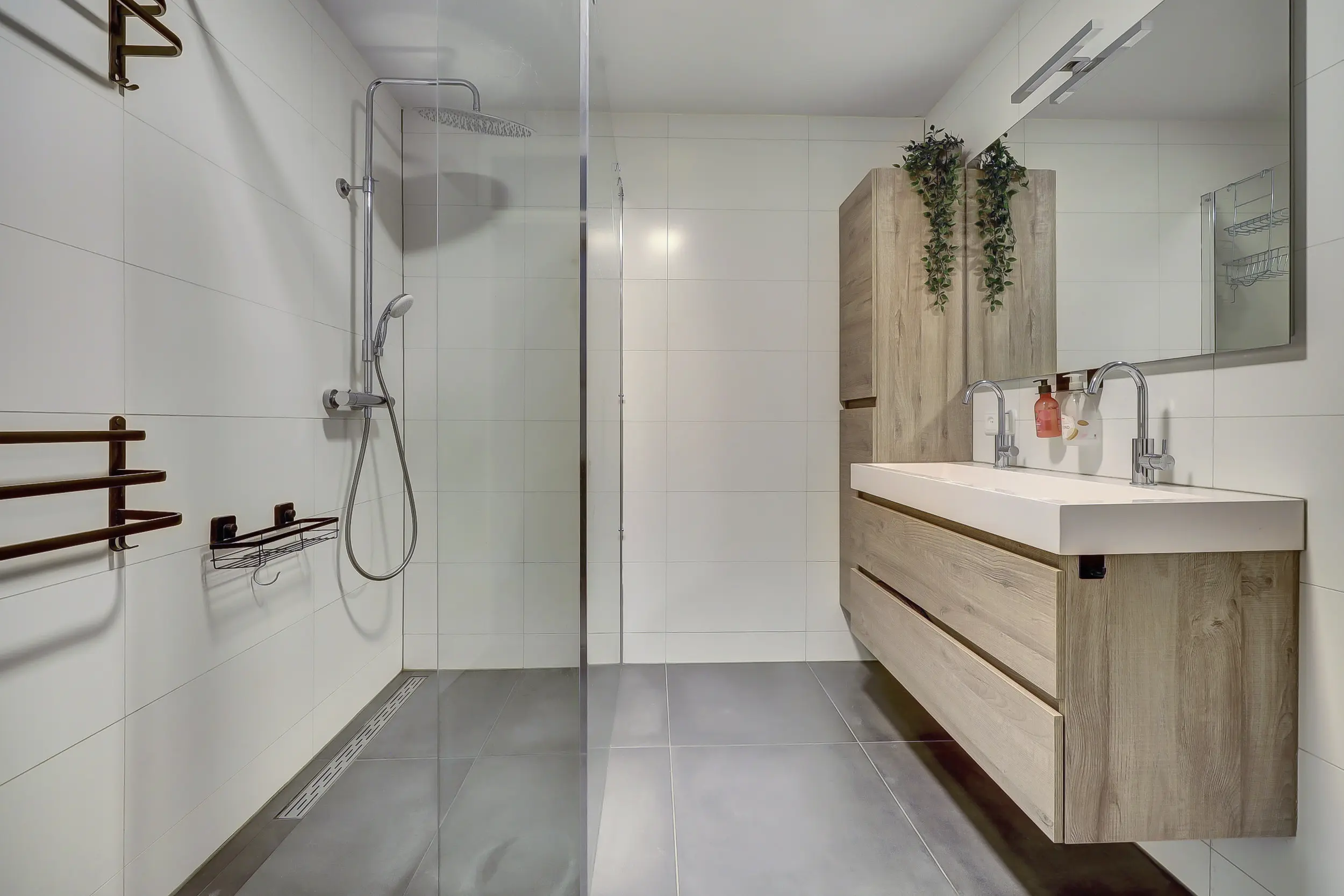 Overloopruimte met een laminaat vloerafwerking (gehele verdieping) en trapopgang naar de tweede verdieping. Toegang naar de twee ruime slaapkamers, de slaapkamer aan de achterzijde is voorzien van een (elektrisch) rolluik. De eveneens ruime badkamer is volledig betegeld en beschikt over een badkamermeubel met dubbele kraan, wandcloset, inloopdouche met regen,- en handdouche, mechanische ventilatie en elektrische vloerverwarming.